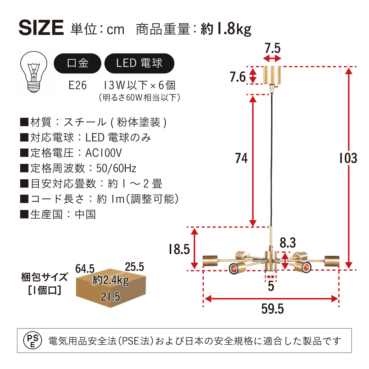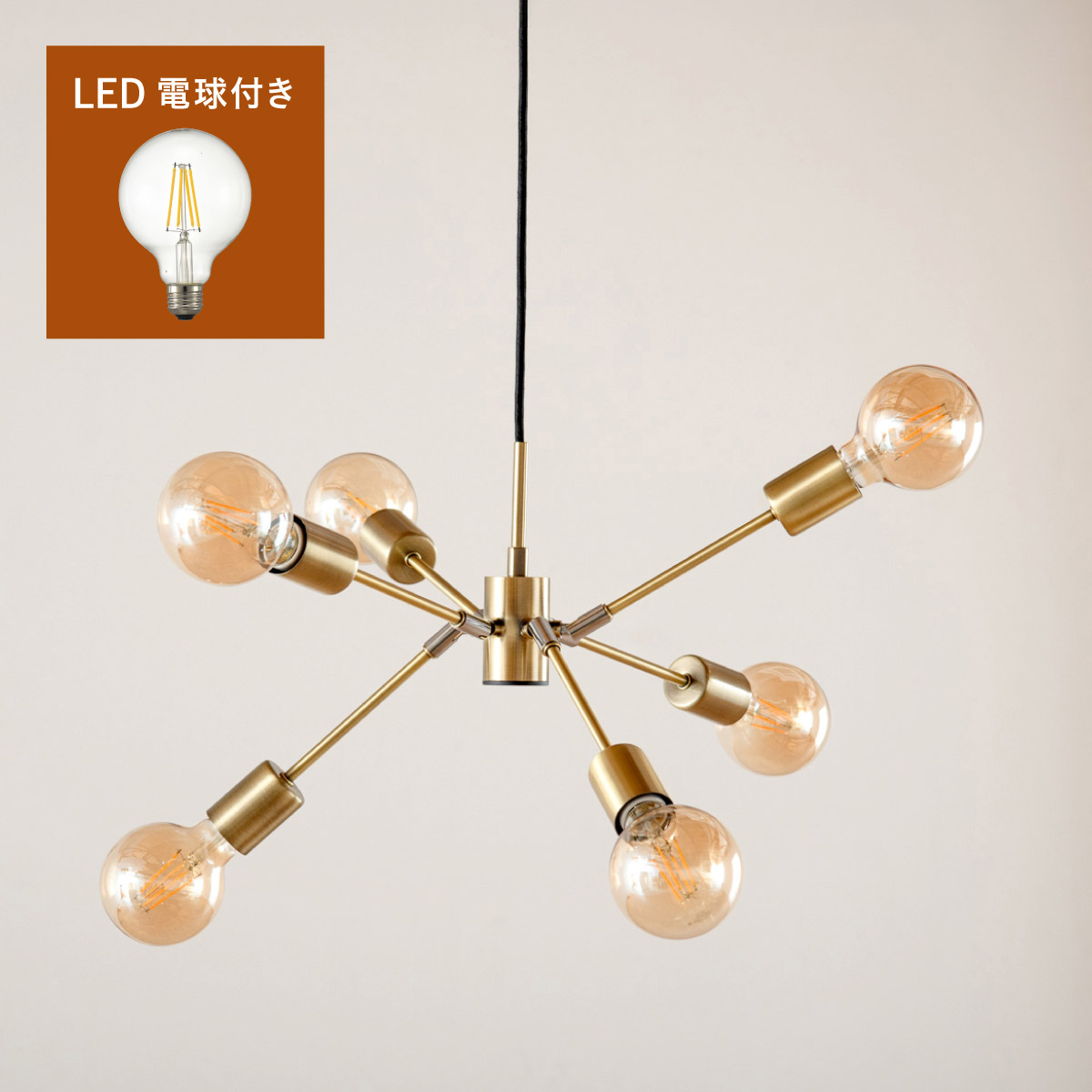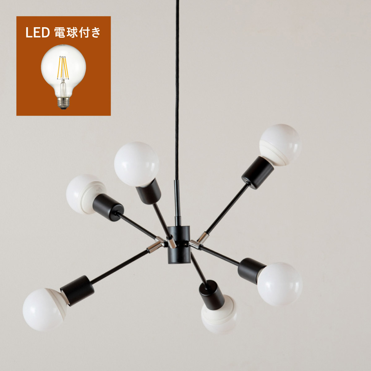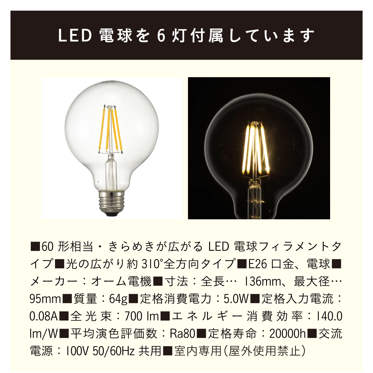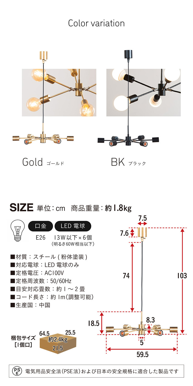 | 材質・素材 | 本体:スチール(粉体塗装) 対応電球:LED電球のみ(E26/13W以下x6個) 定格電圧:AC100V 定格周波数:50/60Hz 目安対応畳数:約1~2畳 コードの長さ:調節可能 〇電球 定格消費電力:5.0W 定格入力電流:0.08A 全光束:700lm エネルギー消費効率:140.0lm/W 平均演色評価数:Ra80 設計寿命:20000h |