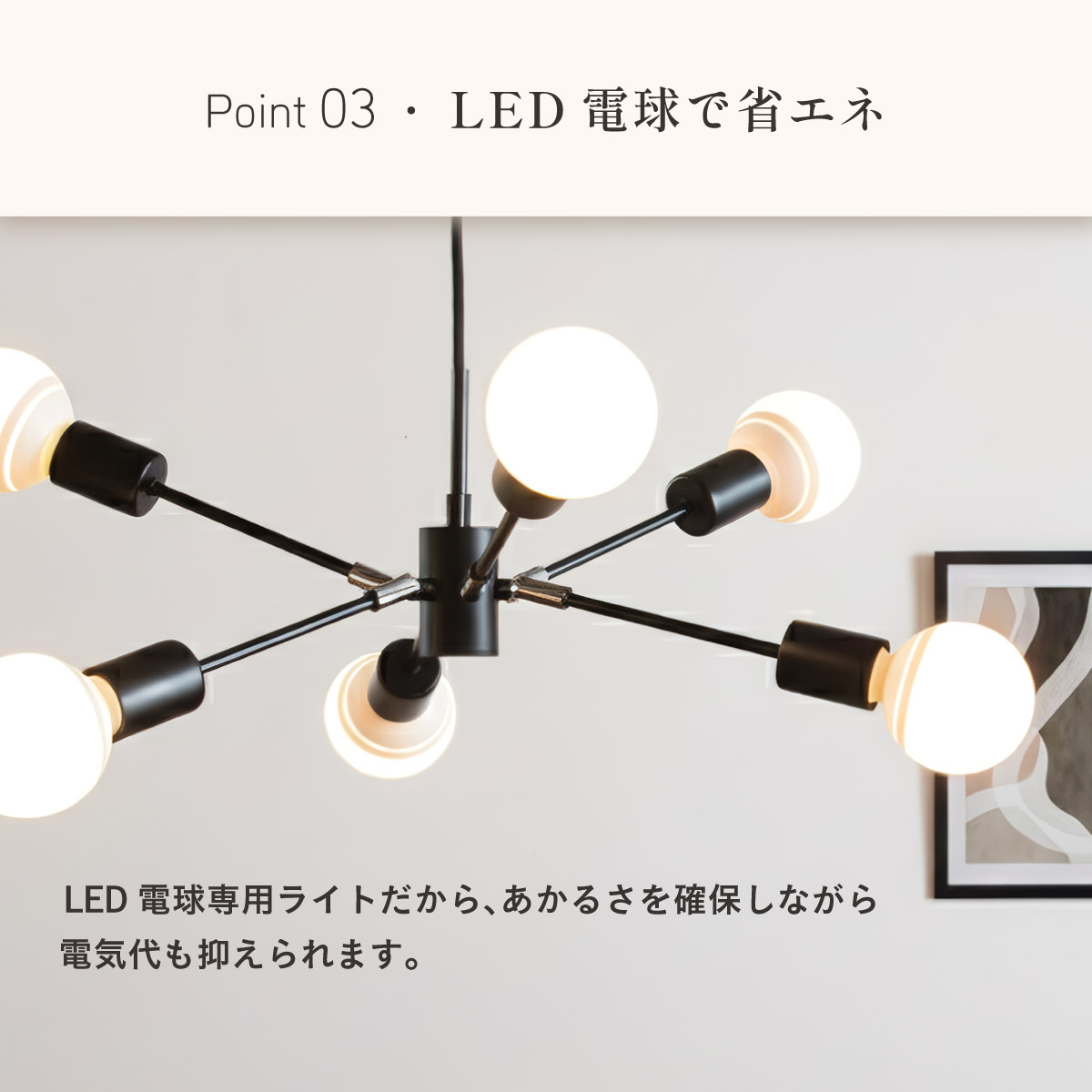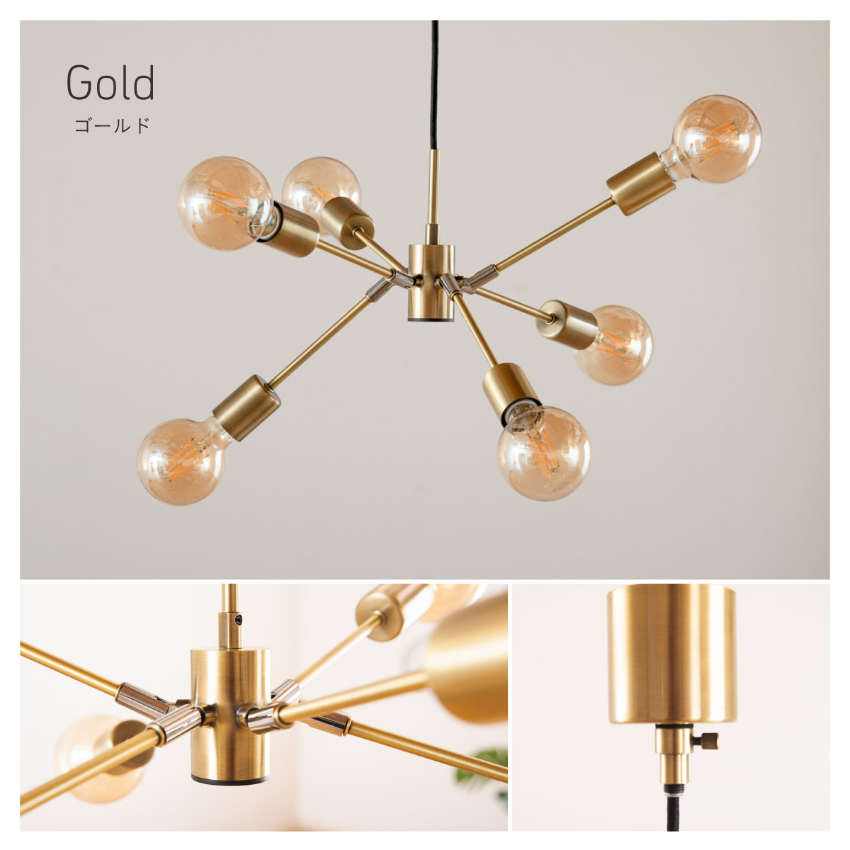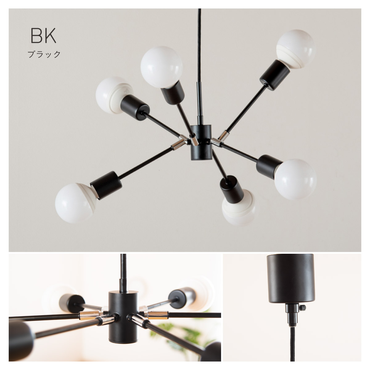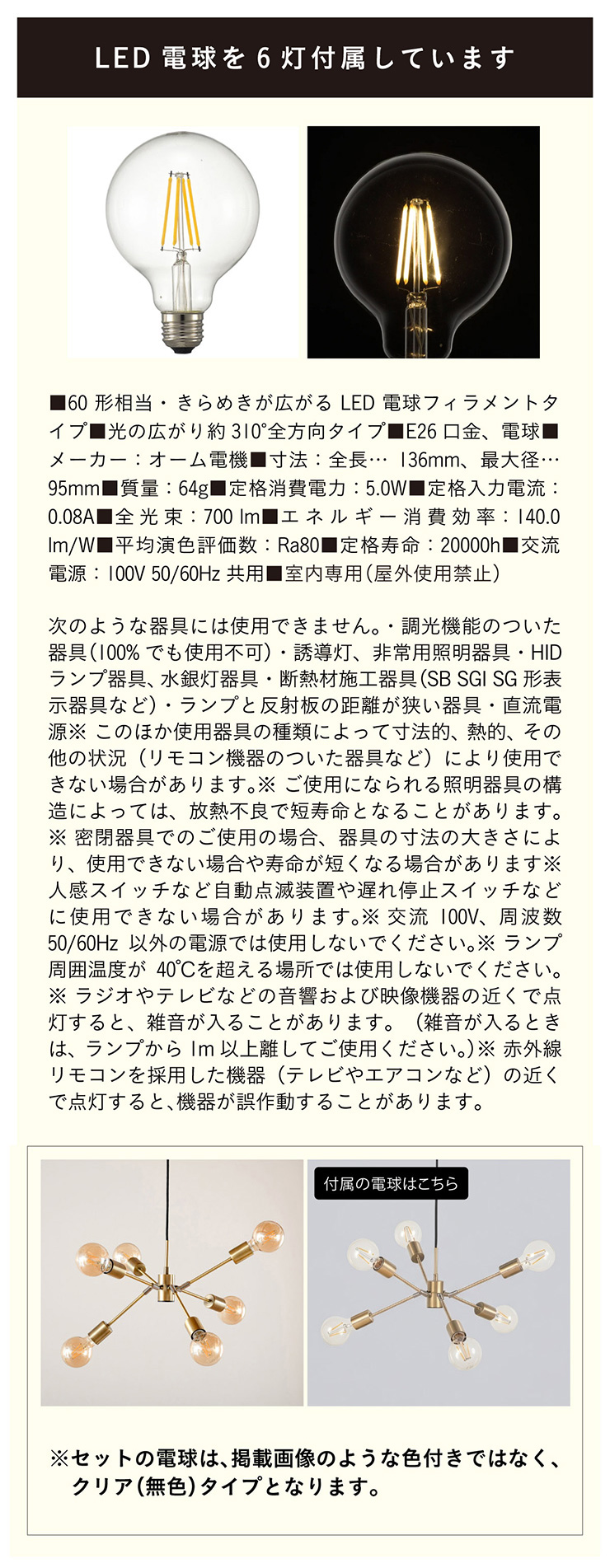 | 材質・素材 | 本体:スチール(粉体塗装) 対応電球:LED電球のみ(E26/13W以下x6個) 定格電圧:AC100V 定格周波数:50/60Hz 目安対応畳数:約1~2畳 コードの長さ:調節可能 〇電球 定格消費電力:5.0W 定格入力電流:0.08A 全光束:700lm エネルギー消費効率:140.0lm/W 平均演色評価数:Ra80 設計寿命:20000h |