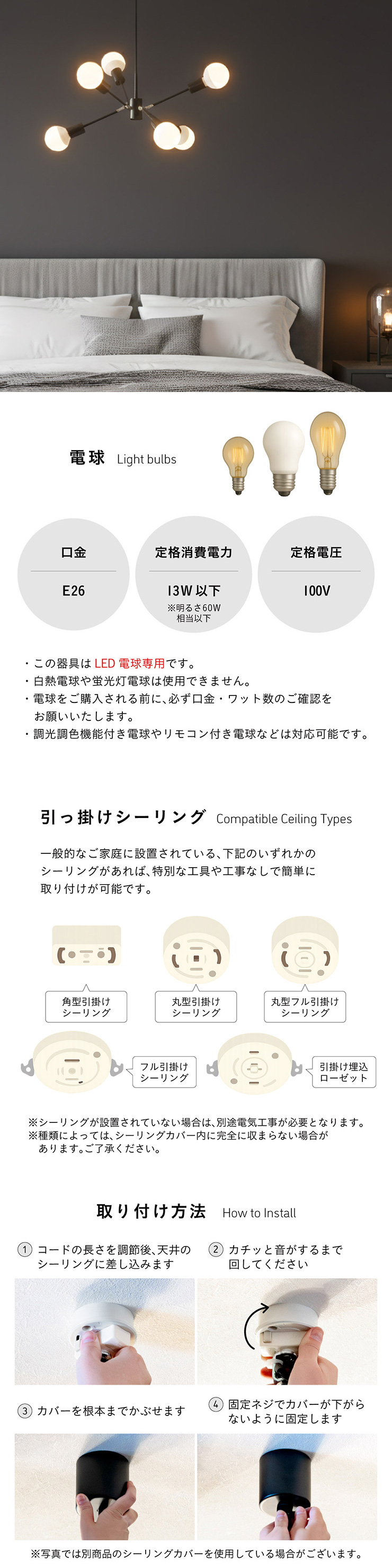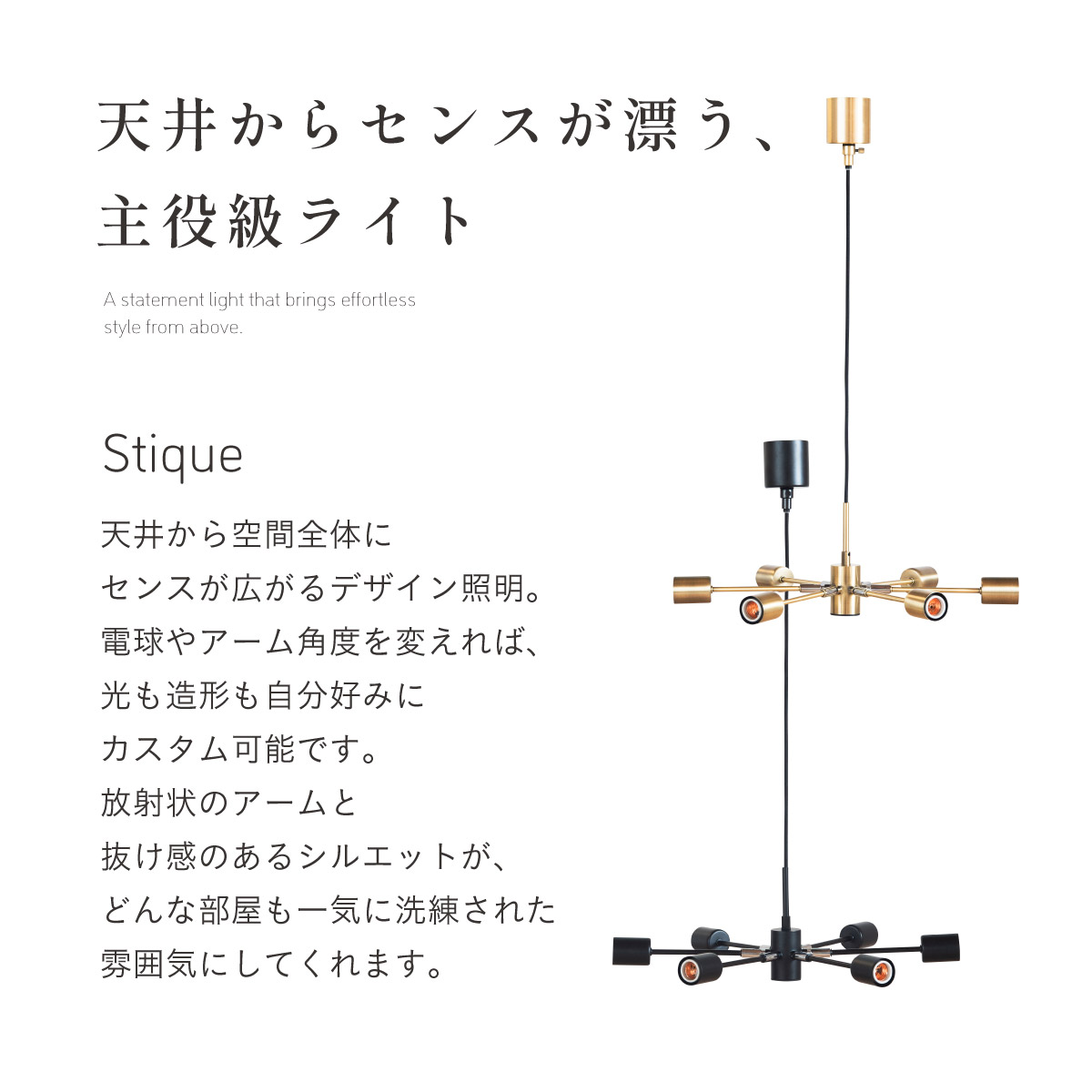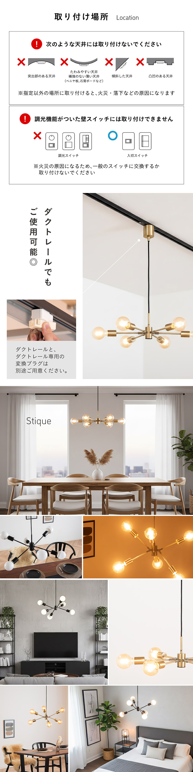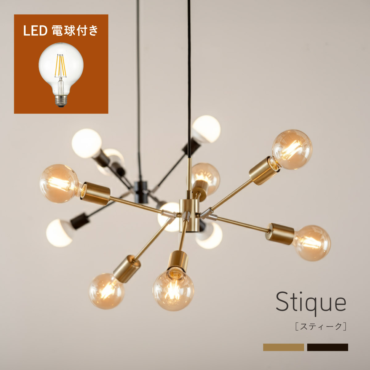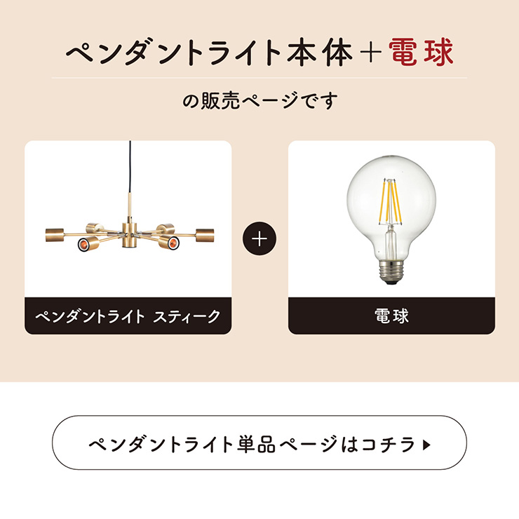 | LED電球専用 ペンダントライト Stique(スティーク) 電球セット 天井からセンスが漂う、主役級ライト 天井から空間全体にセンスが広がるデザイン照明。電球やアーム角度を変えれば、光も造形も自分好みにカスタム可能です。 放射状のアームと抜け感のあるシルエットが、どんな部屋も一気に洗練された雰囲気にしてくれます。 ■アームの角度を変えて“自分だけのデザイン”に 全部水平にしてミニマルな印象にしたり、互い違いにして立体感を出したり、アームを調整して好きな形にデザインが可能です。 ■コードの長さを調節可能 コード長さを自由に調節できるから、天井の高さに合わせてベストな配置が可能 ■LED電球で省エネ LED電球専用ライトだから、あかるさを確保しながら電気代も抑えられます。 ■飾るだけで海外インテリア風に 洗練されたフォルムと立体的なデザインが、いつもの空間を一瞬でドラマチックに変えてくれます。 ■電球 ・口金:E26 ・定格消費電力:13W以下(※明るさ60W相当以下) ・定格電圧:100V ・この器具はLED電球専用です。 ・白熱電球や蛍光灯電球は使用できません。 ・電球は付属しておりません。 ・電球をご購入される前に、必ずロ金・ワット数のご確認をお願いいたします。 ・調光調色機能付き電球やリモコン付き電球などは対応可能です。 ■引掛けシーリング 一般的なご家庭に設置されている、下記のいずれかのシーリングがあれば、特別な工具や工事なしで簡単に取り付けが可能です。 ・角型引掛けシーリング ・丸型引掛けシーリング ・丸型フル引掛けシーリング ・フル引掛けシーリング ・引掛け埋込ローゼット ※シーリングが設置されていない場合は、別途電気工事が必要になります。 ※種類によっては、シーリングカバー内に完全に収まらない場合があります。ご了承ください。 ■取り付け場所 次のような天井には取り付けないでください。 ・突出部のある天井 ・たわみやすい天井、補強のない薄い天井(ベニヤ板、石膏ボードなど) ・傾斜した天井 ・凸凹のある天井 ※指定以外の場所に取り付けると、火災・落下などの原因になります。 調光機能がついた壁スイッチには取り付けできません。 ※火災の原因になるため、一般のスイッチに交換する取り付けないでください。 ■ダクトレールでもご使用可能〇 ダクトレールとダクトレール専用の変換プラグは別途ご用意ください。 ■LED電球を6灯付属しています ・60形相当 ・きらめきが広がるLED電球フィラメントタイプ ・光の広がり約310°全方向タイプ ・E26口金、電球色 ・メーカー:オーム電機 ※電気用品安全法(PSE法)および日本の安全規格に適合した製品です。 ※屋内専用(屋外使用禁止) ※交流100V 50/60Hz 共有 ※次のような器具には使用できません。 調光機能のついた器具(100%点灯でも使用不可)・誘導灯、非常用照明器具・HIDランプ器具、水銀灯器具・断熱材施工器具1(SB・SGI・SG形表示器具など)・ランプと反射板の距離が狭い器具・直流電源 ※このほか使用器具の種類によって寸法的、熱的、その他の状況(リモコン機器のついた器具など)により使用できない場合があります。 ※ご使用になられる照明器具の構造によっては、放熱不良で短寿命となることがあります。 ※密閉器具でのご使用の場合、器具の寸法により、使用できない場合や寿命が短くなる場合があります。 ※人感スイッチなど自動点滅装置や遅れ停止スイッチなどに使用できない場合があります。 ※交流100V 周波数50/60Hz以外の電源では使用しないでください。 ※ランプ周囲温度が40℃を超える場所では使用しないでください。 ※ラジオやテレビなどの音響および映像機器の近くで点灯すると、雑音が入ることがあります。(雑音が入るときは、ランプから1m以上離してください。) ※赤外線リモコンを採用した機器(テレビやエアコンなど)の近くで点灯すると、機器が誤作動することがあります。 | |
