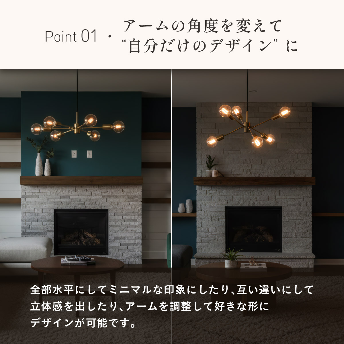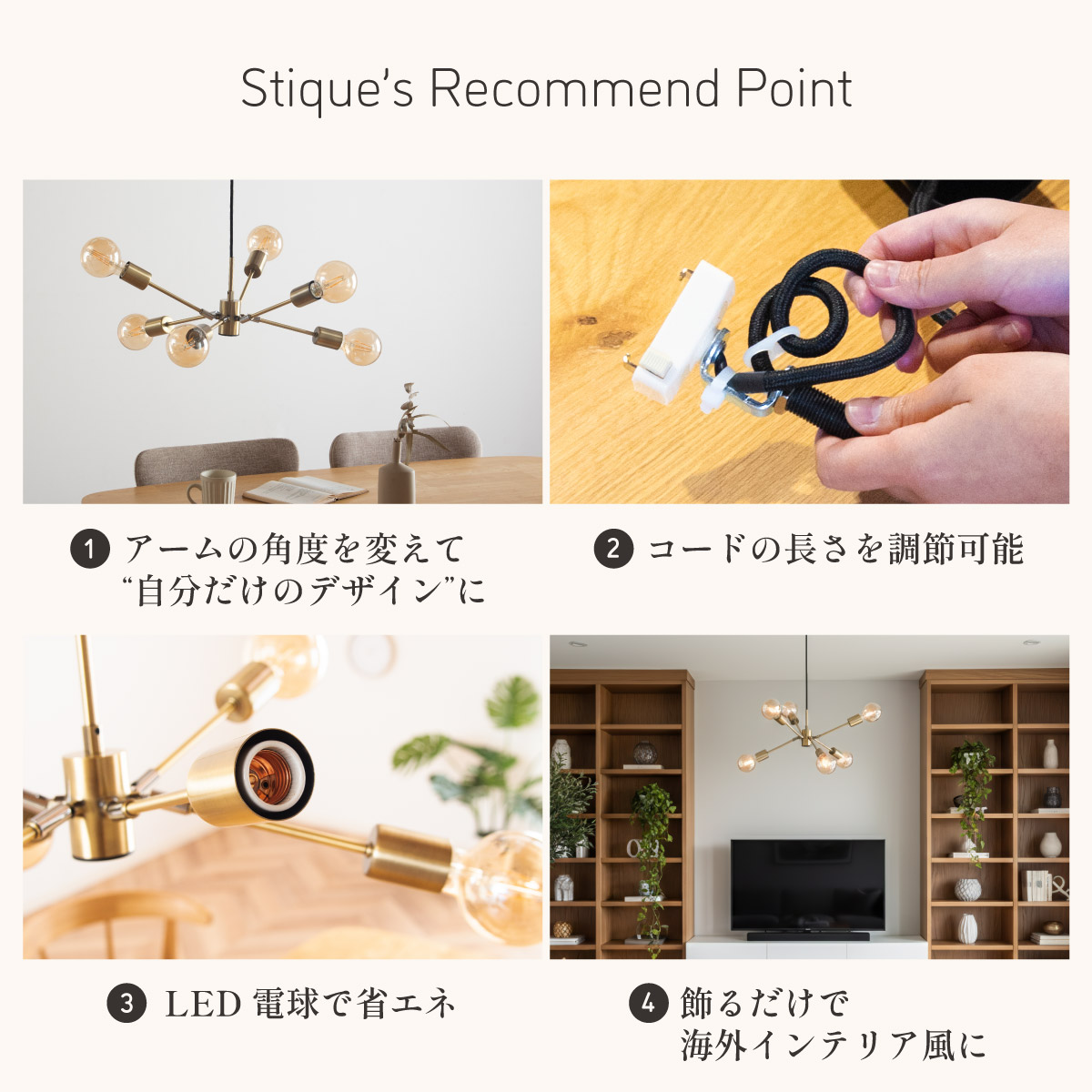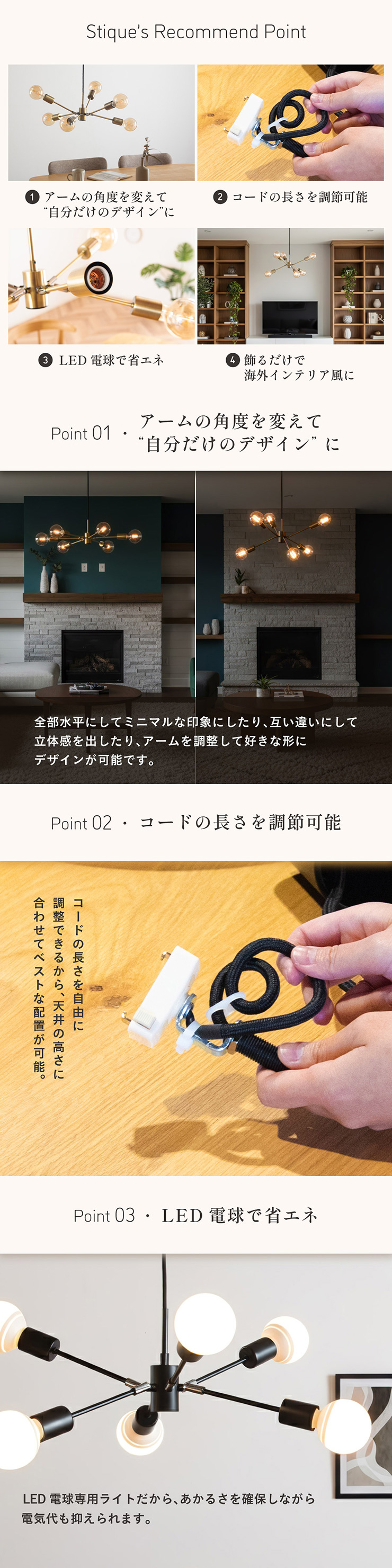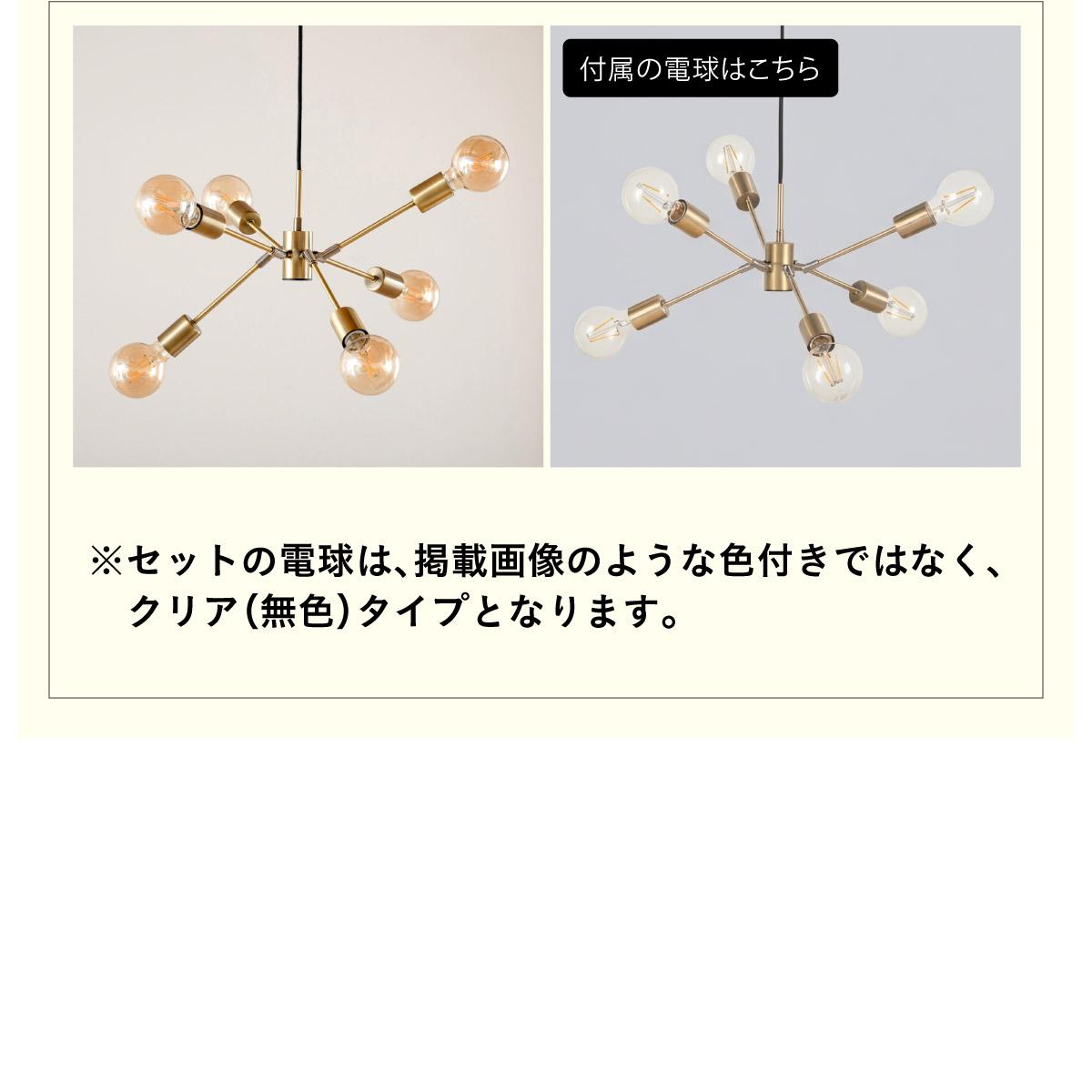 | LED電球専用 ペンダントライト Stique(スティーク) 電球セット 天井からセンスが漂う、主役級ライト 天井から空間全体にセンスが広がるデザイン照明。電球やアーム角度を変えれば、光も造形も自分好みにカスタム可能です。 放射状のアームと抜け感のあるシルエットが、どんな部屋も一気に洗練された雰囲気にしてくれます。 ■アームの角度を変えて“自分だけのデザイン”に 全部水平にしてミニマルな印象にしたり、互い違いにして立体感を出したり、アームを調整して好きな形にデザインが可能です。 ■コードの長さを調節可能 コード長さを自由に調節できるから、天井の高さに合わせてベストな配置が可能 ■LED電球で省エネ LED電球専用ライトだから、あかるさを確保しながら電気代も抑えられます。 ■飾るだけで海外インテリア風に 洗練されたフォルムと立体的なデザインが、いつもの空間を一瞬でドラマチックに変えてくれます。 ■電球 ・口金:E26 ・定格消費電力:13W以下(※明るさ60W相当以下) ・定格電圧:100V ・この器具はLED電球専用です。 ・白熱電球や蛍光灯電球は使用できません。 ・電球は付属しておりません。 ・電球をご購入される前に、必ずロ金・ワット数のご確認をお願いいたします。 ・調光調色機能付き電球やリモコン付き電球などは対応可能です。 ■引掛けシーリング 一般的なご家庭に設置されている、下記のいずれかのシーリングがあれば、特別な工具や工事なしで簡単に取り付けが可能です。 ・角型引掛けシーリング ・丸型引掛けシーリング ・丸型フル引掛けシーリング ・フル引掛けシーリング ・引掛け埋込ローゼット ※シーリングが設置されていない場合は、別途電気工事が必要になります。 ※種類によっては、シーリングカバー内に完全に収まらない場合があります。ご了承ください。 ■取り付け場所 次のような天井には取り付けないでください。 ・突出部のある天井 ・たわみやすい天井、補強のない薄い天井(ベニヤ板、石膏ボードなど) ・傾斜した天井 ・凸凹のある天井 ※指定以外の場所に取り付けると、火災・落下などの原因になります。 調光機能がついた壁スイッチには取り付けできません。 ※火災の原因になるため、一般のスイッチに交換する取り付けないでください。 ■ダクトレールでもご使用可能〇 ダクトレールとダクトレール専用の変換プラグは別途ご用意ください。 ■LED電球を6灯付属しています ・60形相当 ・きらめきが広がるLED電球フィラメントタイプ ・光の広がり約310°全方向タイプ ・E26口金、電球色 ・メーカー:オーム電機 ※電気用品安全法(PSE法)および日本の安全規格に適合した製品です。 ※屋内専用(屋外使用禁止) ※交流100V 50/60Hz 共有 ※次のような器具には使用できません。 調光機能のついた器具(100%点灯でも使用不可)・誘導灯、非常用照明器具・HIDランプ器具、水銀灯器具・断熱材施工器具1(SB・SGI・SG形表示器具など)・ランプと反射板の距離が狭い器具・直流電源 ※このほか使用器具の種類によって寸法的、熱的、その他の状況(リモコン機器のついた器具など)により使用できない場合があります。 ※ご使用になられる照明器具の構造によっては、放熱不良で短寿命となることがあります。 ※密閉器具でのご使用の場合、器具の寸法により、使用できない場合や寿命が短くなる場合があります。 ※人感スイッチなど自動点滅装置や遅れ停止スイッチなどに使用できない場合があります。 ※交流100V 周波数50/60Hz以外の電源では使用しないでください。 ※ランプ周囲温度が40℃を超える場所では使用しないでください。 ※ラジオやテレビなどの音響および映像機器の近くで点灯すると、雑音が入ることがあります。(雑音が入るときは、ランプから1m以上離してください。) ※赤外線リモコンを採用した機器(テレビやエアコンなど)の近くで点灯すると、機器が誤作動することがあります。 | |