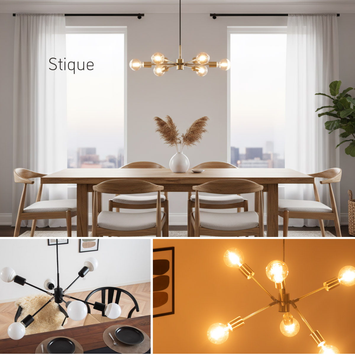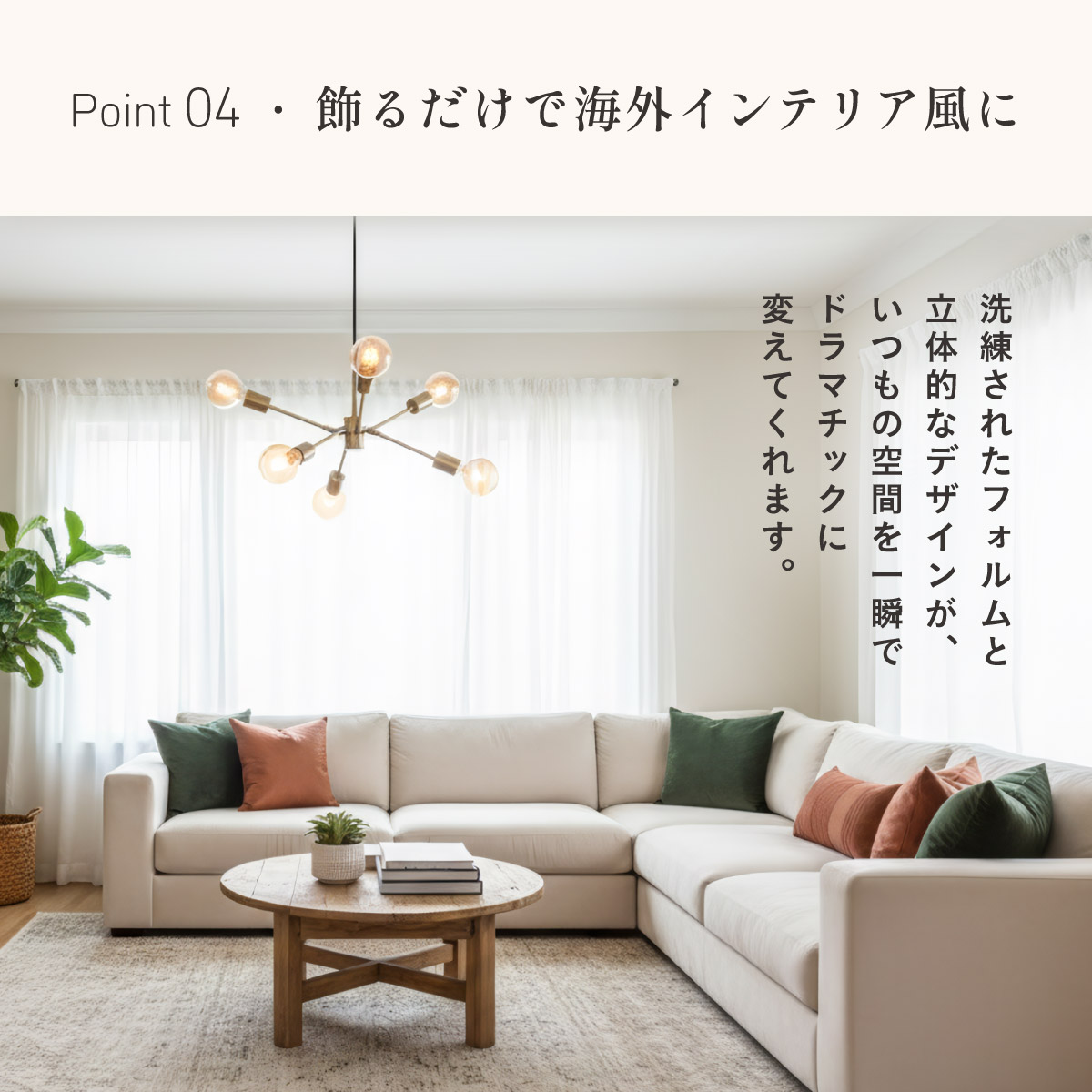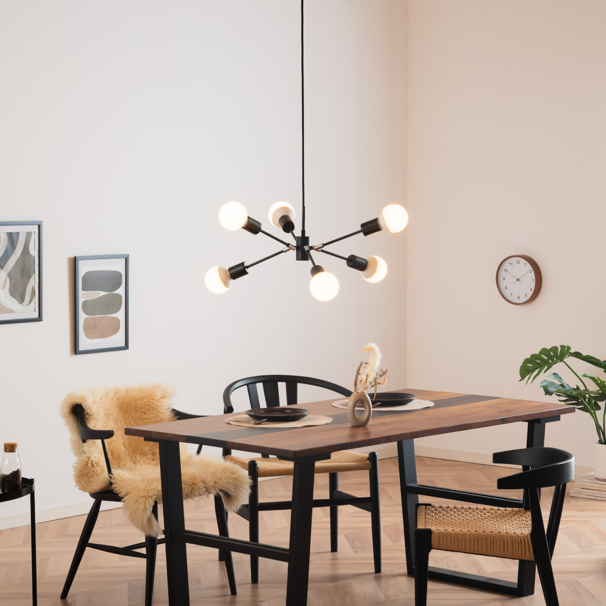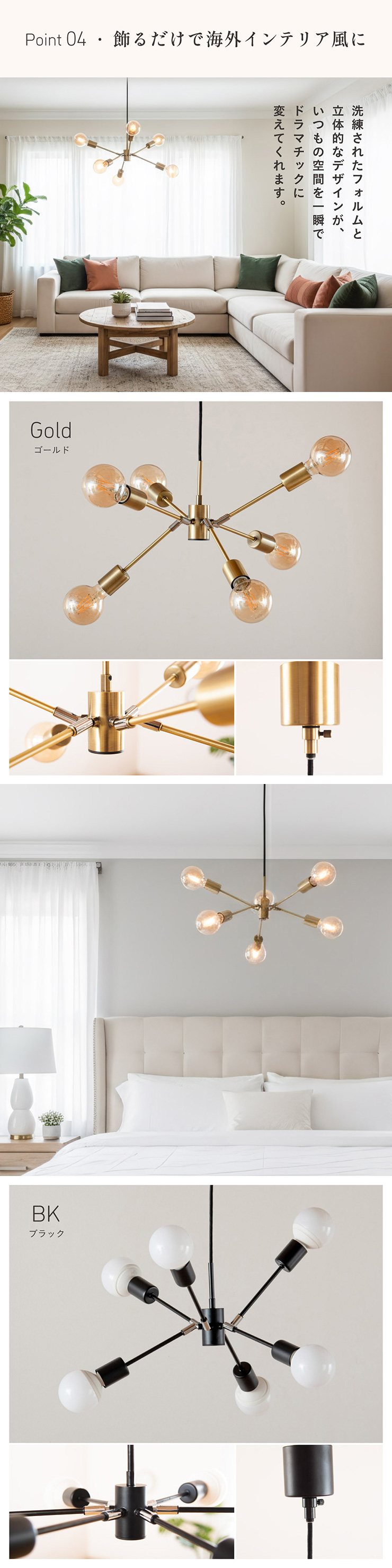 | LED電球専用 ペンダントライト Stique(スティーク) 電球セット 天井からセンスが漂う、主役級ライト 天井から空間全体にセンスが広がるデザイン照明。電球やアーム角度を変えれば、光も造形も自分好みにカスタム可能です。 放射状のアームと抜け感のあるシルエットが、どんな部屋も一気に洗練された雰囲気にしてくれます。 ■アームの角度を変えて“自分だけのデザイン”に 全部水平にしてミニマルな印象にしたり、互い違いにして立体感を出したり、アームを調整して好きな形にデザインが可能です。 ■コードの長さを調節可能 コード長さを自由に調節できるから、天井の高さに合わせてベストな配置が可能 ■LED電球で省エネ LED電球専用ライトだから、あかるさを確保しながら電気代も抑えられます。 ■飾るだけで海外インテリア風に 洗練されたフォルムと立体的なデザインが、いつもの空間を一瞬でドラマチックに変えてくれます。 ■電球 ・口金:E26 ・定格消費電力:13W以下(※明るさ60W相当以下) ・定格電圧:100V ・この器具はLED電球専用です。 ・白熱電球や蛍光灯電球は使用できません。 ・電球は付属しておりません。 ・電球をご購入される前に、必ずロ金・ワット数のご確認をお願いいたします。 ・調光調色機能付き電球やリモコン付き電球などは対応可能です。 ■引掛けシーリング 一般的なご家庭に設置されている、下記のいずれかのシーリングがあれば、特別な工具や工事なしで簡単に取り付けが可能です。 ・角型引掛けシーリング ・丸型引掛けシーリング ・丸型フル引掛けシーリング ・フル引掛けシーリング ・引掛け埋込ローゼット ※シーリングが設置されていない場合は、別途電気工事が必要になります。 ※種類によっては、シーリングカバー内に完全に収まらない場合があります。ご了承ください。 ■取り付け場所 次のような天井には取り付けないでください。 ・突出部のある天井 ・たわみやすい天井、補強のない薄い天井(ベニヤ板、石膏ボードなど) ・傾斜した天井 ・凸凹のある天井 ※指定以外の場所に取り付けると、火災・落下などの原因になります。 調光機能がついた壁スイッチには取り付けできません。 ※火災の原因になるため、一般のスイッチに交換する取り付けないでください。 ■ダクトレールでもご使用可能〇 ダクトレールとダクトレール専用の変換プラグは別途ご用意ください。 ■LED電球を6灯付属しています ・60形相当 ・きらめきが広がるLED電球フィラメントタイプ ・光の広がり約310°全方向タイプ ・E26口金、電球色 ・メーカー:オーム電機 ※電気用品安全法(PSE法)および日本の安全規格に適合した製品です。 ※屋内専用(屋外使用禁止) ※交流100V 50/60Hz 共有 ※次のような器具には使用できません。 調光機能のついた器具(100%点灯でも使用不可)・誘導灯、非常用照明器具・HIDランプ器具、水銀灯器具・断熱材施工器具1(SB・SGI・SG形表示器具など)・ランプと反射板の距離が狭い器具・直流電源 ※このほか使用器具の種類によって寸法的、熱的、その他の状況(リモコン機器のついた器具など)により使用できない場合があります。 ※ご使用になられる照明器具の構造によっては、放熱不良で短寿命となることがあります。 ※密閉器具でのご使用の場合、器具の寸法により、使用できない場合や寿命が短くなる場合があります。 ※人感スイッチなど自動点滅装置や遅れ停止スイッチなどに使用できない場合があります。 ※交流100V 周波数50/60Hz以外の電源では使用しないでください。 ※ランプ周囲温度が40℃を超える場所では使用しないでください。 ※ラジオやテレビなどの音響および映像機器の近くで点灯すると、雑音が入ることがあります。(雑音が入るときは、ランプから1m以上離してください。) ※赤外線リモコンを採用した機器(テレビやエアコンなど)の近くで点灯すると、機器が誤作動することがあります。 | |