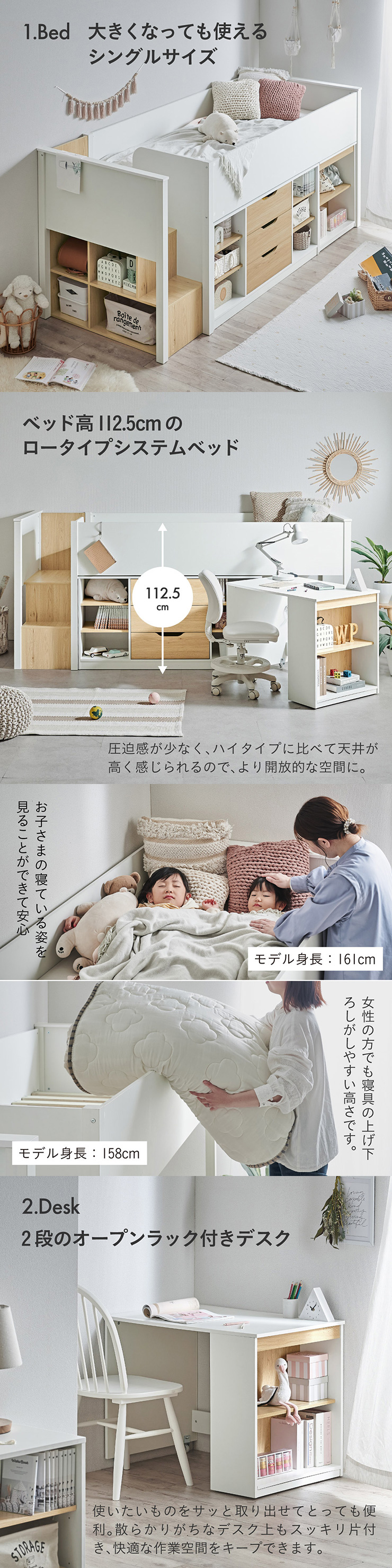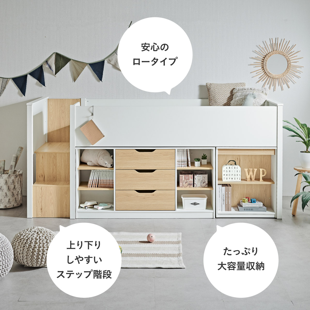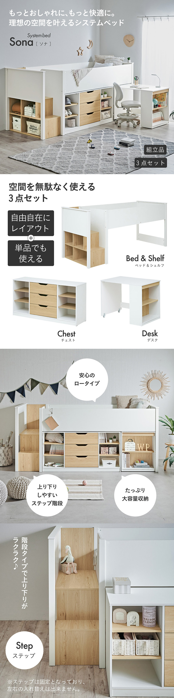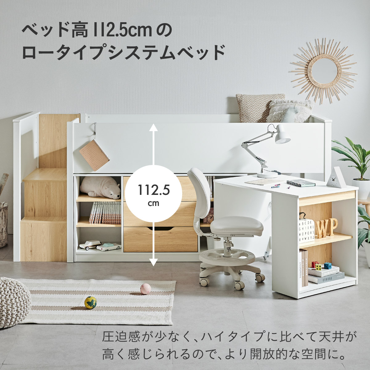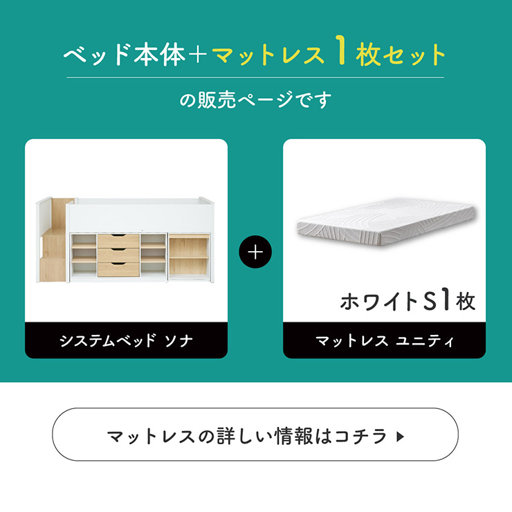 | Low Type System Bed Sona(ソナ) + Unity(ユニティ) ホワイト もっとおしゃれに、もっと快適に。 理想の空間を叶えるシステムベッド ■空間を無駄なく使える3点セット ・安心のロータイプ ・たっぷり大容量収納 ・上り下りしやすいステップ階段 ■階段タイプで上り下りがラクラク ※ステップは固定となっており、左右の入れ替えはできません。 ■ベッド高112.5cmのロータイプシステムベッド 圧迫感が少なく、ハイタイプに比べて天井が高く感じられるので、より開放的な空間に。 女性の方でも寝具の上げ下ろしがしやすい高さです。 ■2段のオープンラック付きデスク。 デスクから手の届く位置にあるので、使いたいものをサッと取り出せてとっても便利。 散らかりがちなデスク上もスッキリ片付き、快適な作業空間をキープできます。 ■キャスター付きでお子さまでも出し入れ簡単 左右にだけ動かせるキャスターを採用。 まっすぐ動かせるので出し入れの際に周囲にぶつける心配がありません。 ■奥行きたっぷりのオープンシェルフ 棚板は全て3cm間隔3段階の可動式のため、収納するものに合わせて調節が可能です。 ■衣類もおもちゃもたっぷり収納!3段チェスト 力を入れずに開閉できるスライドレール仕様の3段チェストはお子さまでも出し入れ簡単♪ ■ベッド下を有効活用!収納力アップでお部屋スッキリ チェストを設置しても収納スペースに使える余裕があるので、シーズンオフの寝具や衣服など、見せない収納としてもお使いいただけます。 ■ランドセルも収納できる奥行きたっぷりの階段下収納 ■「清潔感×ナチュラル」 空間にやさしい明るさと自然な温もりをプラスしたデザインに仕上げました。 ※こちらの商品はお客様組み立てとなります。 ※組み立て方や若干の個体差によって、表記サイズと完成形のサイズに多少の誤差が生じる場合がございます。予めご了承ください。 ※耐荷重検査は静止耐荷重です。ベッドの上で激しく動く、急激な力を加える、飛び跳ねるなど1点に集中して負荷をかける行為はお控えください。 ※こちらはシステムベッド+マットレス(ホワイト)のセット販売となります。チェア、ライト等は別売りとなります。 ※圧縮袋は一度開封すると再圧縮できません。 ※開封する際はハサミを使用し、ケガ等に十分気をつけながら行ってください。 ※開封後約1日~2日程度で本来の大きさに復元します。 ※本製品はウレタン製品のため、開封後すぐはウレタン特有のニオイがする場合がございます。ニオイがきつい場合は、ご使用の前に一度陰干ししてニオイを飛ばしてからご使用くださいますようお願いいたします。 ※臭いは新品のウレタン特有のもので無害です。 ※直射日光はウレタンの変色を促す恐れがあるためお避けください。 ※カバーを洗濯する時は、洗濯ネットに入れてください。 ※マットレスは片面仕様です。裏返してご使用はできません。 ※計測の仕方や、ロットによりサイズに多少の誤差が生じる場合がございます。予めご了承ください。 ※商品のデザイン、仕様、外観、価格は予告なく変更する場合があります。 ※商品写真はできる限り実物の色に近づけるよう徹底しておりますが、お使いのモニター設定、お部屋の照明、製造ロット等により実際の商品と若干色味が異なる場合がございますので予めご了承ください。 | |
