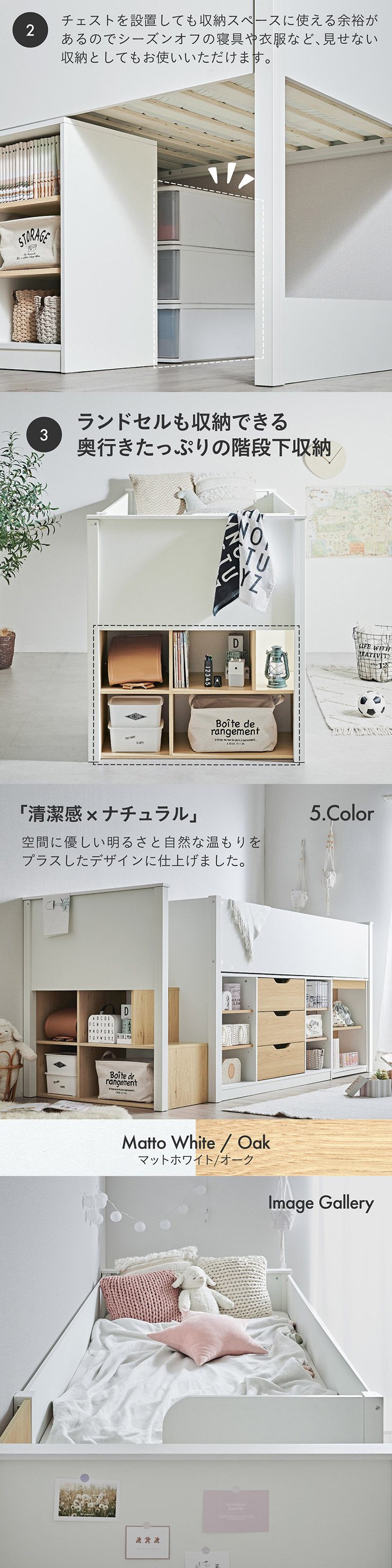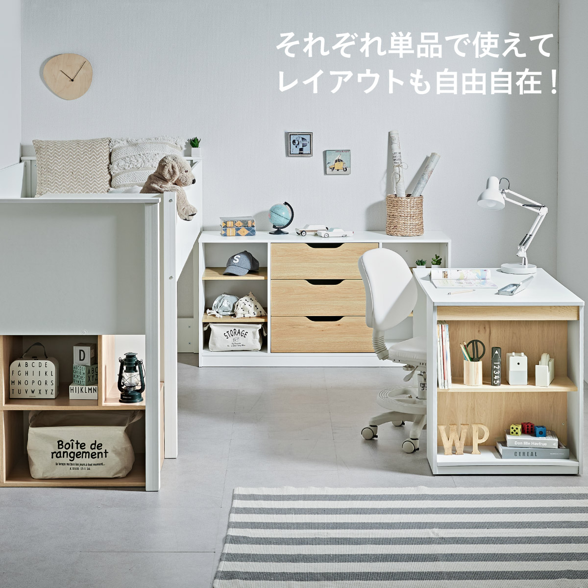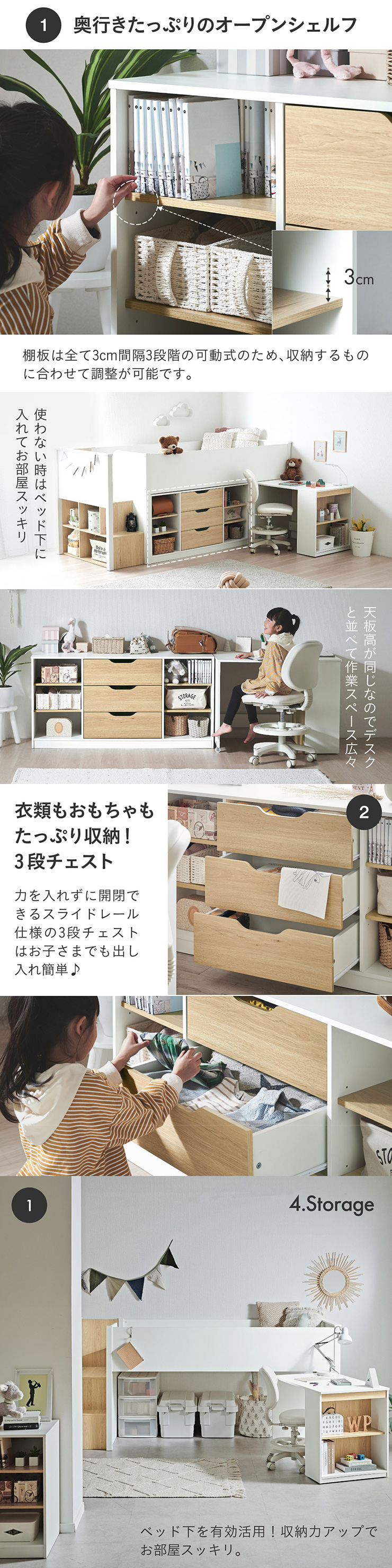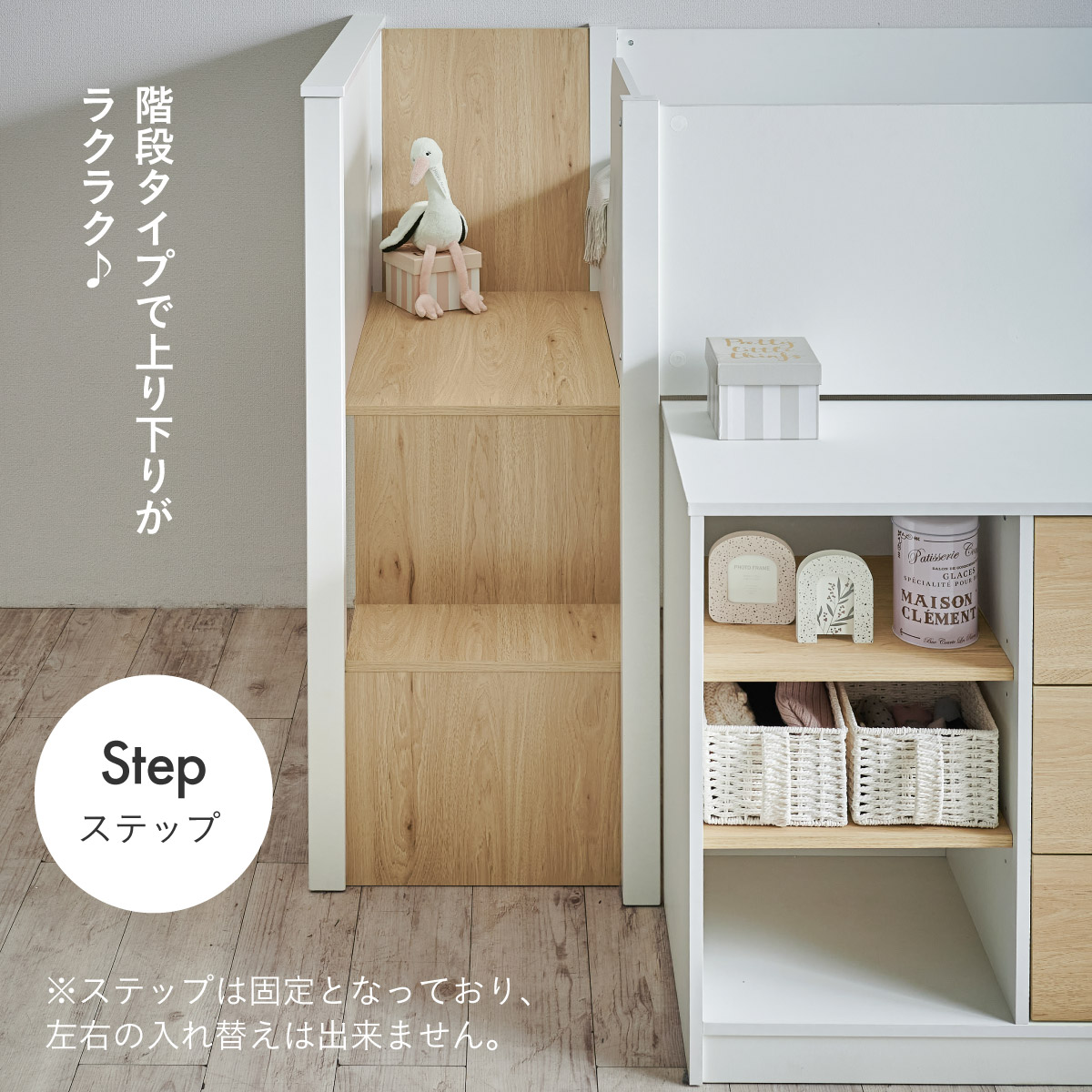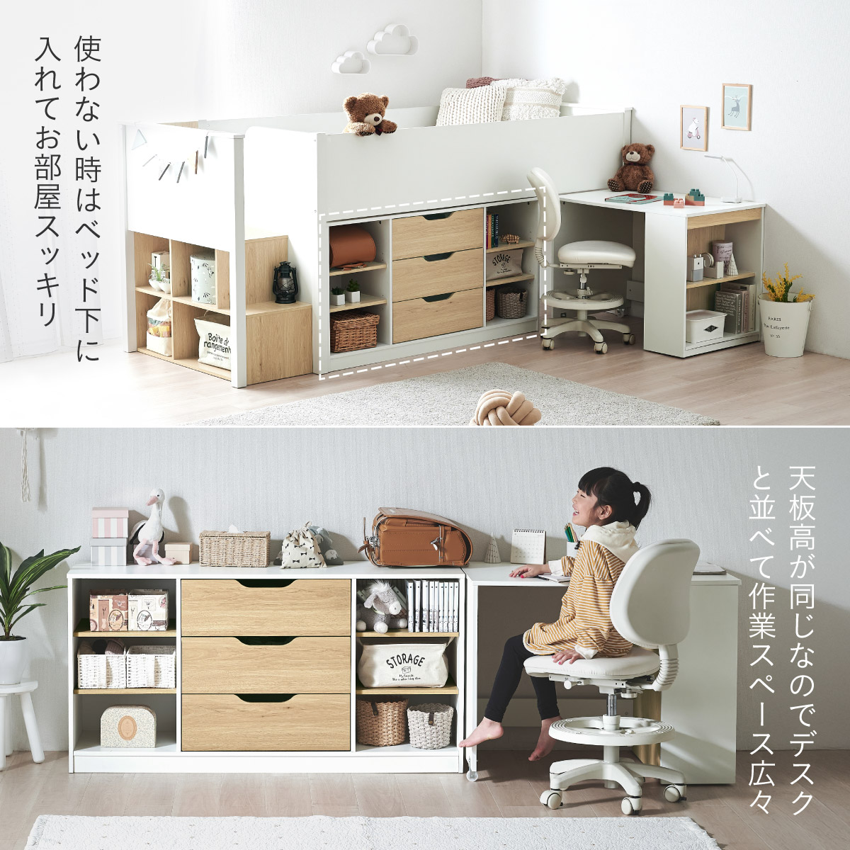 | Low Type System Bed Sona(ソナ) + Unity(ユニティ) ホワイト もっとおしゃれに、もっと快適に。 理想の空間を叶えるシステムベッド ■空間を無駄なく使える3点セット ・安心のロータイプ ・たっぷり大容量収納 ・上り下りしやすいステップ階段 ■階段タイプで上り下りがラクラク ※ステップは固定となっており、左右の入れ替えはできません。 ■ベッド高112.5cmのロータイプシステムベッド 圧迫感が少なく、ハイタイプに比べて天井が高く感じられるので、より開放的な空間に。 女性の方でも寝具の上げ下ろしがしやすい高さです。 ■2段のオープンラック付きデスク。 デスクから手の届く位置にあるので、使いたいものをサッと取り出せてとっても便利。 散らかりがちなデスク上もスッキリ片付き、快適な作業空間をキープできます。 ■キャスター付きでお子さまでも出し入れ簡単 左右にだけ動かせるキャスターを採用。 まっすぐ動かせるので出し入れの際に周囲にぶつける心配がありません。 ■奥行きたっぷりのオープンシェルフ 棚板は全て3cm間隔3段階の可動式のため、収納するものに合わせて調節が可能です。 ■衣類もおもちゃもたっぷり収納!3段チェスト 力を入れずに開閉できるスライドレール仕様の3段チェストはお子さまでも出し入れ簡単♪ ■ベッド下を有効活用!収納力アップでお部屋スッキリ チェストを設置しても収納スペースに使える余裕があるので、シーズンオフの寝具や衣服など、見せない収納としてもお使いいただけます。 ■ランドセルも収納できる奥行きたっぷりの階段下収納 ■「清潔感×ナチュラル」 空間にやさしい明るさと自然な温もりをプラスしたデザインに仕上げました。 ※こちらの商品はお客様組み立てとなります。 ※組み立て方や若干の個体差によって、表記サイズと完成形のサイズに多少の誤差が生じる場合がございます。予めご了承ください。 ※耐荷重検査は静止耐荷重です。ベッドの上で激しく動く、急激な力を加える、飛び跳ねるなど1点に集中して負荷をかける行為はお控えください。 ※こちらはシステムベッド+マットレス(ホワイト)のセット販売となります。チェア、ライト等は別売りとなります。 ※圧縮袋は一度開封すると再圧縮できません。 ※開封する際はハサミを使用し、ケガ等に十分気をつけながら行ってください。 ※開封後約1日~2日程度で本来の大きさに復元します。 ※本製品はウレタン製品のため、開封後すぐはウレタン特有のニオイがする場合がございます。ニオイがきつい場合は、ご使用の前に一度陰干ししてニオイを飛ばしてからご使用くださいますようお願いいたします。 ※臭いは新品のウレタン特有のもので無害です。 ※直射日光はウレタンの変色を促す恐れがあるためお避けください。 ※カバーを洗濯する時は、洗濯ネットに入れてください。 ※マットレスは片面仕様です。裏返してご使用はできません。 ※計測の仕方や、ロットによりサイズに多少の誤差が生じる場合がございます。予めご了承ください。 ※商品のデザイン、仕様、外観、価格は予告なく変更する場合があります。 ※商品写真はできる限り実物の色に近づけるよう徹底しておりますが、お使いのモニター設定、お部屋の照明、製造ロット等により実際の商品と若干色味が異なる場合がございますので予めご了承ください。 | |