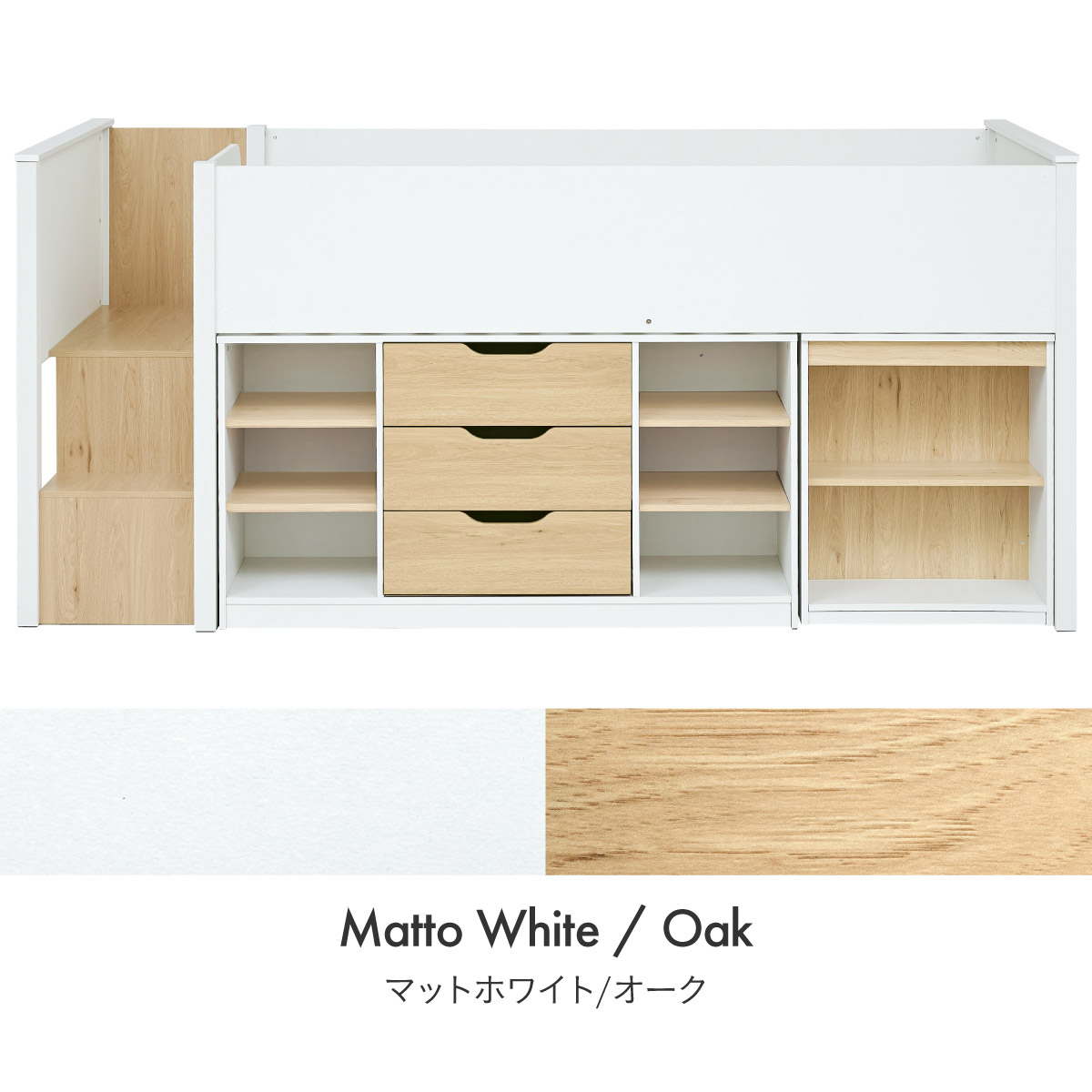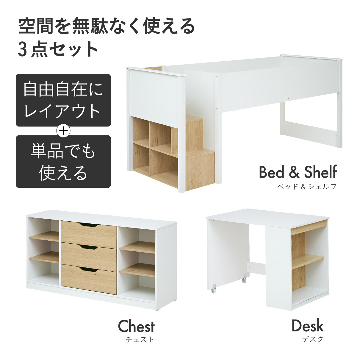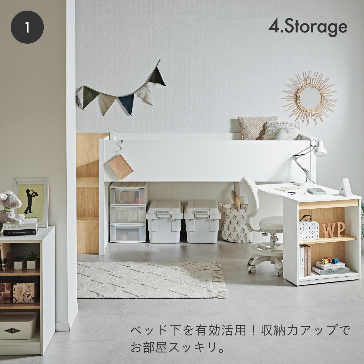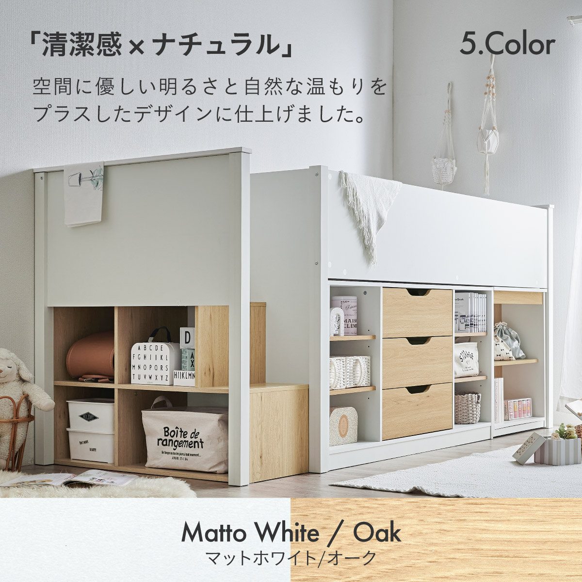 | Low Type System Bed Sona(ソナ) + Unity(ユニティ) ホワイト もっとおしゃれに、もっと快適に。 理想の空間を叶えるシステムベッド ■空間を無駄なく使える3点セット ・安心のロータイプ ・たっぷり大容量収納 ・上り下りしやすいステップ階段 ■階段タイプで上り下りがラクラク ※ステップは固定となっており、左右の入れ替えはできません。 ■ベッド高112.5cmのロータイプシステムベッド 圧迫感が少なく、ハイタイプに比べて天井が高く感じられるので、より開放的な空間に。 女性の方でも寝具の上げ下ろしがしやすい高さです。 ■2段のオープンラック付きデスク。 デスクから手の届く位置にあるので、使いたいものをサッと取り出せてとっても便利。 散らかりがちなデスク上もスッキリ片付き、快適な作業空間をキープできます。 ■キャスター付きでお子さまでも出し入れ簡単 左右にだけ動かせるキャスターを採用。 まっすぐ動かせるので出し入れの際に周囲にぶつける心配がありません。 ■奥行きたっぷりのオープンシェルフ 棚板は全て3cm間隔3段階の可動式のため、収納するものに合わせて調節が可能です。 ■衣類もおもちゃもたっぷり収納!3段チェスト 力を入れずに開閉できるスライドレール仕様の3段チェストはお子さまでも出し入れ簡単♪ ■ベッド下を有効活用!収納力アップでお部屋スッキリ チェストを設置しても収納スペースに使える余裕があるので、シーズンオフの寝具や衣服など、見せない収納としてもお使いいただけます。 ■ランドセルも収納できる奥行きたっぷりの階段下収納 ■「清潔感×ナチュラル」 空間にやさしい明るさと自然な温もりをプラスしたデザインに仕上げました。 ※こちらの商品はお客様組み立てとなります。 ※組み立て方や若干の個体差によって、表記サイズと完成形のサイズに多少の誤差が生じる場合がございます。予めご了承ください。 ※耐荷重検査は静止耐荷重です。ベッドの上で激しく動く、急激な力を加える、飛び跳ねるなど1点に集中して負荷をかける行為はお控えください。 ※こちらはシステムベッド+マットレス(ホワイト)のセット販売となります。チェア、ライト等は別売りとなります。 ※圧縮袋は一度開封すると再圧縮できません。 ※開封する際はハサミを使用し、ケガ等に十分気をつけながら行ってください。 ※開封後約1日~2日程度で本来の大きさに復元します。 ※本製品はウレタン製品のため、開封後すぐはウレタン特有のニオイがする場合がございます。ニオイがきつい場合は、ご使用の前に一度陰干ししてニオイを飛ばしてからご使用くださいますようお願いいたします。 ※臭いは新品のウレタン特有のもので無害です。 ※直射日光はウレタンの変色を促す恐れがあるためお避けください。 ※カバーを洗濯する時は、洗濯ネットに入れてください。 ※マットレスは片面仕様です。裏返してご使用はできません。 ※計測の仕方や、ロットによりサイズに多少の誤差が生じる場合がございます。予めご了承ください。 ※商品のデザイン、仕様、外観、価格は予告なく変更する場合があります。 ※商品写真はできる限り実物の色に近づけるよう徹底しておりますが、お使いのモニター設定、お部屋の照明、製造ロット等により実際の商品と若干色味が異なる場合がございますので予めご了承ください。 | |