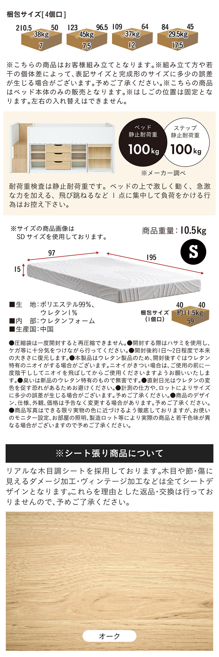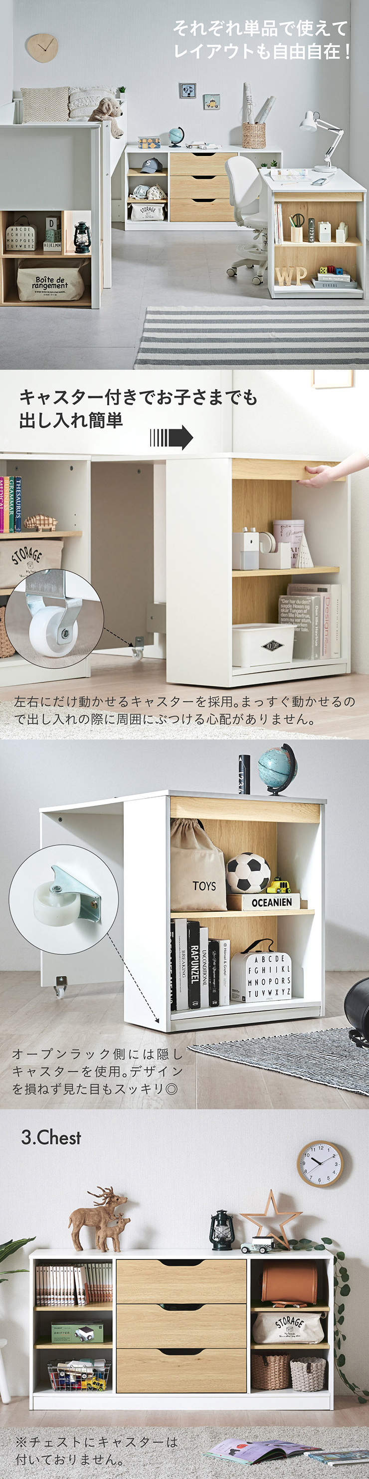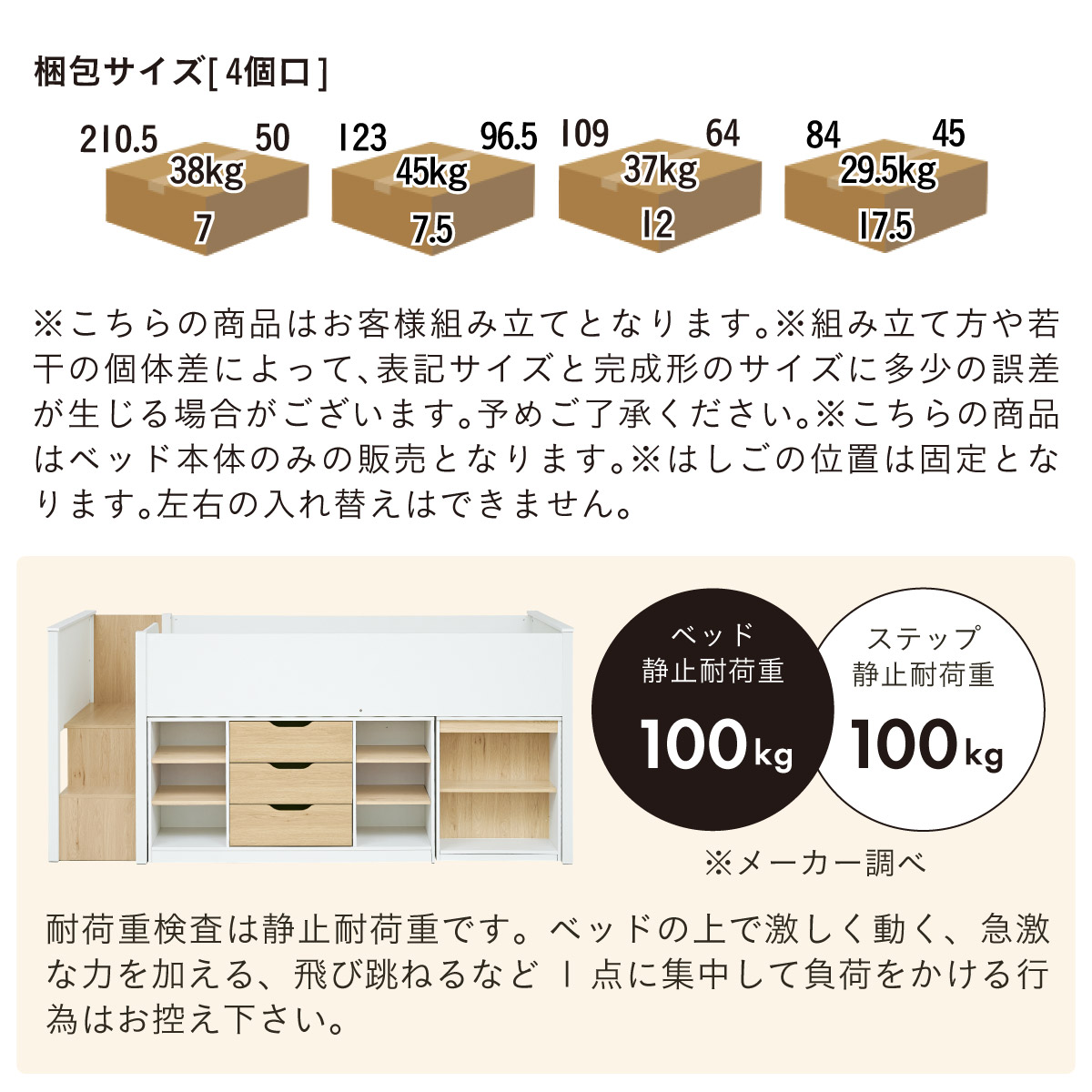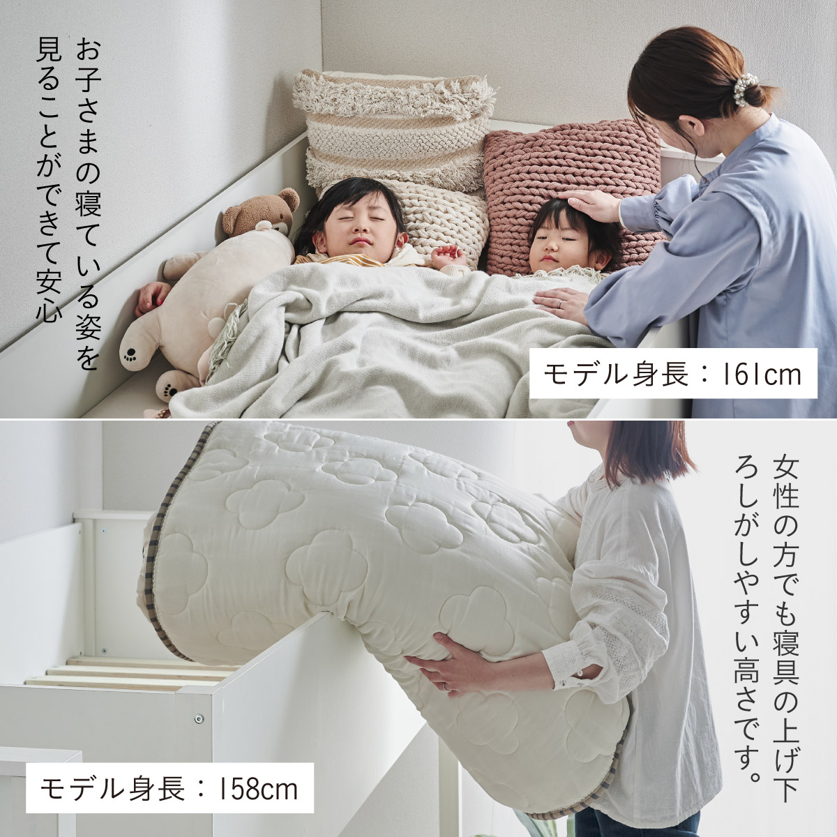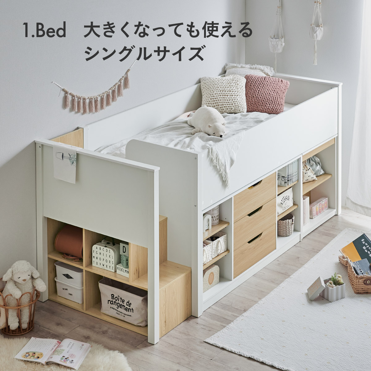 | Low Type System Bed Sona(ソナ) + Unity(ユニティ) ホワイト もっとおしゃれに、もっと快適に。 理想の空間を叶えるシステムベッド ■空間を無駄なく使える3点セット ・安心のロータイプ ・たっぷり大容量収納 ・上り下りしやすいステップ階段 ■階段タイプで上り下りがラクラク ※ステップは固定となっており、左右の入れ替えはできません。 ■ベッド高112.5cmのロータイプシステムベッド 圧迫感が少なく、ハイタイプに比べて天井が高く感じられるので、より開放的な空間に。 女性の方でも寝具の上げ下ろしがしやすい高さです。 ■2段のオープンラック付きデスク。 デスクから手の届く位置にあるので、使いたいものをサッと取り出せてとっても便利。 散らかりがちなデスク上もスッキリ片付き、快適な作業空間をキープできます。 ■キャスター付きでお子さまでも出し入れ簡単 左右にだけ動かせるキャスターを採用。 まっすぐ動かせるので出し入れの際に周囲にぶつける心配がありません。 ■奥行きたっぷりのオープンシェルフ 棚板は全て3cm間隔3段階の可動式のため、収納するものに合わせて調節が可能です。 ■衣類もおもちゃもたっぷり収納!3段チェスト 力を入れずに開閉できるスライドレール仕様の3段チェストはお子さまでも出し入れ簡単♪ ■ベッド下を有効活用!収納力アップでお部屋スッキリ チェストを設置しても収納スペースに使える余裕があるので、シーズンオフの寝具や衣服など、見せない収納としてもお使いいただけます。 ■ランドセルも収納できる奥行きたっぷりの階段下収納 ■「清潔感×ナチュラル」 空間にやさしい明るさと自然な温もりをプラスしたデザインに仕上げました。 ※こちらの商品はお客様組み立てとなります。 ※組み立て方や若干の個体差によって、表記サイズと完成形のサイズに多少の誤差が生じる場合がございます。予めご了承ください。 ※耐荷重検査は静止耐荷重です。ベッドの上で激しく動く、急激な力を加える、飛び跳ねるなど1点に集中して負荷をかける行為はお控えください。 ※こちらはシステムベッド+マットレス(ホワイト)のセット販売となります。チェア、ライト等は別売りとなります。 ※圧縮袋は一度開封すると再圧縮できません。 ※開封する際はハサミを使用し、ケガ等に十分気をつけながら行ってください。 ※開封後約1日~2日程度で本来の大きさに復元します。 ※本製品はウレタン製品のため、開封後すぐはウレタン特有のニオイがする場合がございます。ニオイがきつい場合は、ご使用の前に一度陰干ししてニオイを飛ばしてからご使用くださいますようお願いいたします。 ※臭いは新品のウレタン特有のもので無害です。 ※直射日光はウレタンの変色を促す恐れがあるためお避けください。 ※カバーを洗濯する時は、洗濯ネットに入れてください。 ※マットレスは片面仕様です。裏返してご使用はできません。 ※計測の仕方や、ロットによりサイズに多少の誤差が生じる場合がございます。予めご了承ください。 ※商品のデザイン、仕様、外観、価格は予告なく変更する場合があります。 ※商品写真はできる限り実物の色に近づけるよう徹底しておりますが、お使いのモニター設定、お部屋の照明、製造ロット等により実際の商品と若干色味が異なる場合がございますので予めご了承ください。 | |