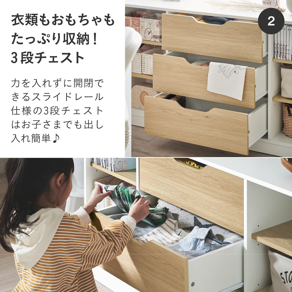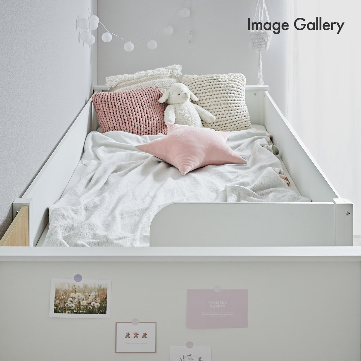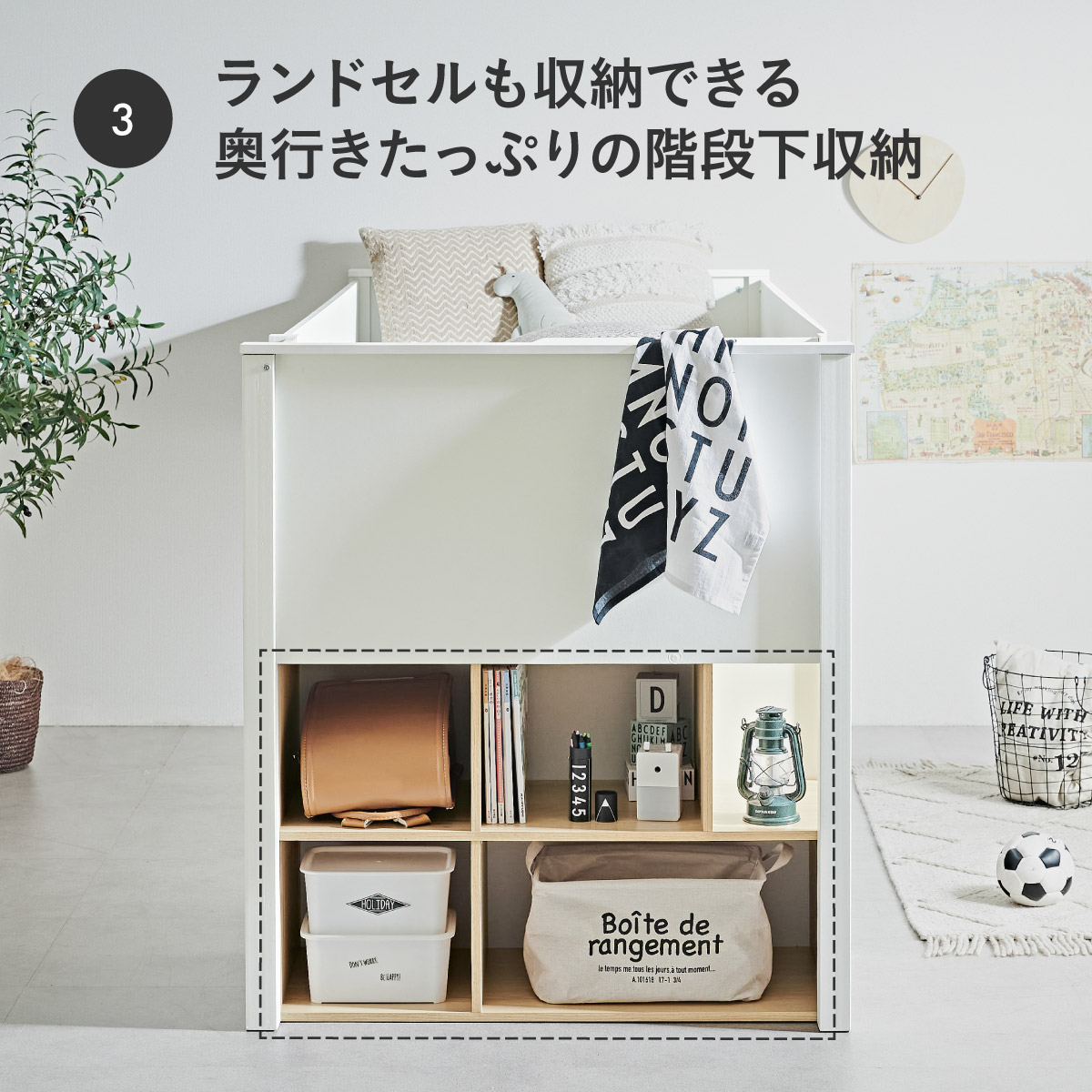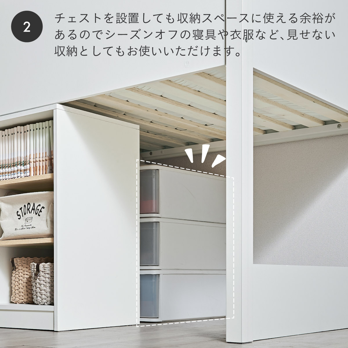 | Low Type System Bed Sona(ソナ) + Unity(ユニティ) ホワイト もっとおしゃれに、もっと快適に。 理想の空間を叶えるシステムベッド ■空間を無駄なく使える3点セット ・安心のロータイプ ・たっぷり大容量収納 ・上り下りしやすいステップ階段 ■階段タイプで上り下りがラクラク ※ステップは固定となっており、左右の入れ替えはできません。 ■ベッド高112.5cmのロータイプシステムベッド 圧迫感が少なく、ハイタイプに比べて天井が高く感じられるので、より開放的な空間に。 女性の方でも寝具の上げ下ろしがしやすい高さです。 ■2段のオープンラック付きデスク。 デスクから手の届く位置にあるので、使いたいものをサッと取り出せてとっても便利。 散らかりがちなデスク上もスッキリ片付き、快適な作業空間をキープできます。 ■キャスター付きでお子さまでも出し入れ簡単 左右にだけ動かせるキャスターを採用。 まっすぐ動かせるので出し入れの際に周囲にぶつける心配がありません。 ■奥行きたっぷりのオープンシェルフ 棚板は全て3cm間隔3段階の可動式のため、収納するものに合わせて調節が可能です。 ■衣類もおもちゃもたっぷり収納!3段チェスト 力を入れずに開閉できるスライドレール仕様の3段チェストはお子さまでも出し入れ簡単♪ ■ベッド下を有効活用!収納力アップでお部屋スッキリ チェストを設置しても収納スペースに使える余裕があるので、シーズンオフの寝具や衣服など、見せない収納としてもお使いいただけます。 ■ランドセルも収納できる奥行きたっぷりの階段下収納 ■「清潔感×ナチュラル」 空間にやさしい明るさと自然な温もりをプラスしたデザインに仕上げました。 ※こちらの商品はお客様組み立てとなります。 ※組み立て方や若干の個体差によって、表記サイズと完成形のサイズに多少の誤差が生じる場合がございます。予めご了承ください。 ※耐荷重検査は静止耐荷重です。ベッドの上で激しく動く、急激な力を加える、飛び跳ねるなど1点に集中して負荷をかける行為はお控えください。 ※こちらはシステムベッド+マットレス(ホワイト)のセット販売となります。チェア、ライト等は別売りとなります。 ※圧縮袋は一度開封すると再圧縮できません。 ※開封する際はハサミを使用し、ケガ等に十分気をつけながら行ってください。 ※開封後約1日~2日程度で本来の大きさに復元します。 ※本製品はウレタン製品のため、開封後すぐはウレタン特有のニオイがする場合がございます。ニオイがきつい場合は、ご使用の前に一度陰干ししてニオイを飛ばしてからご使用くださいますようお願いいたします。 ※臭いは新品のウレタン特有のもので無害です。 ※直射日光はウレタンの変色を促す恐れがあるためお避けください。 ※カバーを洗濯する時は、洗濯ネットに入れてください。 ※マットレスは片面仕様です。裏返してご使用はできません。 ※計測の仕方や、ロットによりサイズに多少の誤差が生じる場合がございます。予めご了承ください。 ※商品のデザイン、仕様、外観、価格は予告なく変更する場合があります。 ※商品写真はできる限り実物の色に近づけるよう徹底しておりますが、お使いのモニター設定、お部屋の照明、製造ロット等により実際の商品と若干色味が異なる場合がございますので予めご了承ください。 | |