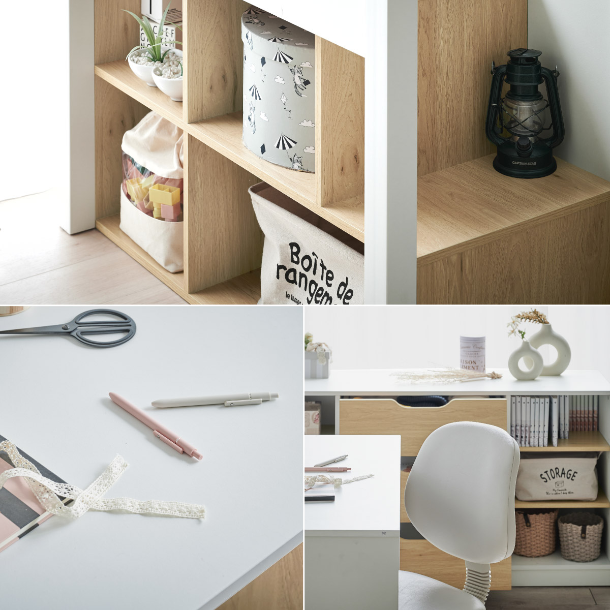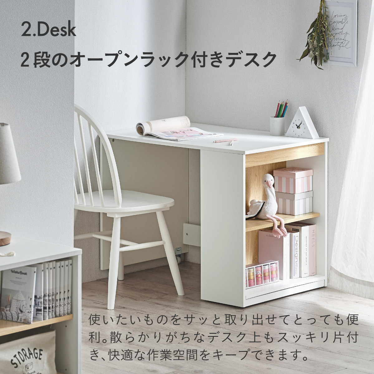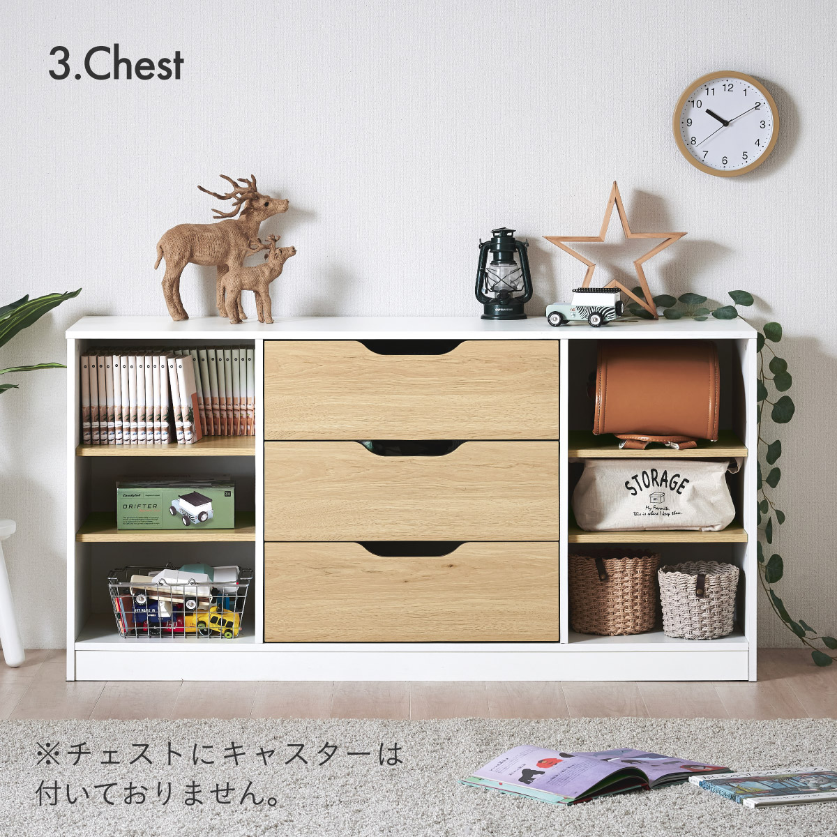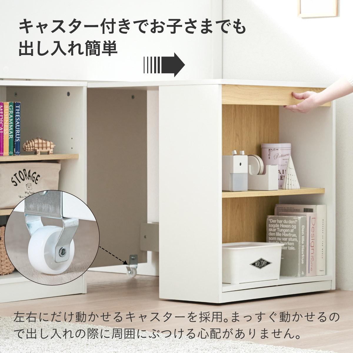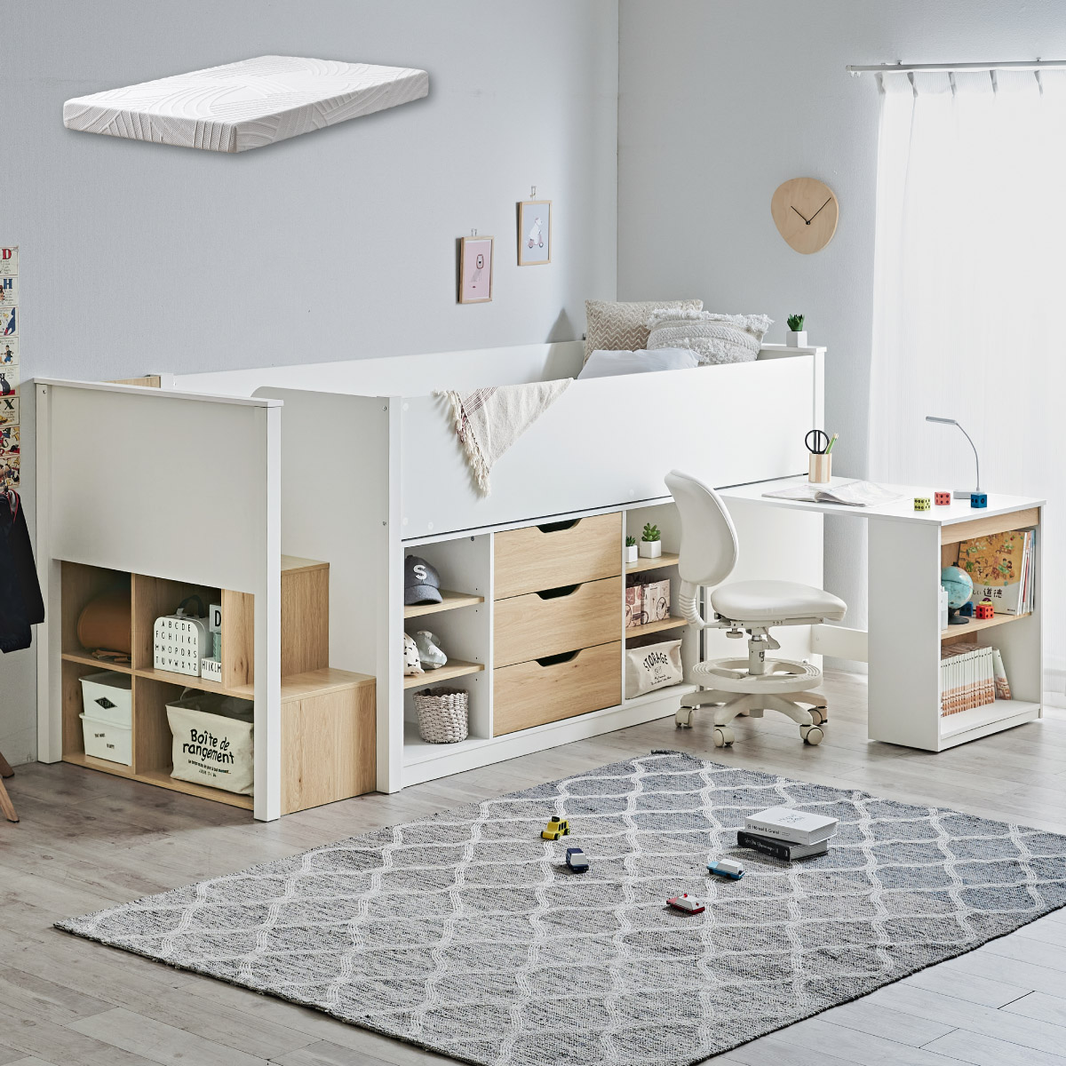 | Low Type System Bed Sona(ソナ) + Unity(ユニティ) ホワイト もっとおしゃれに、もっと快適に。 理想の空間を叶えるシステムベッド ■空間を無駄なく使える3点セット ・安心のロータイプ ・たっぷり大容量収納 ・上り下りしやすいステップ階段 ■階段タイプで上り下りがラクラク ※ステップは固定となっており、左右の入れ替えはできません。 ■ベッド高112.5cmのロータイプシステムベッド 圧迫感が少なく、ハイタイプに比べて天井が高く感じられるので、より開放的な空間に。 女性の方でも寝具の上げ下ろしがしやすい高さです。 ■2段のオープンラック付きデスク。 デスクから手の届く位置にあるので、使いたいものをサッと取り出せてとっても便利。 散らかりがちなデスク上もスッキリ片付き、快適な作業空間をキープできます。 ■キャスター付きでお子さまでも出し入れ簡単 左右にだけ動かせるキャスターを採用。 まっすぐ動かせるので出し入れの際に周囲にぶつける心配がありません。 ■奥行きたっぷりのオープンシェルフ 棚板は全て3cm間隔3段階の可動式のため、収納するものに合わせて調節が可能です。 ■衣類もおもちゃもたっぷり収納!3段チェスト 力を入れずに開閉できるスライドレール仕様の3段チェストはお子さまでも出し入れ簡単♪ ■ベッド下を有効活用!収納力アップでお部屋スッキリ チェストを設置しても収納スペースに使える余裕があるので、シーズンオフの寝具や衣服など、見せない収納としてもお使いいただけます。 ■ランドセルも収納できる奥行きたっぷりの階段下収納 ■「清潔感×ナチュラル」 空間にやさしい明るさと自然な温もりをプラスしたデザインに仕上げました。 ※こちらの商品はお客様組み立てとなります。 ※組み立て方や若干の個体差によって、表記サイズと完成形のサイズに多少の誤差が生じる場合がございます。予めご了承ください。 ※耐荷重検査は静止耐荷重です。ベッドの上で激しく動く、急激な力を加える、飛び跳ねるなど1点に集中して負荷をかける行為はお控えください。 ※こちらはシステムベッド+マットレス(ホワイト)のセット販売となります。チェア、ライト等は別売りとなります。 ※圧縮袋は一度開封すると再圧縮できません。 ※開封する際はハサミを使用し、ケガ等に十分気をつけながら行ってください。 ※開封後約1日~2日程度で本来の大きさに復元します。 ※本製品はウレタン製品のため、開封後すぐはウレタン特有のニオイがする場合がございます。ニオイがきつい場合は、ご使用の前に一度陰干ししてニオイを飛ばしてからご使用くださいますようお願いいたします。 ※臭いは新品のウレタン特有のもので無害です。 ※直射日光はウレタンの変色を促す恐れがあるためお避けください。 ※カバーを洗濯する時は、洗濯ネットに入れてください。 ※マットレスは片面仕様です。裏返してご使用はできません。 ※計測の仕方や、ロットによりサイズに多少の誤差が生じる場合がございます。予めご了承ください。 ※商品のデザイン、仕様、外観、価格は予告なく変更する場合があります。 ※商品写真はできる限り実物の色に近づけるよう徹底しておりますが、お使いのモニター設定、お部屋の照明、製造ロット等により実際の商品と若干色味が異なる場合がございますので予めご了承ください。 | |