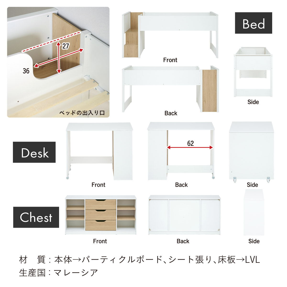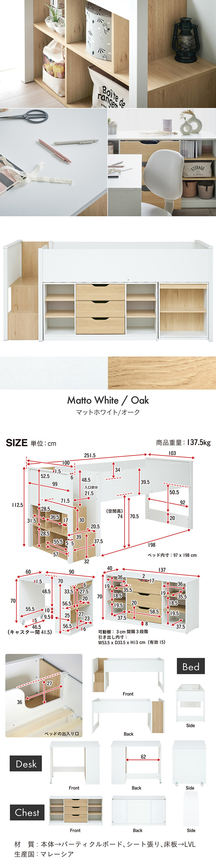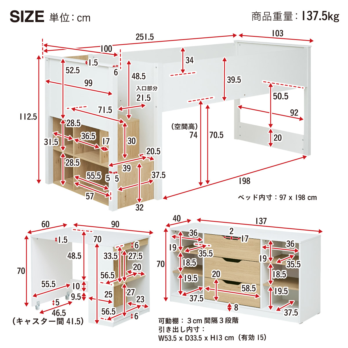 | サイズ | ベッド本体:W251 x D100 x H112.5cm(重量:137.5kg) デスク:W90 x D60 x H70cm チェスト:W137 x D40 x H70cm マットレス:W97 x D195 x H15cm(重量:10.5kg) |