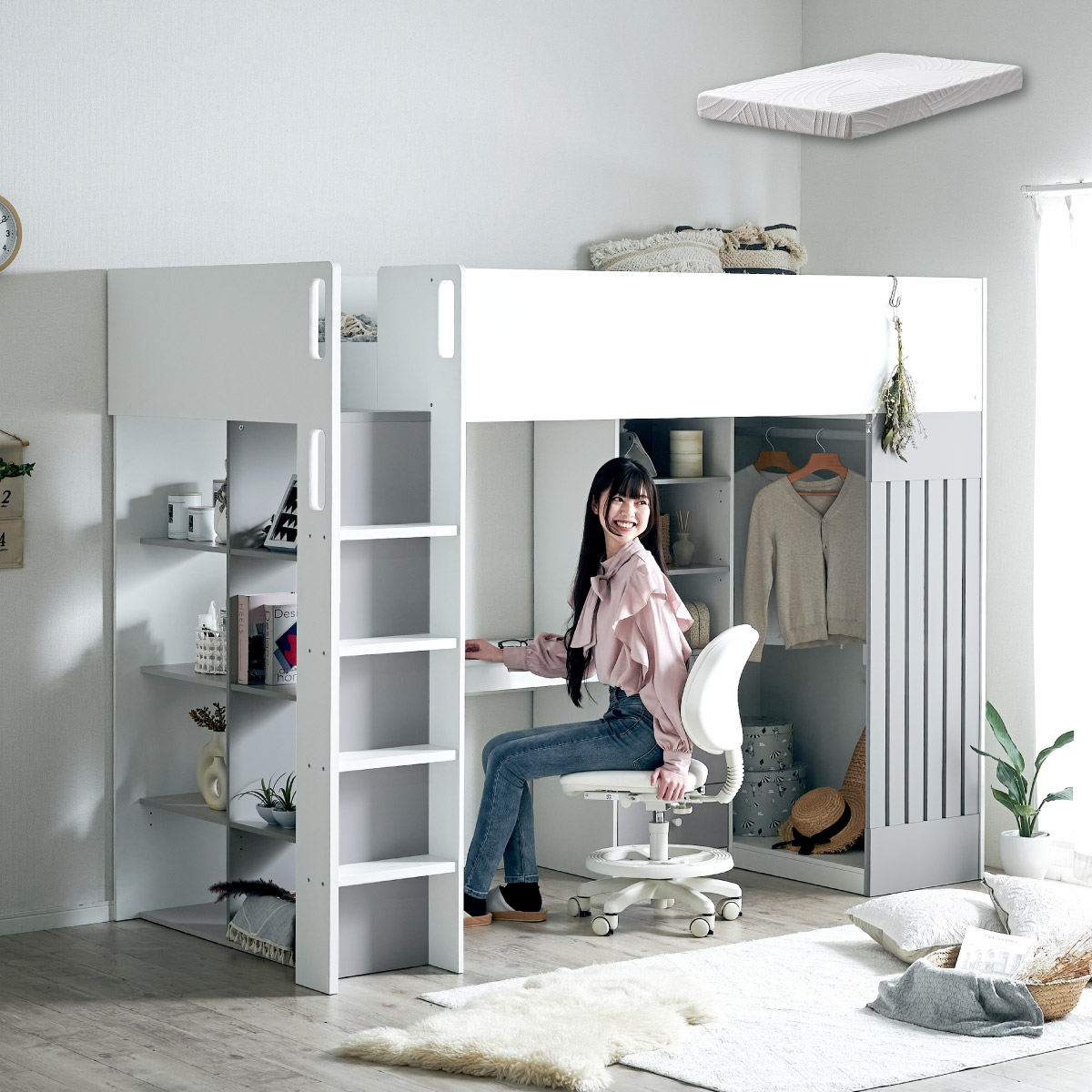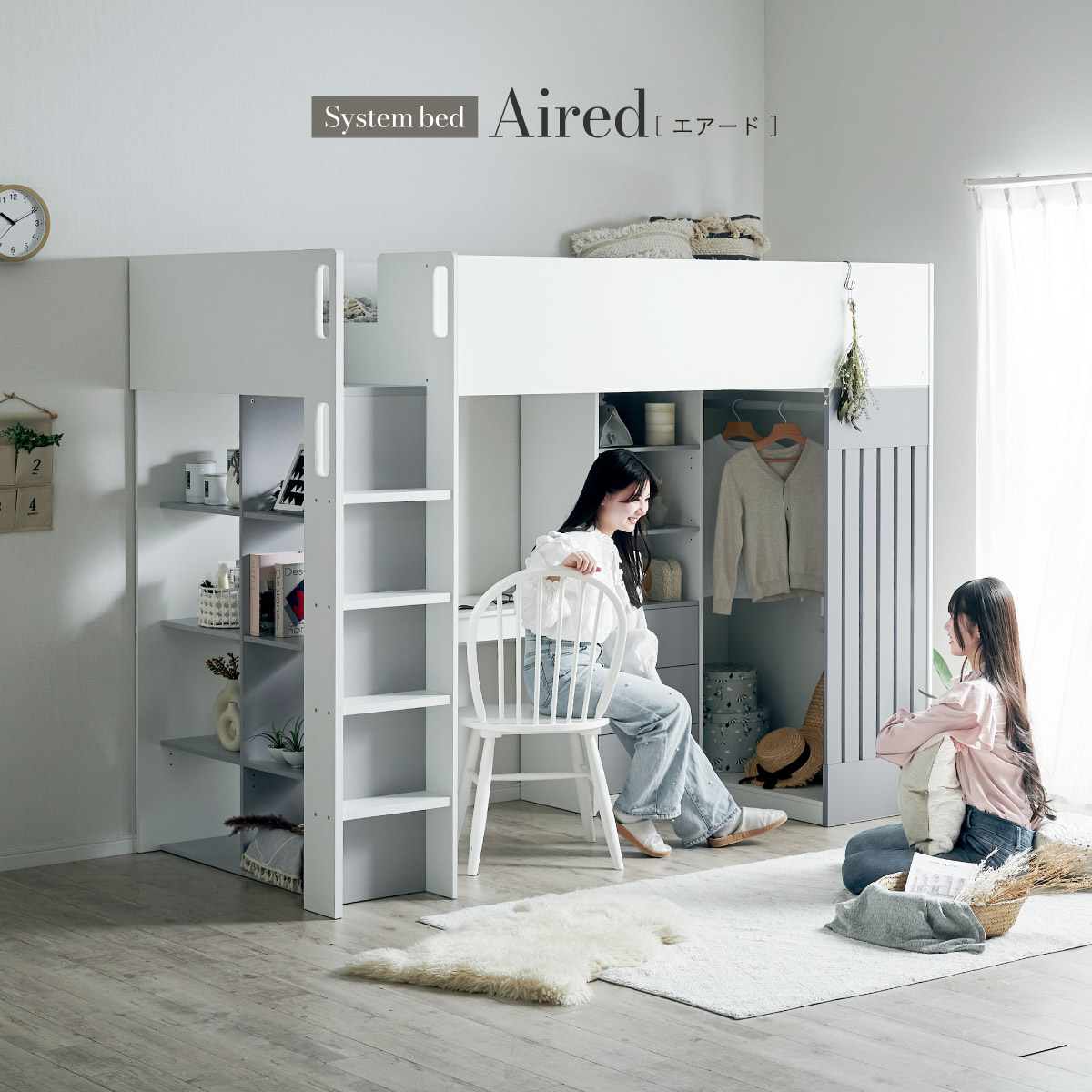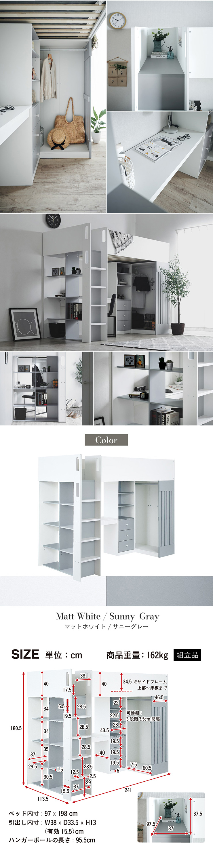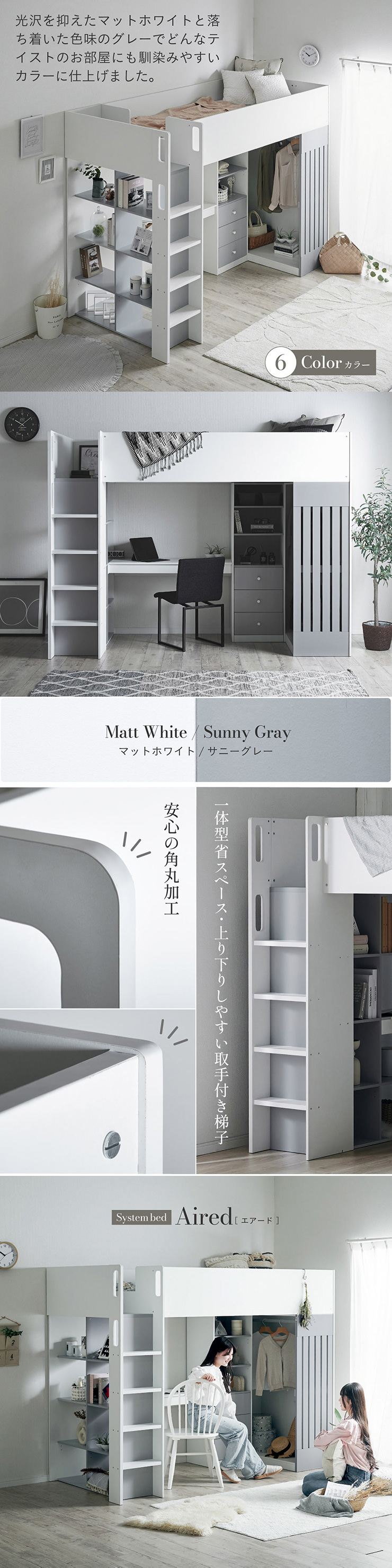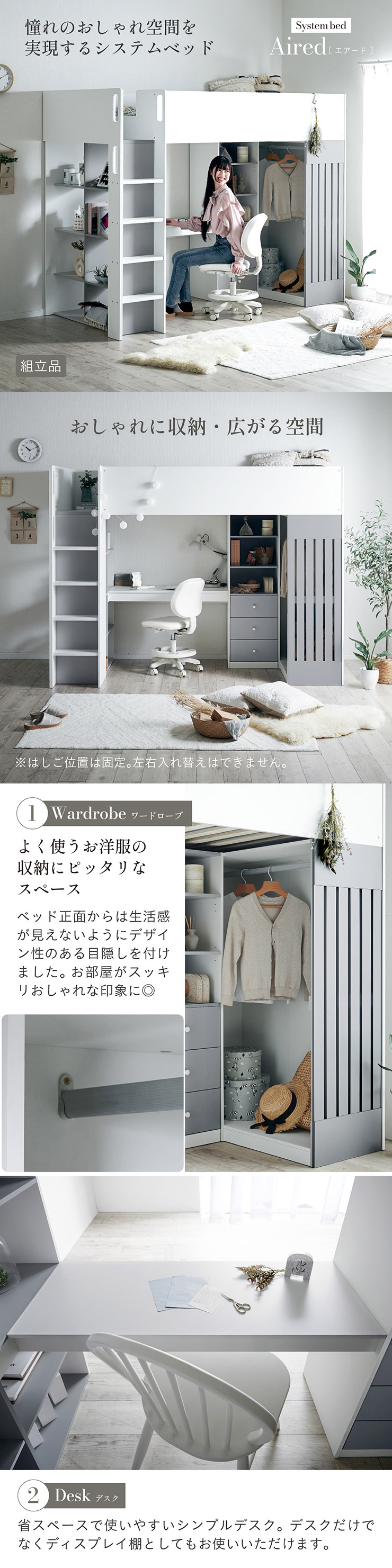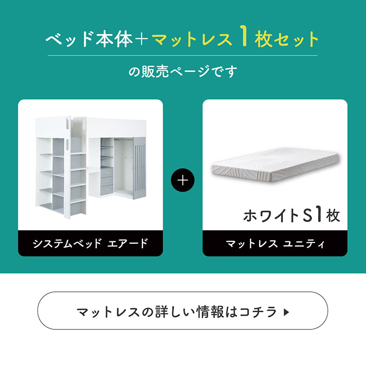 | System bed Aired(エアード) + Unity(ユニティ) ホワイト 憧れのおしゃれ空間を実現するシステムベッド ■ワードローブ よく使うお洋服の収納にピッタリなスペース。ベッド正面からは生活感が見えないようにデザイン性のある目隠しを付けました。 ■デスク 省スペースで使いやすいシンプルデスク。ディスプレイ棚としてもお使いいただけます。シェルフとデスク天板を同じ高さに揃えることで、作業スペースが増え、広々とご使用できます。 ■チェスト デスク周りをスッキリ収納できるオープン棚。2枚の棚板は3段階の可動式のため、入れるものに合わせて高さを調節できます。スライドレール付きなので開閉もスムーズに行えます。 ■シェルフ A4サイズの本も小物もたっぷり収納できる広々設計の大容量シェルフ。最下部の棚板は3段階の可動式になっており、収納する物に合わせて高さを調整できます。 ■高さのあるサイドフレームで安心 ■光沢を抑えたマットホワイトと落ち着いた色味のグレーでどんなテイストのお部屋にも馴染みやすいカラーに仕上げました。 ■安心の角丸加工 ■一体型省スペース・上り下りしやすい取っ手付き梯子 ※こちらの商品はお客様組み立てとなります。 ※耐荷重検査は静止耐荷重です。ベッドの上で激しく動く、急激な力を加える、飛び跳ねるなど、1点に集中して負荷をかける行為はお控えください。 ※組み立て方や若干の個体差によって、表記サイズと完成形のサイズに多少の誤差が生じる場合がございます。 ※はしごの位置は固定となります。左右の入れ替えはできません。 ※シェルフの最下部以外は固定棚になります。 ※こちらはシステムベッド+マットレス(ホワイト)のセット販売となります。チェア、ライト等は別売りとなります。 ※圧縮袋は一度開封すると再圧縮できません。 ※開封する際はハサミを使用し、ケガ等に十分気をつけながら行ってください。 ※開封後約1日~2日程度で本来の大きさに復元します。 ※本製品はウレタン製品のため、開封後すぐはウレタン特有のニオイがする場合がございます。ニオイがきつい場合は、ご使用の前に一度陰干ししてニオイを飛ばしてからご使用くださいますようお願いいたします。 ※臭いは新品のウレタン特有のもので無害です。 ※直射日光はウレタンの変色を促す恐れがあるためお避けください。 ※カバーを洗濯する時は、洗濯ネットに入れてください。 ※マットレスは片面仕様です。裏返してご使用はできません。 ※計測の仕方や、ロットによりサイズに多少の誤差が生じる場合がございます。予めご了承ください。 ※商品のデザイン、仕様、外観、価格は予告なく変更する場合があります。 ※商品写真はできる限り実物の色に近づけるよう徹底しておりますが、お使いのモニター設定、お部屋の照明、製造ロット等により実際の商品と若干色味が異なる場合がございますので予めご了承ください。 | |