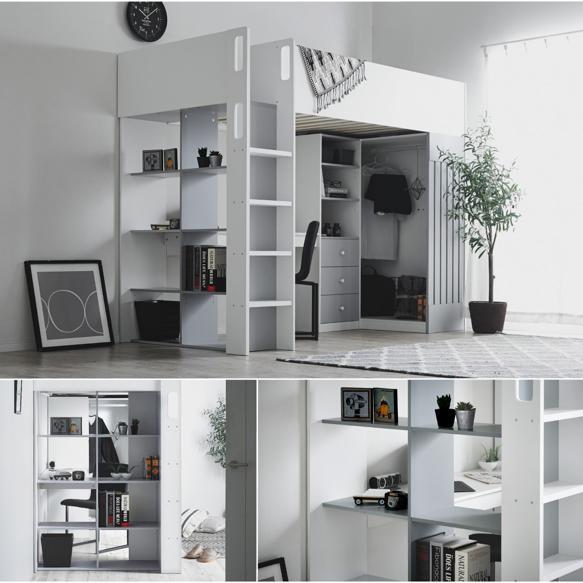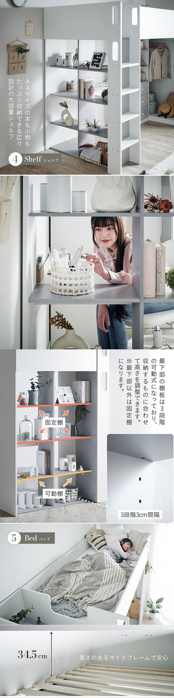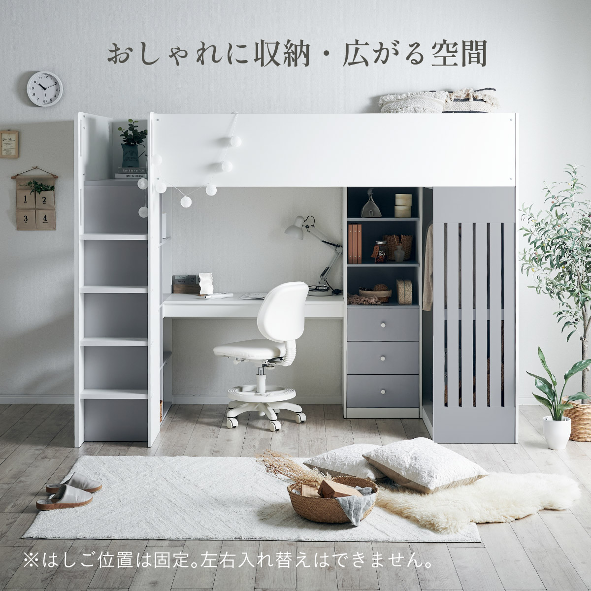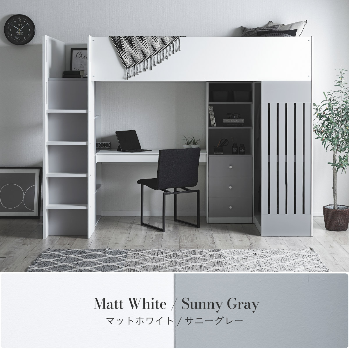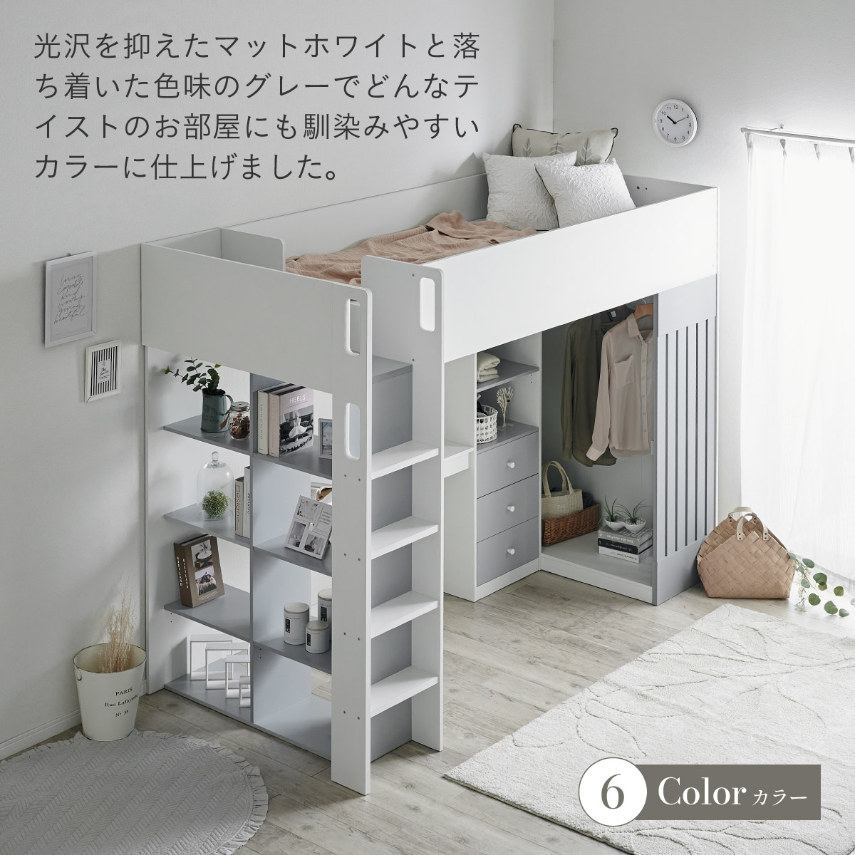 | System bed Aired(エアード) + Unity(ユニティ) ホワイト 憧れのおしゃれ空間を実現するシステムベッド ■ワードローブ よく使うお洋服の収納にピッタリなスペース。ベッド正面からは生活感が見えないようにデザイン性のある目隠しを付けました。 ■デスク 省スペースで使いやすいシンプルデスク。ディスプレイ棚としてもお使いいただけます。シェルフとデスク天板を同じ高さに揃えることで、作業スペースが増え、広々とご使用できます。 ■チェスト デスク周りをスッキリ収納できるオープン棚。2枚の棚板は3段階の可動式のため、入れるものに合わせて高さを調節できます。スライドレール付きなので開閉もスムーズに行えます。 ■シェルフ A4サイズの本も小物もたっぷり収納できる広々設計の大容量シェルフ。最下部の棚板は3段階の可動式になっており、収納する物に合わせて高さを調整できます。 ■高さのあるサイドフレームで安心 ■光沢を抑えたマットホワイトと落ち着いた色味のグレーでどんなテイストのお部屋にも馴染みやすいカラーに仕上げました。 ■安心の角丸加工 ■一体型省スペース・上り下りしやすい取っ手付き梯子 ※こちらの商品はお客様組み立てとなります。 ※耐荷重検査は静止耐荷重です。ベッドの上で激しく動く、急激な力を加える、飛び跳ねるなど、1点に集中して負荷をかける行為はお控えください。 ※組み立て方や若干の個体差によって、表記サイズと完成形のサイズに多少の誤差が生じる場合がございます。 ※はしごの位置は固定となります。左右の入れ替えはできません。 ※シェルフの最下部以外は固定棚になります。 ※こちらはシステムベッド+マットレス(ホワイト)のセット販売となります。チェア、ライト等は別売りとなります。 ※圧縮袋は一度開封すると再圧縮できません。 ※開封する際はハサミを使用し、ケガ等に十分気をつけながら行ってください。 ※開封後約1日~2日程度で本来の大きさに復元します。 ※本製品はウレタン製品のため、開封後すぐはウレタン特有のニオイがする場合がございます。ニオイがきつい場合は、ご使用の前に一度陰干ししてニオイを飛ばしてからご使用くださいますようお願いいたします。 ※臭いは新品のウレタン特有のもので無害です。 ※直射日光はウレタンの変色を促す恐れがあるためお避けください。 ※カバーを洗濯する時は、洗濯ネットに入れてください。 ※マットレスは片面仕様です。裏返してご使用はできません。 ※計測の仕方や、ロットによりサイズに多少の誤差が生じる場合がございます。予めご了承ください。 ※商品のデザイン、仕様、外観、価格は予告なく変更する場合があります。 ※商品写真はできる限り実物の色に近づけるよう徹底しておりますが、お使いのモニター設定、お部屋の照明、製造ロット等により実際の商品と若干色味が異なる場合がございますので予めご了承ください。 | |