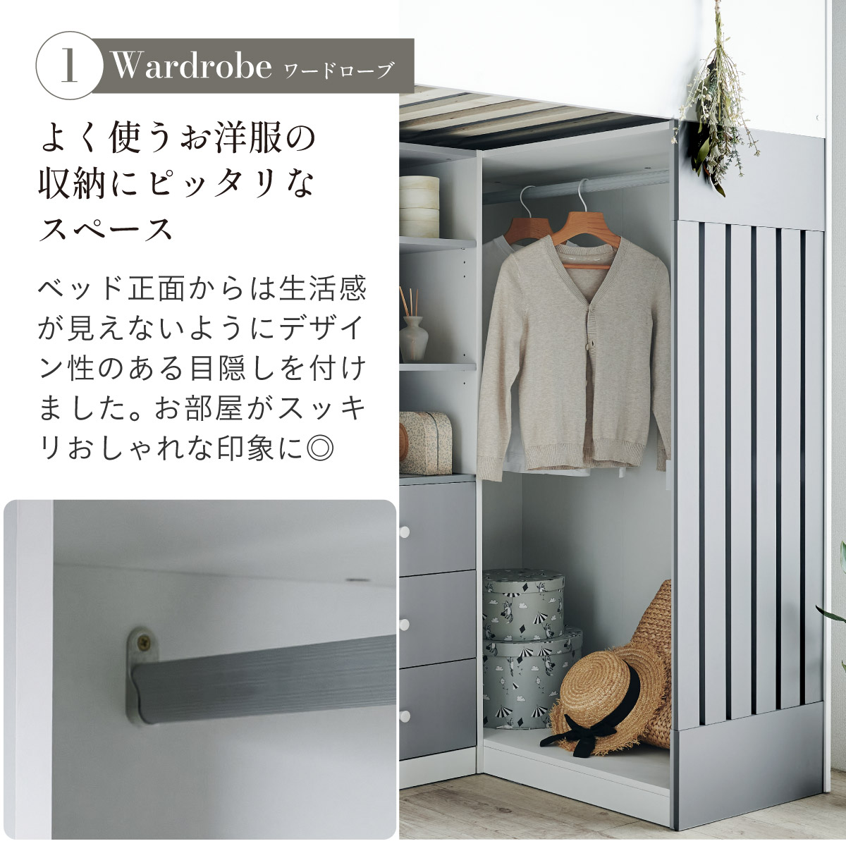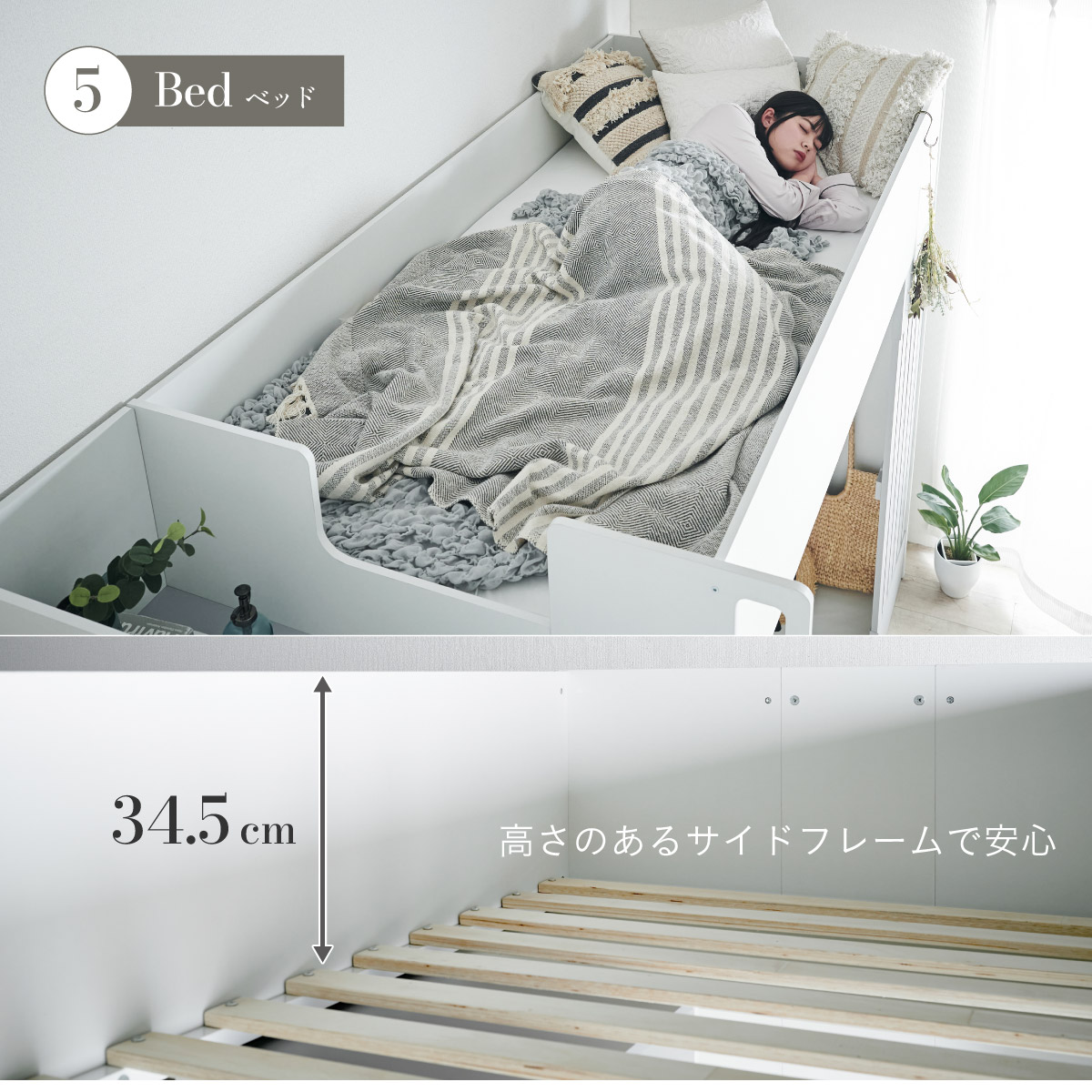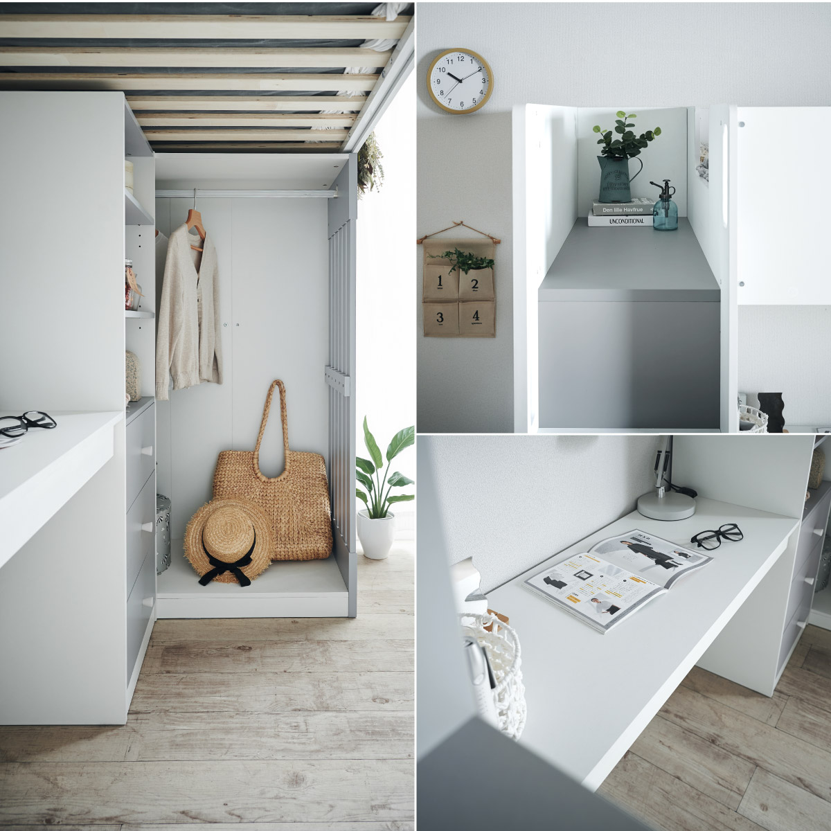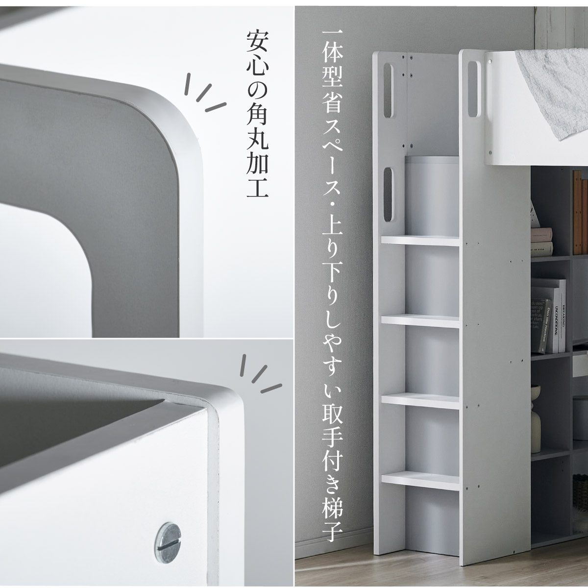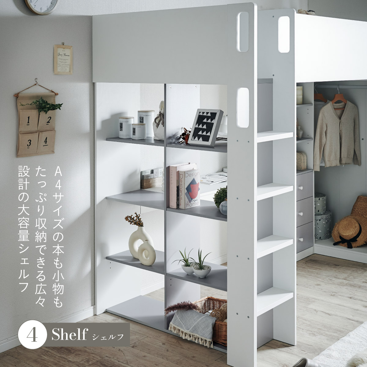 | System bed Aired(エアード) + Unity(ユニティ) ホワイト 憧れのおしゃれ空間を実現するシステムベッド ■ワードローブ よく使うお洋服の収納にピッタリなスペース。ベッド正面からは生活感が見えないようにデザイン性のある目隠しを付けました。 ■デスク 省スペースで使いやすいシンプルデスク。ディスプレイ棚としてもお使いいただけます。シェルフとデスク天板を同じ高さに揃えることで、作業スペースが増え、広々とご使用できます。 ■チェスト デスク周りをスッキリ収納できるオープン棚。2枚の棚板は3段階の可動式のため、入れるものに合わせて高さを調節できます。スライドレール付きなので開閉もスムーズに行えます。 ■シェルフ A4サイズの本も小物もたっぷり収納できる広々設計の大容量シェルフ。最下部の棚板は3段階の可動式になっており、収納する物に合わせて高さを調整できます。 ■高さのあるサイドフレームで安心 ■光沢を抑えたマットホワイトと落ち着いた色味のグレーでどんなテイストのお部屋にも馴染みやすいカラーに仕上げました。 ■安心の角丸加工 ■一体型省スペース・上り下りしやすい取っ手付き梯子 ※こちらの商品はお客様組み立てとなります。 ※耐荷重検査は静止耐荷重です。ベッドの上で激しく動く、急激な力を加える、飛び跳ねるなど、1点に集中して負荷をかける行為はお控えください。 ※組み立て方や若干の個体差によって、表記サイズと完成形のサイズに多少の誤差が生じる場合がございます。 ※はしごの位置は固定となります。左右の入れ替えはできません。 ※シェルフの最下部以外は固定棚になります。 ※こちらはシステムベッド+マットレス(ホワイト)のセット販売となります。チェア、ライト等は別売りとなります。 ※圧縮袋は一度開封すると再圧縮できません。 ※開封する際はハサミを使用し、ケガ等に十分気をつけながら行ってください。 ※開封後約1日~2日程度で本来の大きさに復元します。 ※本製品はウレタン製品のため、開封後すぐはウレタン特有のニオイがする場合がございます。ニオイがきつい場合は、ご使用の前に一度陰干ししてニオイを飛ばしてからご使用くださいますようお願いいたします。 ※臭いは新品のウレタン特有のもので無害です。 ※直射日光はウレタンの変色を促す恐れがあるためお避けください。 ※カバーを洗濯する時は、洗濯ネットに入れてください。 ※マットレスは片面仕様です。裏返してご使用はできません。 ※計測の仕方や、ロットによりサイズに多少の誤差が生じる場合がございます。予めご了承ください。 ※商品のデザイン、仕様、外観、価格は予告なく変更する場合があります。 ※商品写真はできる限り実物の色に近づけるよう徹底しておりますが、お使いのモニター設定、お部屋の照明、製造ロット等により実際の商品と若干色味が異なる場合がございますので予めご了承ください。 | |
