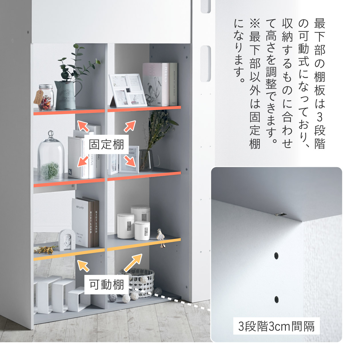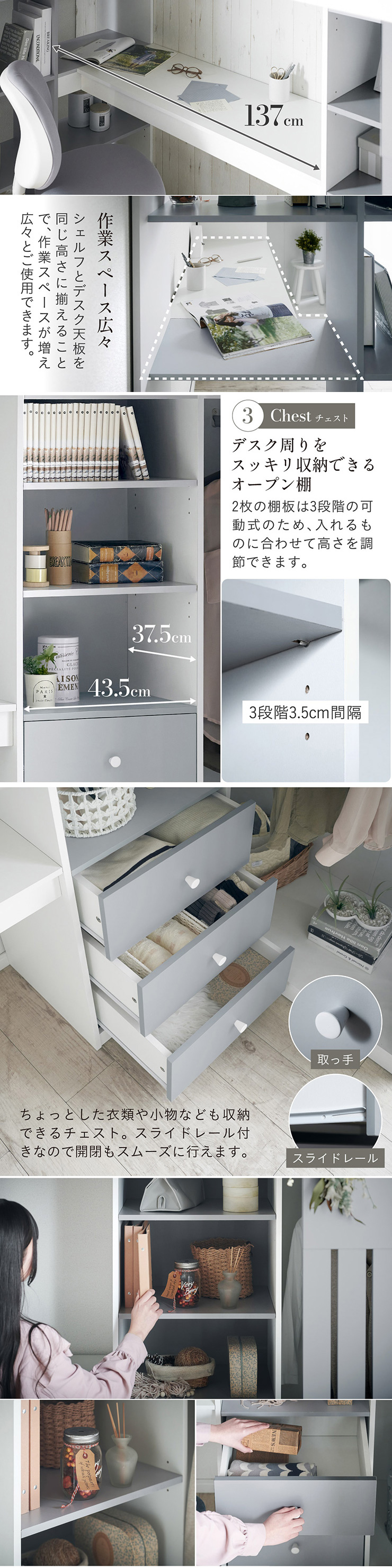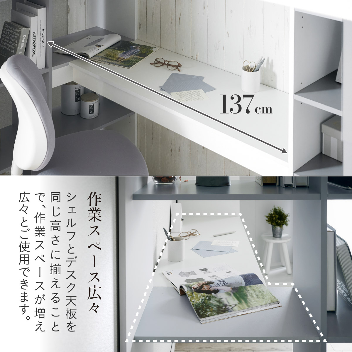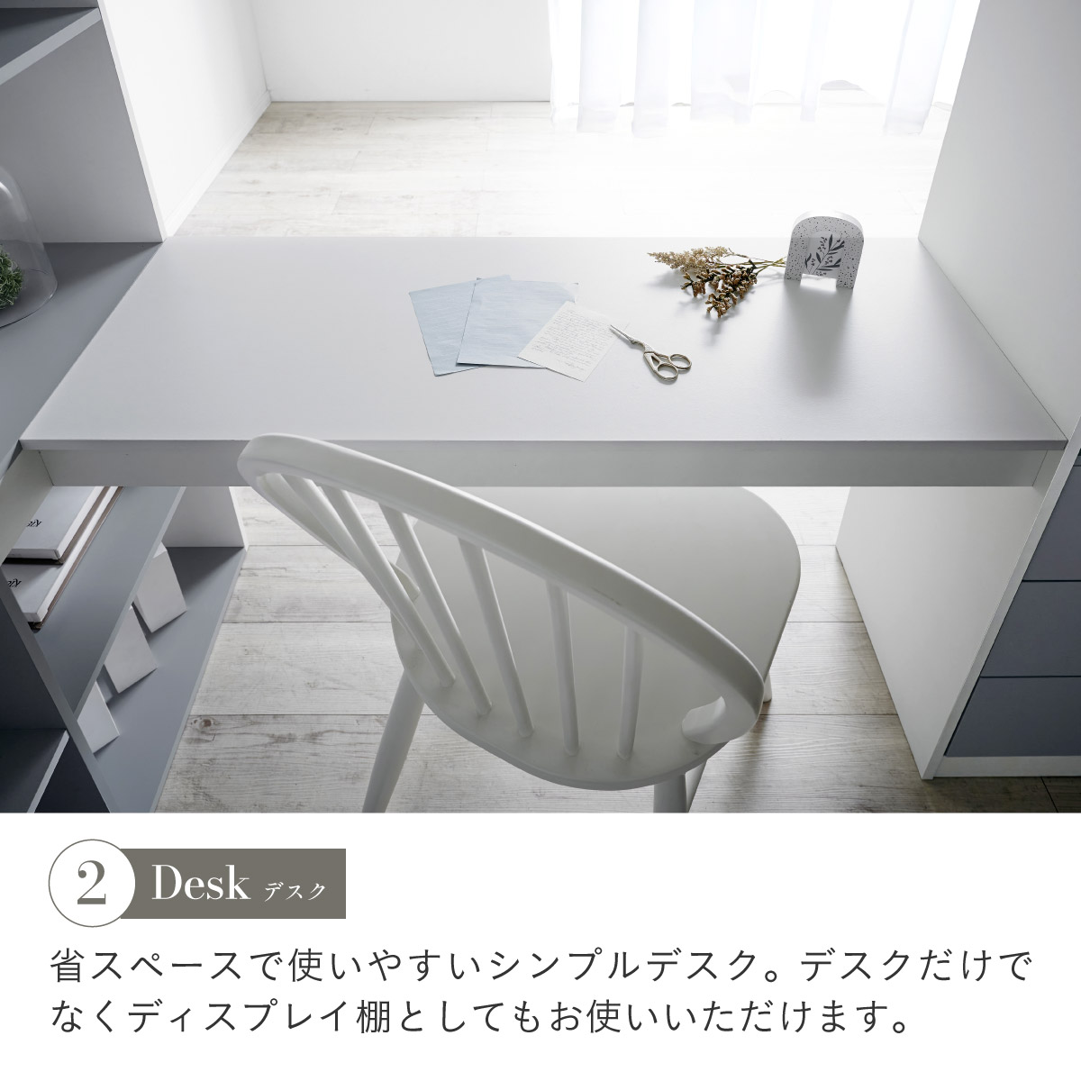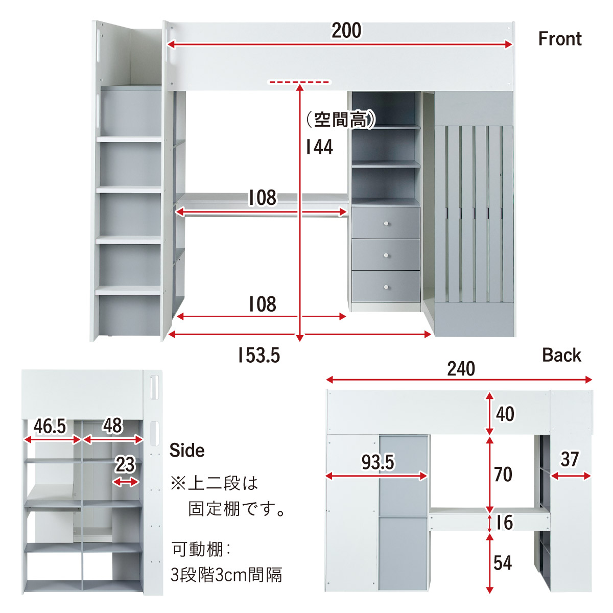 | System bed Aired(エアード) + Unity(ユニティ) ホワイト 憧れのおしゃれ空間を実現するシステムベッド ■ワードローブ よく使うお洋服の収納にピッタリなスペース。ベッド正面からは生活感が見えないようにデザイン性のある目隠しを付けました。 ■デスク 省スペースで使いやすいシンプルデスク。ディスプレイ棚としてもお使いいただけます。シェルフとデスク天板を同じ高さに揃えることで、作業スペースが増え、広々とご使用できます。 ■チェスト デスク周りをスッキリ収納できるオープン棚。2枚の棚板は3段階の可動式のため、入れるものに合わせて高さを調節できます。スライドレール付きなので開閉もスムーズに行えます。 ■シェルフ A4サイズの本も小物もたっぷり収納できる広々設計の大容量シェルフ。最下部の棚板は3段階の可動式になっており、収納する物に合わせて高さを調整できます。 ■高さのあるサイドフレームで安心 ■光沢を抑えたマットホワイトと落ち着いた色味のグレーでどんなテイストのお部屋にも馴染みやすいカラーに仕上げました。 ■安心の角丸加工 ■一体型省スペース・上り下りしやすい取っ手付き梯子 ※こちらの商品はお客様組み立てとなります。 ※耐荷重検査は静止耐荷重です。ベッドの上で激しく動く、急激な力を加える、飛び跳ねるなど、1点に集中して負荷をかける行為はお控えください。 ※組み立て方や若干の個体差によって、表記サイズと完成形のサイズに多少の誤差が生じる場合がございます。 ※はしごの位置は固定となります。左右の入れ替えはできません。 ※シェルフの最下部以外は固定棚になります。 ※こちらはシステムベッド+マットレス(ホワイト)のセット販売となります。チェア、ライト等は別売りとなります。 ※圧縮袋は一度開封すると再圧縮できません。 ※開封する際はハサミを使用し、ケガ等に十分気をつけながら行ってください。 ※開封後約1日~2日程度で本来の大きさに復元します。 ※本製品はウレタン製品のため、開封後すぐはウレタン特有のニオイがする場合がございます。ニオイがきつい場合は、ご使用の前に一度陰干ししてニオイを飛ばしてからご使用くださいますようお願いいたします。 ※臭いは新品のウレタン特有のもので無害です。 ※直射日光はウレタンの変色を促す恐れがあるためお避けください。 ※カバーを洗濯する時は、洗濯ネットに入れてください。 ※マットレスは片面仕様です。裏返してご使用はできません。 ※計測の仕方や、ロットによりサイズに多少の誤差が生じる場合がございます。予めご了承ください。 ※商品のデザイン、仕様、外観、価格は予告なく変更する場合があります。 ※商品写真はできる限り実物の色に近づけるよう徹底しておりますが、お使いのモニター設定、お部屋の照明、製造ロット等により実際の商品と若干色味が異なる場合がございますので予めご了承ください。 | |