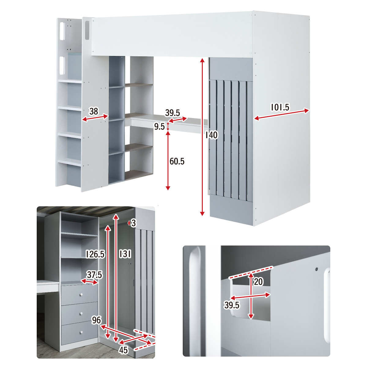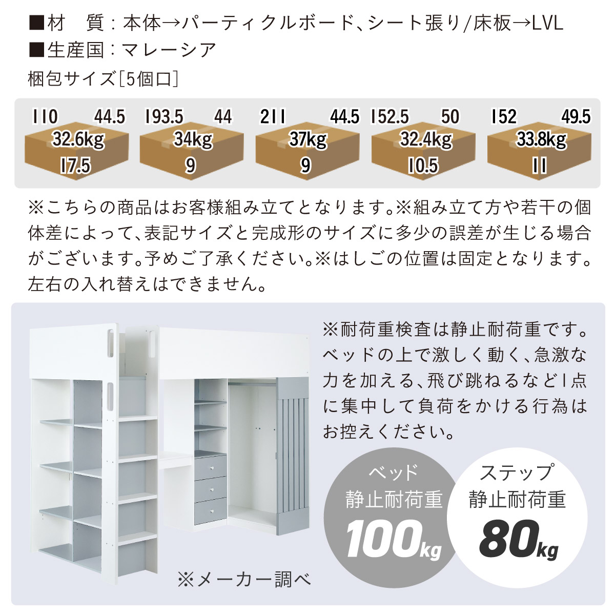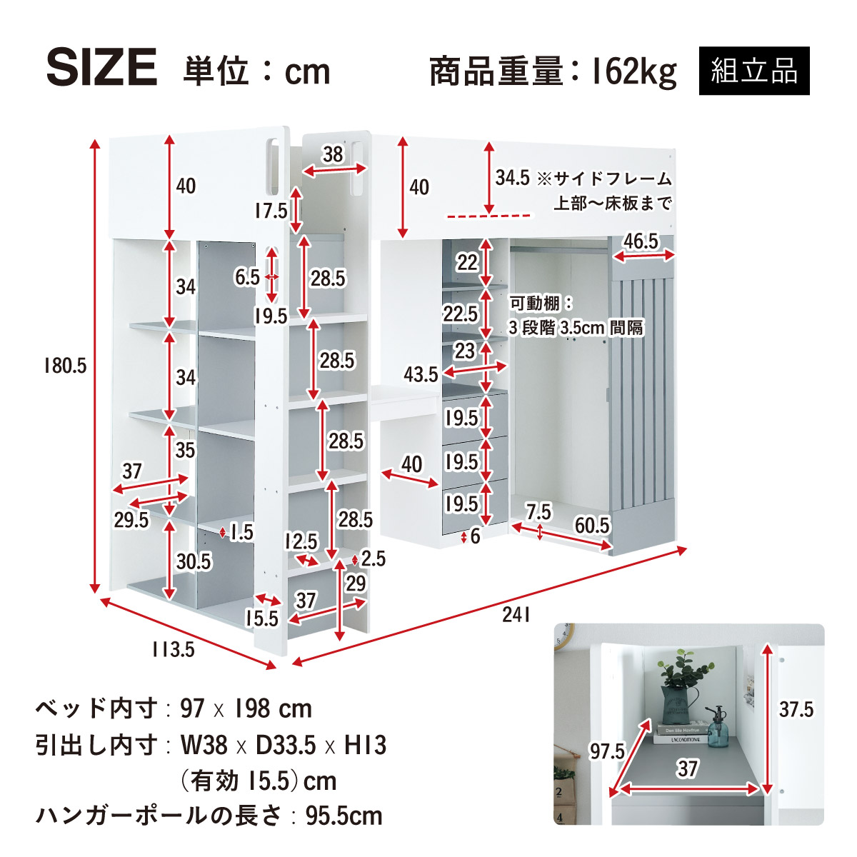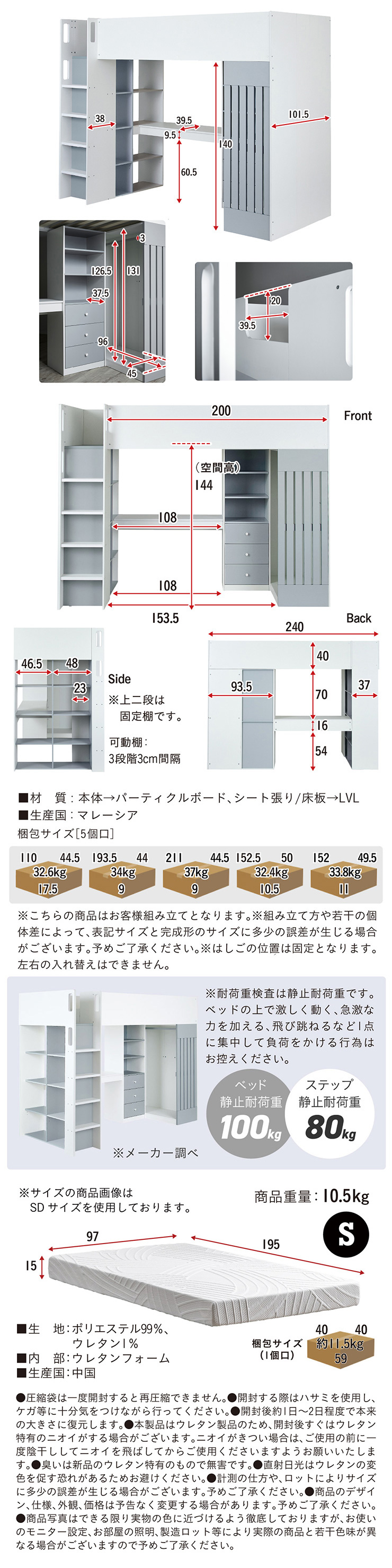 | サイズ | 全体:W241 x D113.5 x H180.5cm(重量:162kg) ベッド内寸:97 x 198cm 引き出し内寸:W38 x D33.5 x H13cm(有効15.5cm) ハンガーポールの長さ:95.5cm デスク:W108 x D39.5 x H70cm マットレス:W97 x D195 x H15cm(重量:10.5kg) 梱包サイズ(6個口):110 x 44.5 x 17.5cm(重量:32.6kg)・193.5 x 44 x 9cm(重量:34kg)・211 x 44.5 x 9cm(重量:37kg)・152.5 x 50 x 10.5(重量:32.4kg)・152 x 49.5 x 11(重量:33.8kg)・40 x 40 x 59cm(重量:11.5kg) |