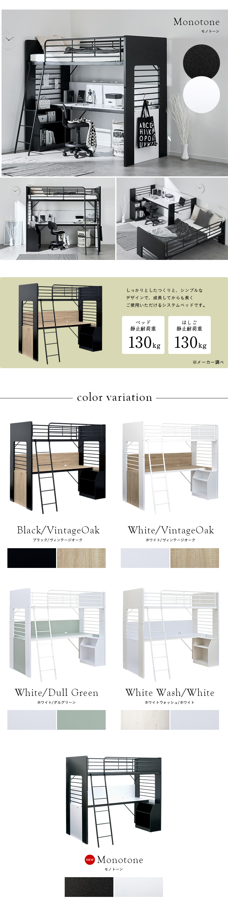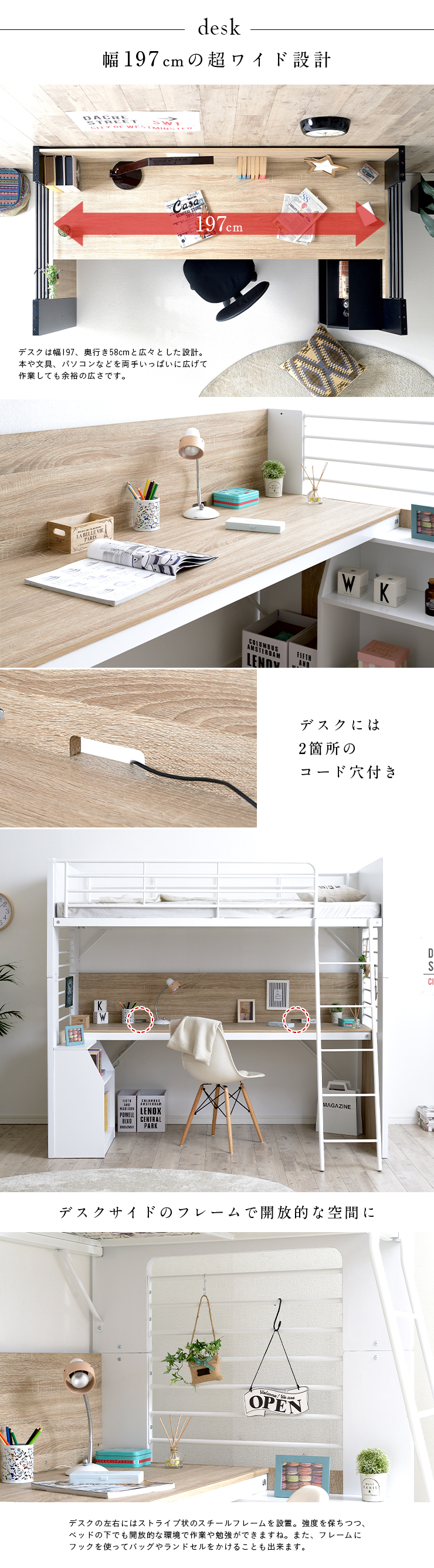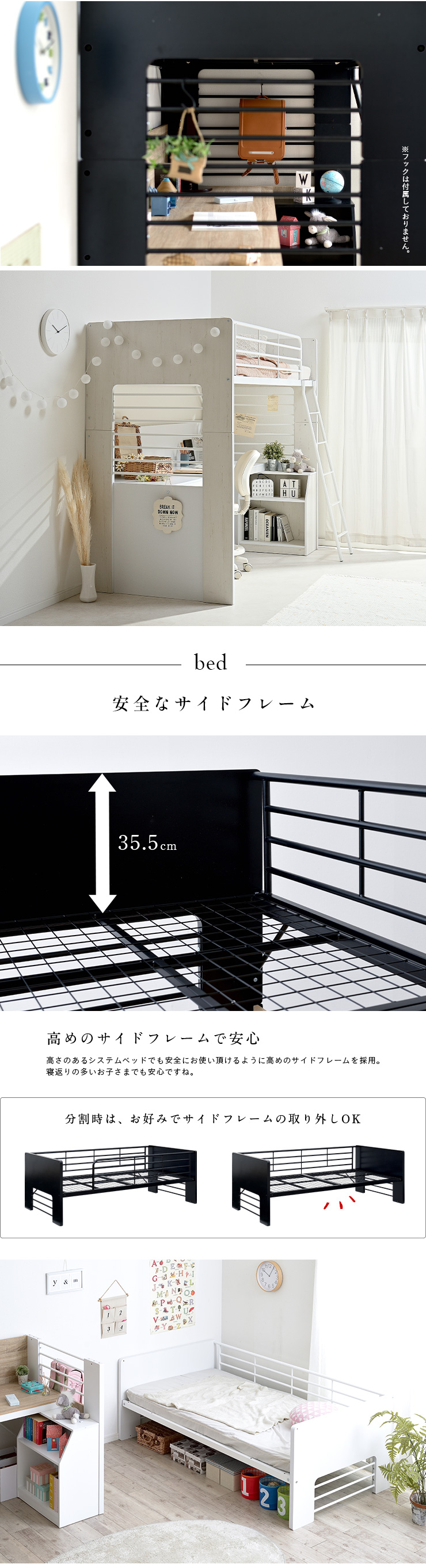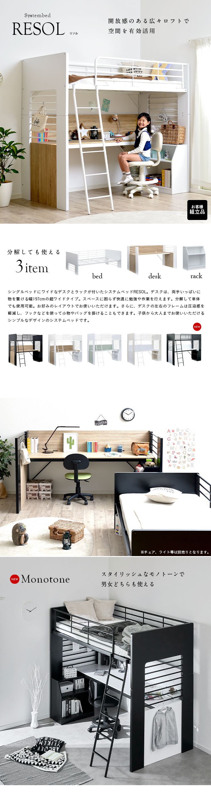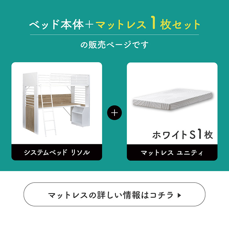 | ワイドなデスクで作業快適 Systembed RESOL(リソル) + Unity(ユニティ) ホワイト シングルベッドにワイドなデスクとラックが付いたシステムベッドRESOL。デスクは両手いっぱいに物を置ける幅197cmの超ワイドタイプ。スペースに困らず快適に作業や勉強をすることが出来ます。付属のラックはデスクに固定することも独立して使うこともでき、お好みのレイアウトを楽しむことが出来ます。さらに、デスクの左右のフレームには小物やバッグを掛けることも可能。子供から大人までお使いいただけるシンプルなデザインのシステムベッドです。 ■Desk 幅197cmの超ワイド設計 デスクは197x58cmの広々とした設計。本や文具、パソコンなどを両手いっぱいに広げることができます。デスクサイドのフレームで開放的な空間にデスクの左右にはストライプ状のスチールフレームを設置。ベッドの下でも開放的な環境で作業や勉強ができますね。また、フレームにはフックを使ってバッグやランドセルをかけることも出来ます。 ■Bed 安全なサイドフレームと快適なメッシュの床板 高さのあるシステムベッドでも安全にお使い頂けるように高めのサイドフレームを採用。寝返りの多いお子さまでも安心ですね。床板にはスチール製のメッシュ床を採用。通気性がよく、マットレスに湿気がこもるのを防ぎます。 ■Rack 散らかりがちな小物もしっかり収納 デスクサイドには、本や小物をしまえるオープンなラックをつけました。デスクに固定して使うことはもちろん、分割してラック単体でもお使いいただけます。 ※安全上の理由により、ロフトベッドとしてご使用の際は必ずデスクとラックを固定した状態でご使用いただきますようお願いいたします。 ※こちらの商品はお客様組立となります。 ※床板の仕様を随時変更しています。【変更前】メッシュボード→【変更後】→LVLボード ※こちらはシステムベッド+マットレス(ホワイト)のセット販売となります。チェア、ライト等は別売りとなります。 ※開封する際はハサミを使用し、ケガ等に十分気をつけながら行ってください。 ※開封後約1日~2日程度で本来の大きさに復元します。 ※本製品はウレタン製品のため、開封後すぐはウレタン特有のニオイがする場合がございます。ニオイがきつい場合は、ご使用の前に一度陰干ししてニオイを飛ばしてからご使用くださいますようお願いいたします。 ※臭いは新品のウレタン特有のもので無害です。 ※直射日光はウレタンの変色を促す恐れがあるためお避けください。 ※カバーを洗濯する時は、洗濯ネットに入れてください。 ※マットレスは片面仕様です。裏返してご使用はできません。 ※計測の仕方や、ロットによりサイズに多少の誤差が生じる場合がございます。予めご了承ください。 ※商品のデザイン、仕様、外観、価格は予告なく変更する場合があります。 ※商品写真はできる限り実物の色に近づけるよう徹底しておりますが、お使いのモニター設定、お部屋の照明、製造ロット等により実際の商品と若干色味が異なる場合がございますので予めご了承ください。 | |