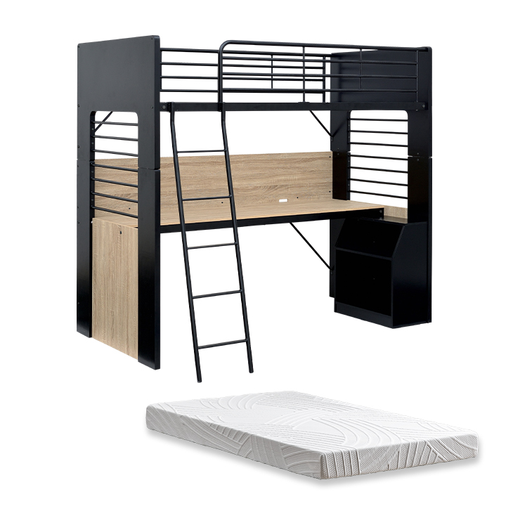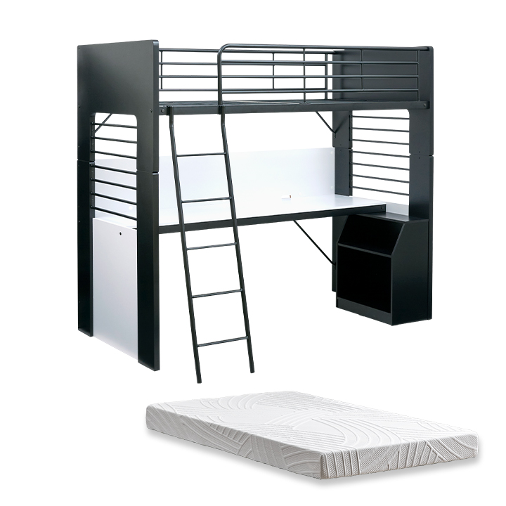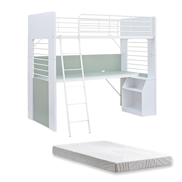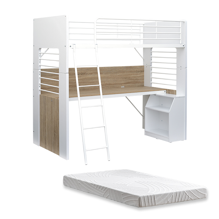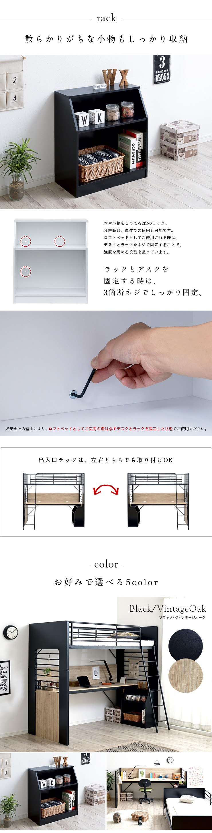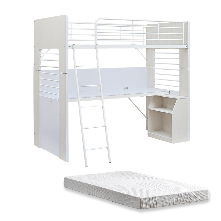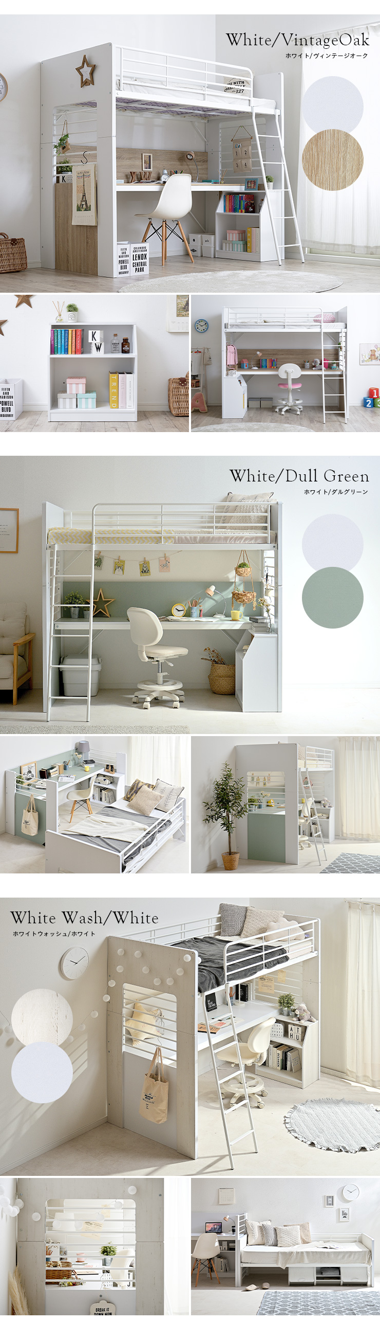 | ワイドなデスクで作業快適 Systembed RESOL(リソル) + Unity(ユニティ) ホワイト シングルベッドにワイドなデスクとラックが付いたシステムベッドRESOL。デスクは両手いっぱいに物を置ける幅197cmの超ワイドタイプ。スペースに困らず快適に作業や勉強をすることが出来ます。付属のラックはデスクに固定することも独立して使うこともでき、お好みのレイアウトを楽しむことが出来ます。さらに、デスクの左右のフレームには小物やバッグを掛けることも可能。子供から大人までお使いいただけるシンプルなデザインのシステムベッドです。 ■Desk 幅197cmの超ワイド設計 デスクは197x58cmの広々とした設計。本や文具、パソコンなどを両手いっぱいに広げることができます。デスクサイドのフレームで開放的な空間にデスクの左右にはストライプ状のスチールフレームを設置。ベッドの下でも開放的な環境で作業や勉強ができますね。また、フレームにはフックを使ってバッグやランドセルをかけることも出来ます。 ■Bed 安全なサイドフレームと快適なメッシュの床板 高さのあるシステムベッドでも安全にお使い頂けるように高めのサイドフレームを採用。寝返りの多いお子さまでも安心ですね。床板にはスチール製のメッシュ床を採用。通気性がよく、マットレスに湿気がこもるのを防ぎます。 ■Rack 散らかりがちな小物もしっかり収納 デスクサイドには、本や小物をしまえるオープンなラックをつけました。デスクに固定して使うことはもちろん、分割してラック単体でもお使いいただけます。 ※安全上の理由により、ロフトベッドとしてご使用の際は必ずデスクとラックを固定した状態でご使用いただきますようお願いいたします。 ※こちらの商品はお客様組立となります。 ※床板の仕様を随時変更しています。【変更前】メッシュボード→【変更後】→LVLボード ※こちらはシステムベッド+マットレス(ホワイト)のセット販売となります。チェア、ライト等は別売りとなります。 ※開封する際はハサミを使用し、ケガ等に十分気をつけながら行ってください。 ※開封後約1日~2日程度で本来の大きさに復元します。 ※本製品はウレタン製品のため、開封後すぐはウレタン特有のニオイがする場合がございます。ニオイがきつい場合は、ご使用の前に一度陰干ししてニオイを飛ばしてからご使用くださいますようお願いいたします。 ※臭いは新品のウレタン特有のもので無害です。 ※直射日光はウレタンの変色を促す恐れがあるためお避けください。 ※カバーを洗濯する時は、洗濯ネットに入れてください。 ※マットレスは片面仕様です。裏返してご使用はできません。 ※計測の仕方や、ロットによりサイズに多少の誤差が生じる場合がございます。予めご了承ください。 ※商品のデザイン、仕様、外観、価格は予告なく変更する場合があります。 ※商品写真はできる限り実物の色に近づけるよう徹底しておりますが、お使いのモニター設定、お部屋の照明、製造ロット等により実際の商品と若干色味が異なる場合がございますので予めご了承ください。 | |