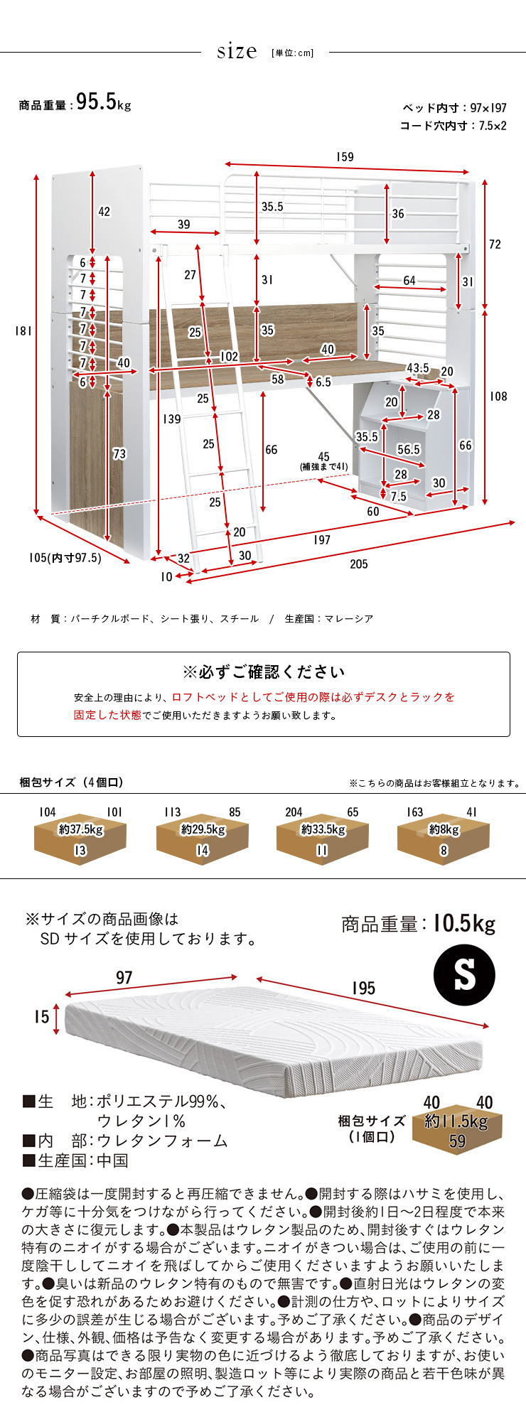 | サイズ | 全体:W205 x D105 x H181cm(重量:95.5kg) ベッド内寸:197 x 97cm 天板広さ:W197 x D58cm ラック単体:W60 x D30 x H28cm マットレス:W97 x D195 x H15cm(重量:10.5kg) 梱包サイズ(5個口):104 x 101 x 13cm(重量:37.5kg)・113 x 85 x 14cm(重量:29.5kg)・204 x 65 x 11cm(重量:33.5kg)・163 x 41 x 8(重量:8kg)・40 x 40 x 59cm(重量:11.5kg) |
