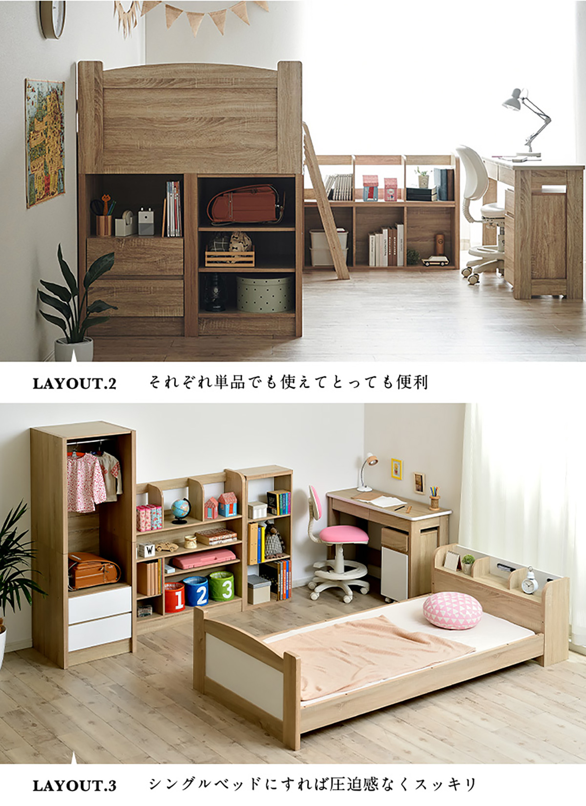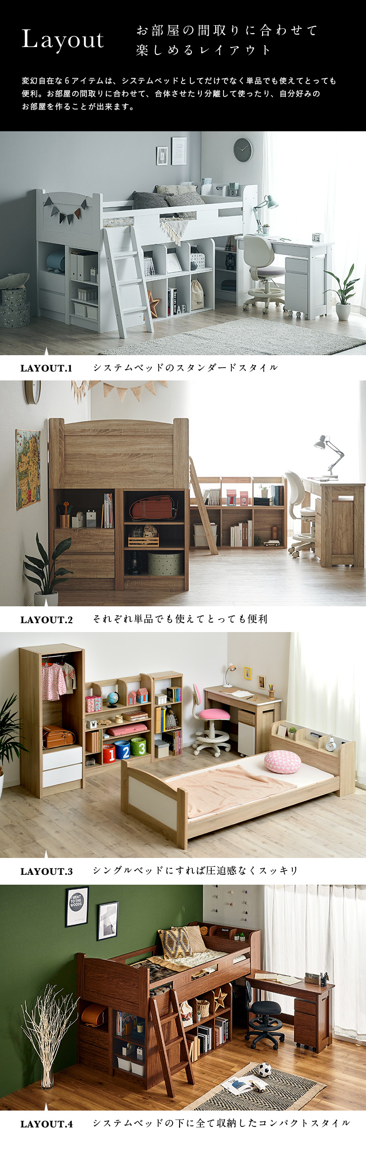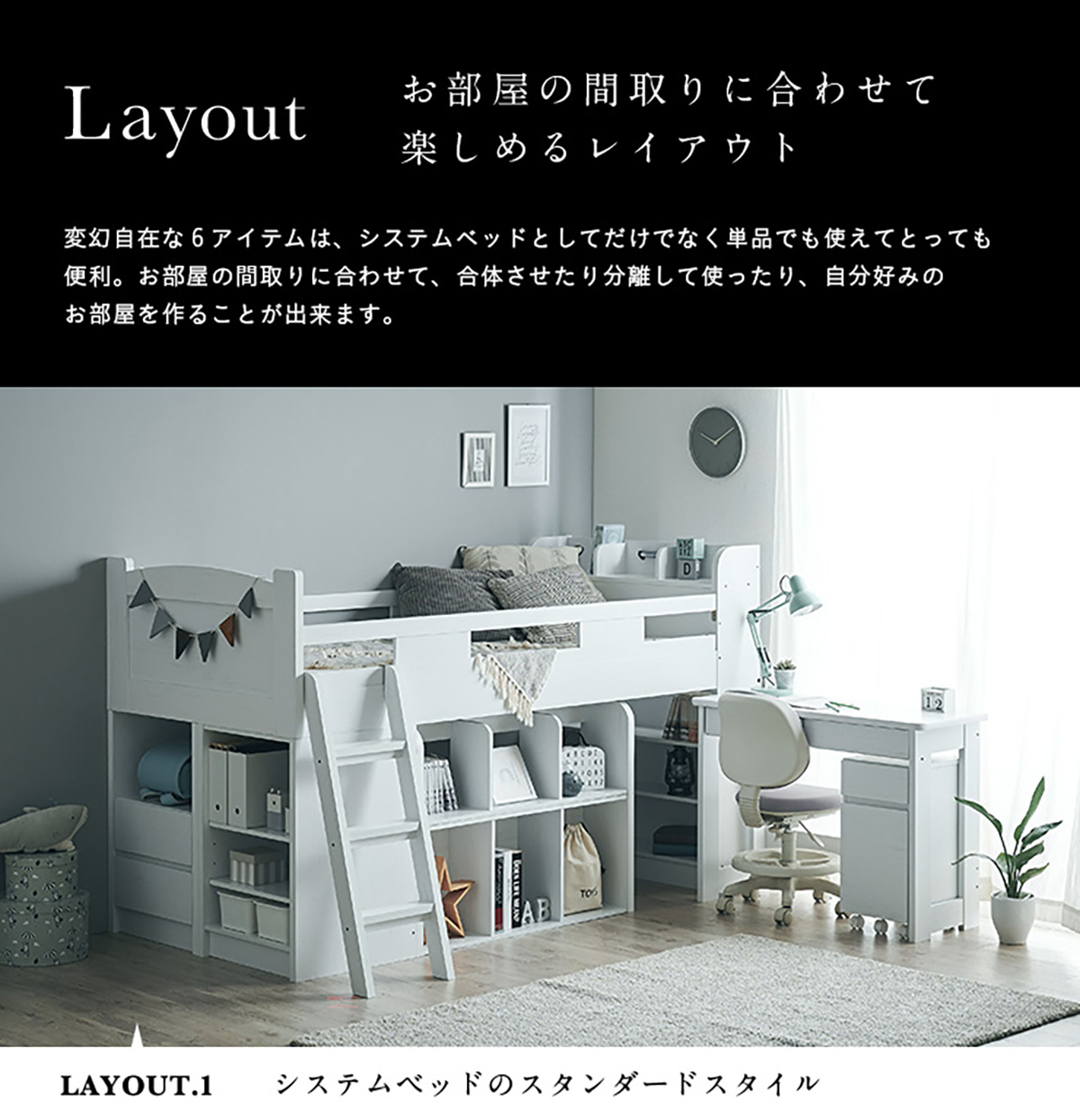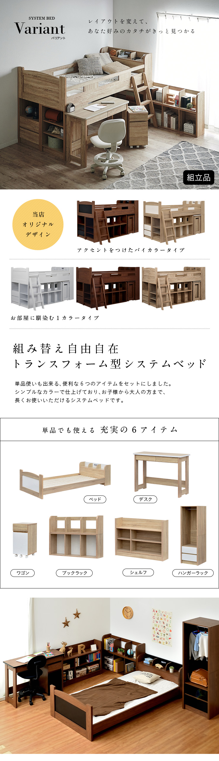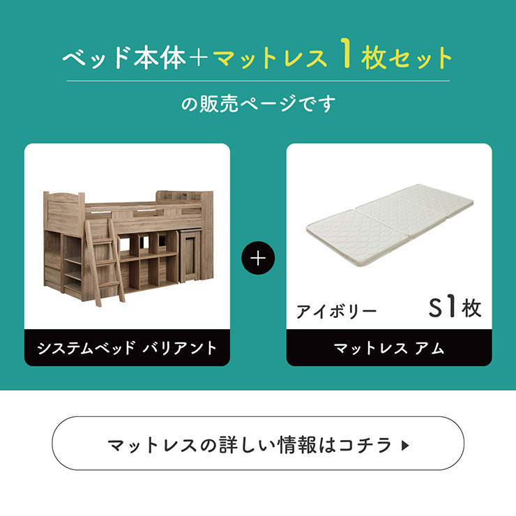 | トランスフォームでレイアウト自由自在 システムベッド VARIANT(バリアント) + ココナッツパームマットS am(アム) 当店で企画・設計をしたオリジナルシステムベッド、バリアント。 システムベッドの魅力は、限られた空間を有効活用できること。単品使いもできる、便利な6つのアイテムをセットにしました。自由なレイアウトで、自分好みのお部屋に。シンプルなカラーで仕上げており、お子様から大人の方まで、長くお使いいただけるシステムベッドです。 ■Layout お部屋の間取りに合わせて楽しめるレイアウト 変幻自在な6アイテムは、システムベッドとしてだけでなく単品でも使えてとっても便利。お部屋の間取りに合わせて、自分好みのお部屋を作ることが出来ます。 ■Function 使いやすさにこだわった6アイテム ○Bed 便利な宮棚、LED照明やコンセントが付いたベッド。ベッド下には、たっぷり入る収納スペースをつけました。組み換えれば、シングルベッドとしてもお使いいただけます。 ○Desk 長くお使いいただけるよう、シンプルなデザインのデスクに仕上げました。デスクには2杯の引き出し付き。スライドレールで開閉ラクラクです。ノートや色鉛筆などのよく使うものをしまっておくのにピッタリ。 ○Wagon キャスター付きのスリムなワゴン。ワゴンには、小物やファイルが入る2段の引き出しを付けました。引き出し全てにスライドレールが付いており、お子様でもラクに開閉が行えます。 ○Bookrack 縦でも、横でも、分割しても使えるブックラック。本や小物を収納したり、ディスプレイとしても使えるブックラック。上下を切り離せばそれぞれ独立してもお使いいただけます。 ○shelf 使い方いろいろ、大容量収納で整理整頓。本や雑貨など整理整頓に活躍するシェルフ。2枚の棚板は、収納するのに合わせて3段階で高さ調節が可能。また、ブックラック上段と連結してもご使用いただけます。 ○Hanger Rack ハンガーラックには2段の引き出し付き。衣類やおもちゃなどを収納することが出来ます。こちらもスライドレールが付いておりますので、開閉がスムーズです。 付属の棚板を取り付けることで可動棚としてもお使いいただけます。置くものに合わせて6.5cm間隔6段階で高さ調節もできるので、とても便利です。 ■Design ずっと使えるシンプルデザイン 飽きのこないシンプルなデザインに仕上げました。お子様から大人の方まで幅広くお使いいただけます。 ■Safety 快適に過ごせる安全設計 元気いっぱいなお子様も安心してお使いいただけるように、角には全て丸みをつけました。 ※当店オリジナルの企画・設計・製作です。類似品にご注意ください。 ※こちらの商品はお客様組み立てとなります。 ※システムベッド+マットレスのセット販売となります。 ※シングルベッド時、サイドフレームは取り付けできません。 ※ワゴンの引き出しにA4サイズは入りません。 ※ブックラックの棚板はすべて固定となります。 ※リアルな木目調シートを採用しております。木目や節・傷に見えるダメージ加工・ヴィンテージ加工などは全てシートデザインとなります。これらを理由とした返品・交換は行っておりませんので、予めご了承ください。 ※組み立て方や若干の個体差によって、表記サイズと完成形のサイズに多少の誤差が生じる場合がございます。予めご了承ください。 ※商品の仕様上、規定のサイズよりー2cm+3cmは適正サイズとなります。 ※ご使用されるベッドの内寸を必ずご確認ください。 | |