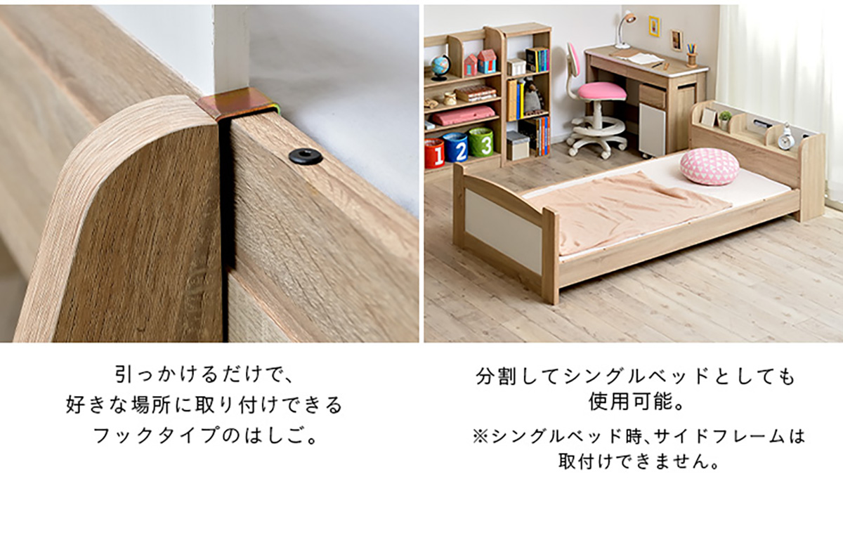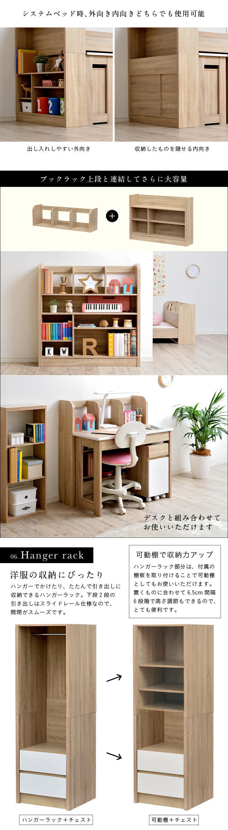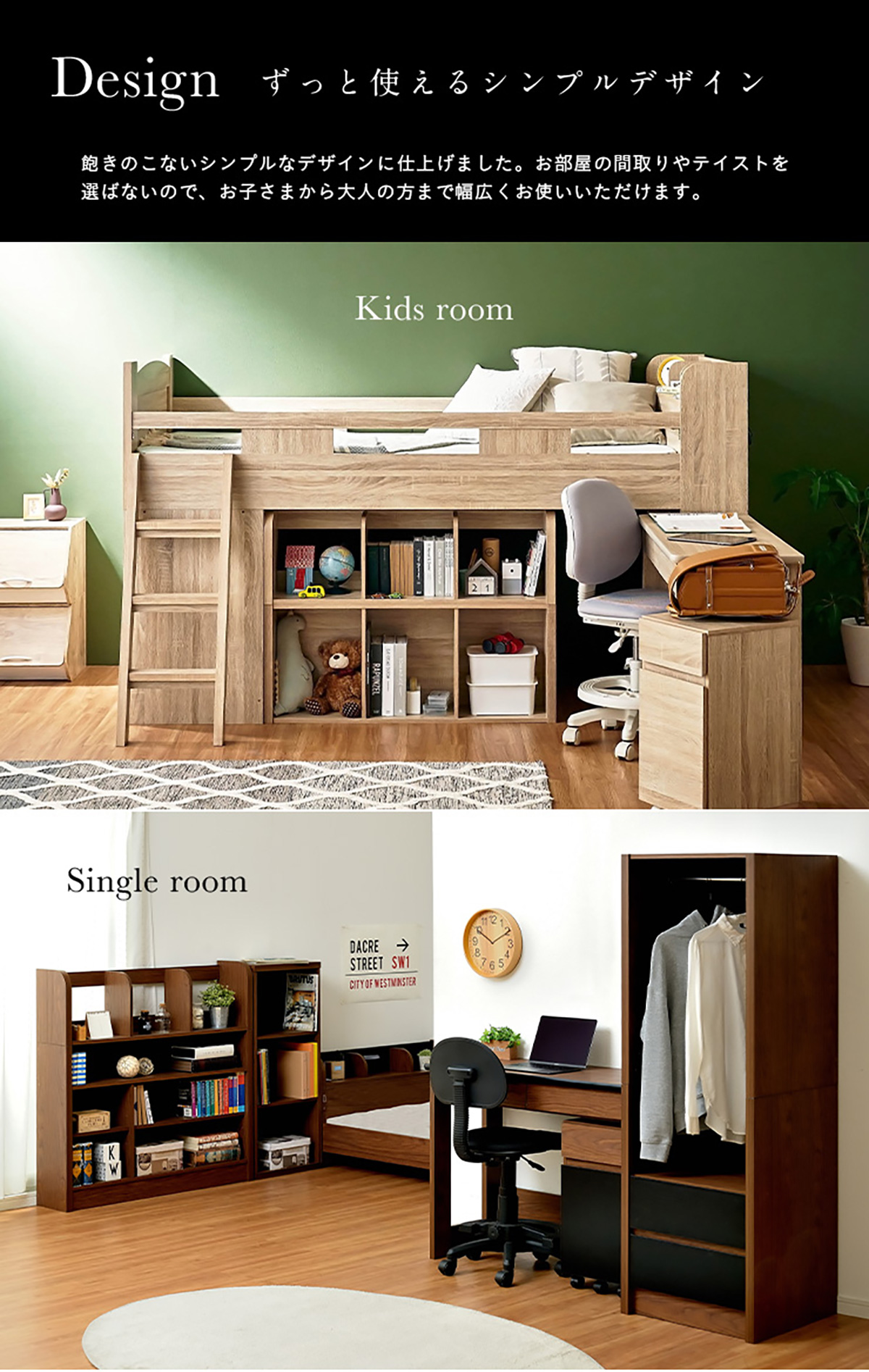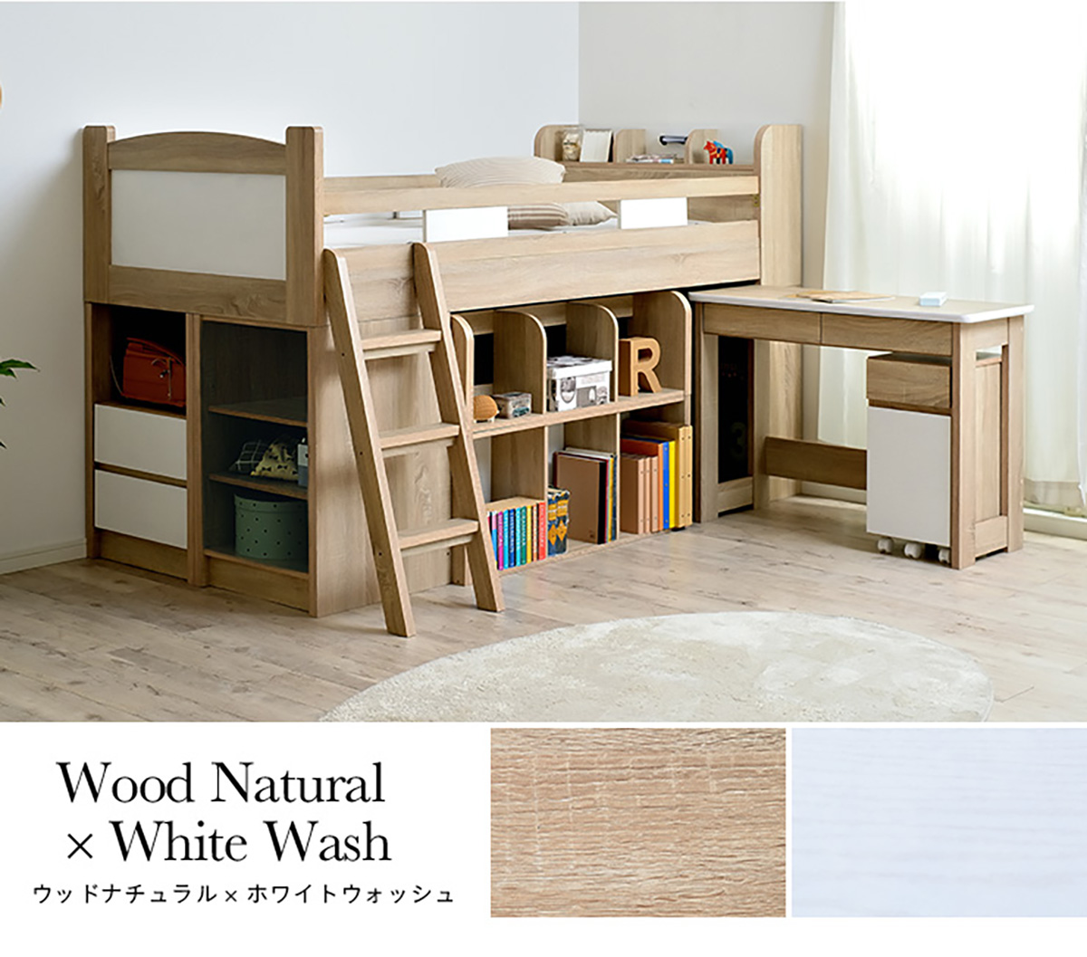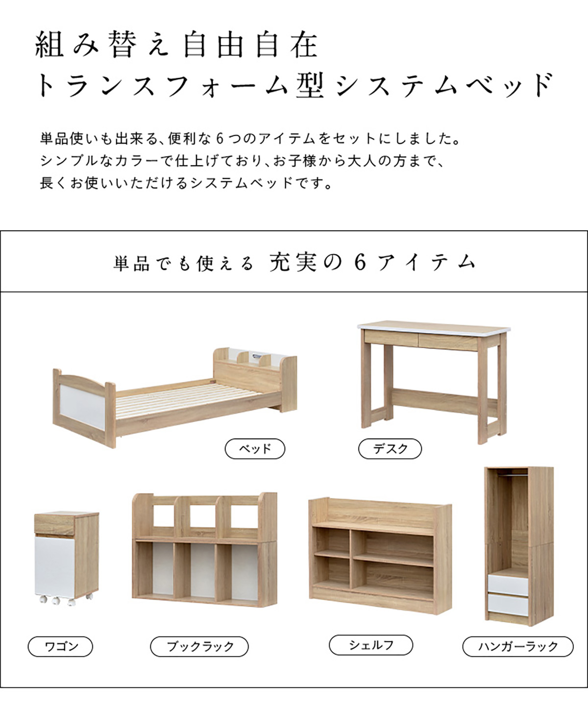 | トランスフォームでレイアウト自由自在 システムベッド VARIANT(バリアント) + ココナッツパームマットS am(アム) 当店で企画・設計をしたオリジナルシステムベッド、バリアント。 システムベッドの魅力は、限られた空間を有効活用できること。単品使いもできる、便利な6つのアイテムをセットにしました。自由なレイアウトで、自分好みのお部屋に。シンプルなカラーで仕上げており、お子様から大人の方まで、長くお使いいただけるシステムベッドです。 ■Layout お部屋の間取りに合わせて楽しめるレイアウト 変幻自在な6アイテムは、システムベッドとしてだけでなく単品でも使えてとっても便利。お部屋の間取りに合わせて、自分好みのお部屋を作ることが出来ます。 ■Function 使いやすさにこだわった6アイテム ○Bed 便利な宮棚、LED照明やコンセントが付いたベッド。ベッド下には、たっぷり入る収納スペースをつけました。組み換えれば、シングルベッドとしてもお使いいただけます。 ○Desk 長くお使いいただけるよう、シンプルなデザインのデスクに仕上げました。デスクには2杯の引き出し付き。スライドレールで開閉ラクラクです。ノートや色鉛筆などのよく使うものをしまっておくのにピッタリ。 ○Wagon キャスター付きのスリムなワゴン。ワゴンには、小物やファイルが入る2段の引き出しを付けました。引き出し全てにスライドレールが付いており、お子様でもラクに開閉が行えます。 ○Bookrack 縦でも、横でも、分割しても使えるブックラック。本や小物を収納したり、ディスプレイとしても使えるブックラック。上下を切り離せばそれぞれ独立してもお使いいただけます。 ○shelf 使い方いろいろ、大容量収納で整理整頓。本や雑貨など整理整頓に活躍するシェルフ。2枚の棚板は、収納するのに合わせて3段階で高さ調節が可能。また、ブックラック上段と連結してもご使用いただけます。 ○Hanger Rack ハンガーラックには2段の引き出し付き。衣類やおもちゃなどを収納することが出来ます。こちらもスライドレールが付いておりますので、開閉がスムーズです。 付属の棚板を取り付けることで可動棚としてもお使いいただけます。置くものに合わせて6.5cm間隔6段階で高さ調節もできるので、とても便利です。 ■Design ずっと使えるシンプルデザイン 飽きのこないシンプルなデザインに仕上げました。お子様から大人の方まで幅広くお使いいただけます。 ■Safety 快適に過ごせる安全設計 元気いっぱいなお子様も安心してお使いいただけるように、角には全て丸みをつけました。 ※当店オリジナルの企画・設計・製作です。類似品にご注意ください。 ※こちらの商品はお客様組み立てとなります。 ※システムベッド+マットレスのセット販売となります。 ※シングルベッド時、サイドフレームは取り付けできません。 ※ワゴンの引き出しにA4サイズは入りません。 ※ブックラックの棚板はすべて固定となります。 ※リアルな木目調シートを採用しております。木目や節・傷に見えるダメージ加工・ヴィンテージ加工などは全てシートデザインとなります。これらを理由とした返品・交換は行っておりませんので、予めご了承ください。 ※組み立て方や若干の個体差によって、表記サイズと完成形のサイズに多少の誤差が生じる場合がございます。予めご了承ください。 ※商品の仕様上、規定のサイズよりー2cm+3cmは適正サイズとなります。 ※ご使用されるベッドの内寸を必ずご確認ください。 | |