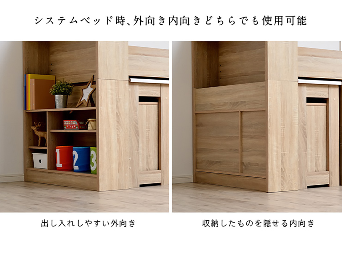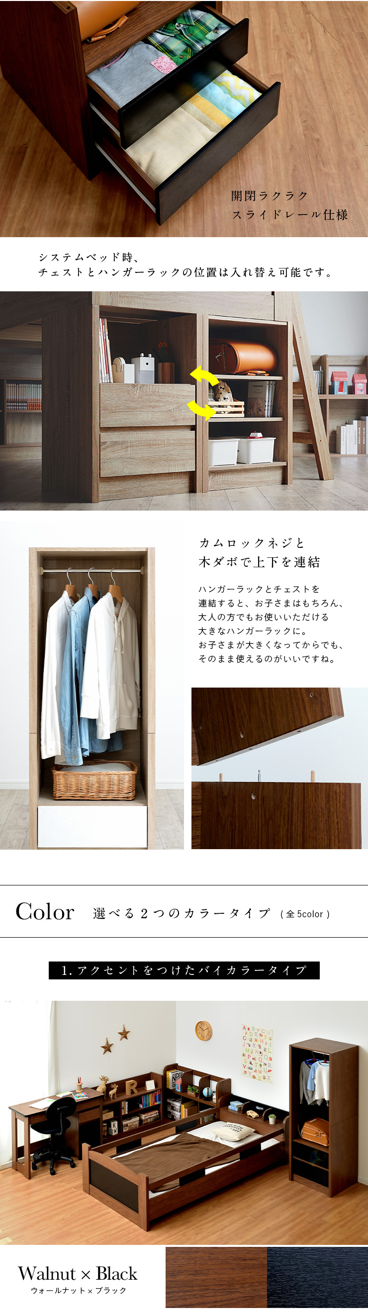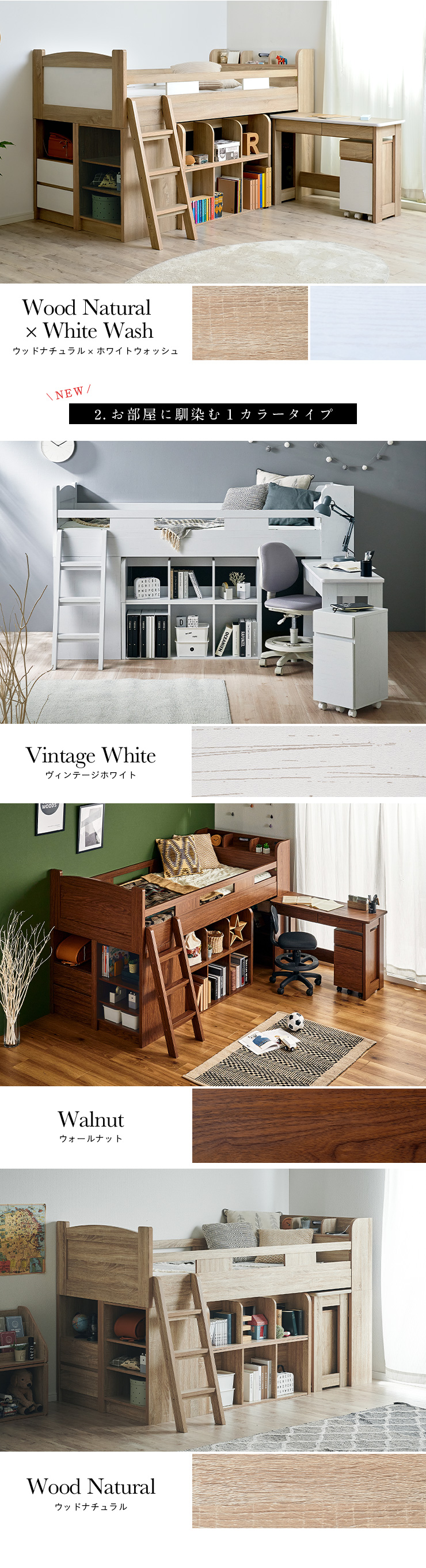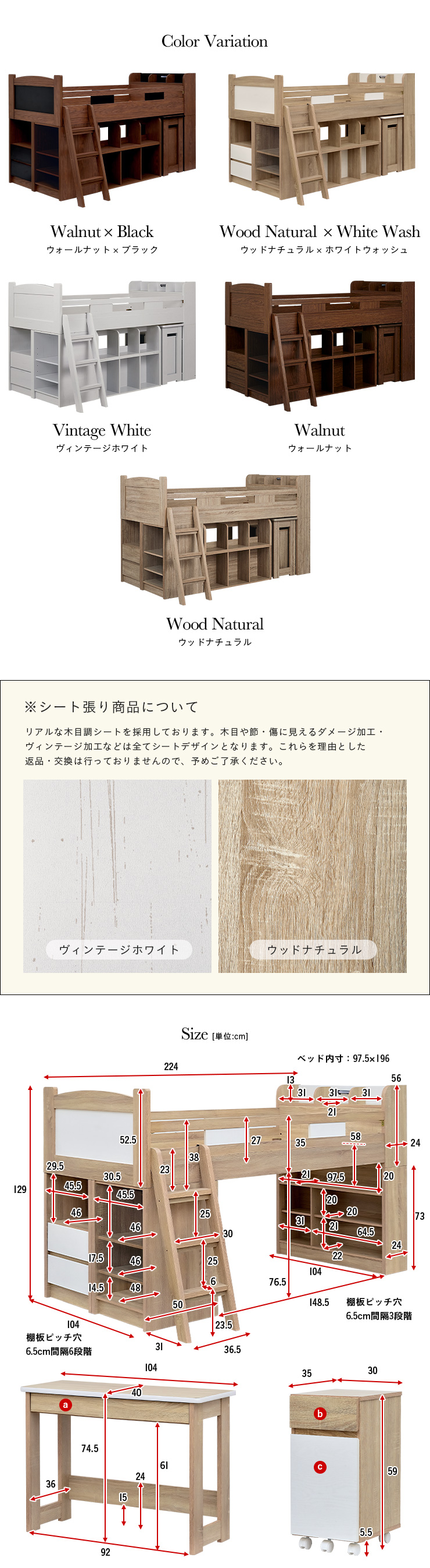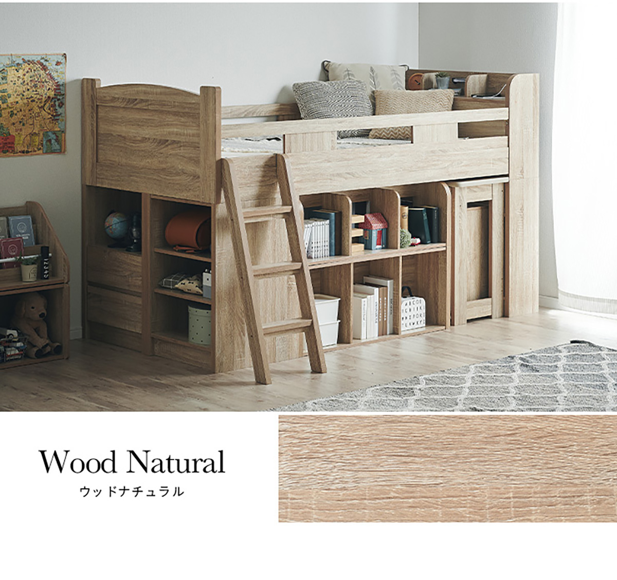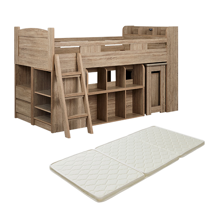 | トランスフォームでレイアウト自由自在 システムベッド VARIANT(バリアント) + ココナッツパームマットS am(アム) 当店で企画・設計をしたオリジナルシステムベッド、バリアント。 システムベッドの魅力は、限られた空間を有効活用できること。単品使いもできる、便利な6つのアイテムをセットにしました。自由なレイアウトで、自分好みのお部屋に。シンプルなカラーで仕上げており、お子様から大人の方まで、長くお使いいただけるシステムベッドです。 ■Layout お部屋の間取りに合わせて楽しめるレイアウト 変幻自在な6アイテムは、システムベッドとしてだけでなく単品でも使えてとっても便利。お部屋の間取りに合わせて、自分好みのお部屋を作ることが出来ます。 ■Function 使いやすさにこだわった6アイテム ○Bed 便利な宮棚、LED照明やコンセントが付いたベッド。ベッド下には、たっぷり入る収納スペースをつけました。組み換えれば、シングルベッドとしてもお使いいただけます。 ○Desk 長くお使いいただけるよう、シンプルなデザインのデスクに仕上げました。デスクには2杯の引き出し付き。スライドレールで開閉ラクラクです。ノートや色鉛筆などのよく使うものをしまっておくのにピッタリ。 ○Wagon キャスター付きのスリムなワゴン。ワゴンには、小物やファイルが入る2段の引き出しを付けました。引き出し全てにスライドレールが付いており、お子様でもラクに開閉が行えます。 ○Bookrack 縦でも、横でも、分割しても使えるブックラック。本や小物を収納したり、ディスプレイとしても使えるブックラック。上下を切り離せばそれぞれ独立してもお使いいただけます。 ○shelf 使い方いろいろ、大容量収納で整理整頓。本や雑貨など整理整頓に活躍するシェルフ。2枚の棚板は、収納するのに合わせて3段階で高さ調節が可能。また、ブックラック上段と連結してもご使用いただけます。 ○Hanger Rack ハンガーラックには2段の引き出し付き。衣類やおもちゃなどを収納することが出来ます。こちらもスライドレールが付いておりますので、開閉がスムーズです。 付属の棚板を取り付けることで可動棚としてもお使いいただけます。置くものに合わせて6.5cm間隔6段階で高さ調節もできるので、とても便利です。 ■Design ずっと使えるシンプルデザイン 飽きのこないシンプルなデザインに仕上げました。お子様から大人の方まで幅広くお使いいただけます。 ■Safety 快適に過ごせる安全設計 元気いっぱいなお子様も安心してお使いいただけるように、角には全て丸みをつけました。 ※当店オリジナルの企画・設計・製作です。類似品にご注意ください。 ※こちらの商品はお客様組み立てとなります。 ※システムベッド+マットレスのセット販売となります。 ※シングルベッド時、サイドフレームは取り付けできません。 ※ワゴンの引き出しにA4サイズは入りません。 ※ブックラックの棚板はすべて固定となります。 ※リアルな木目調シートを採用しております。木目や節・傷に見えるダメージ加工・ヴィンテージ加工などは全てシートデザインとなります。これらを理由とした返品・交換は行っておりませんので、予めご了承ください。 ※組み立て方や若干の個体差によって、表記サイズと完成形のサイズに多少の誤差が生じる場合がございます。予めご了承ください。 ※商品の仕様上、規定のサイズよりー2cm+3cmは適正サイズとなります。 ※ご使用されるベッドの内寸を必ずご確認ください。 | |