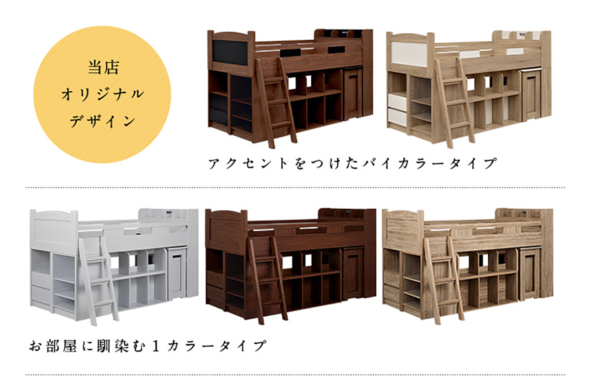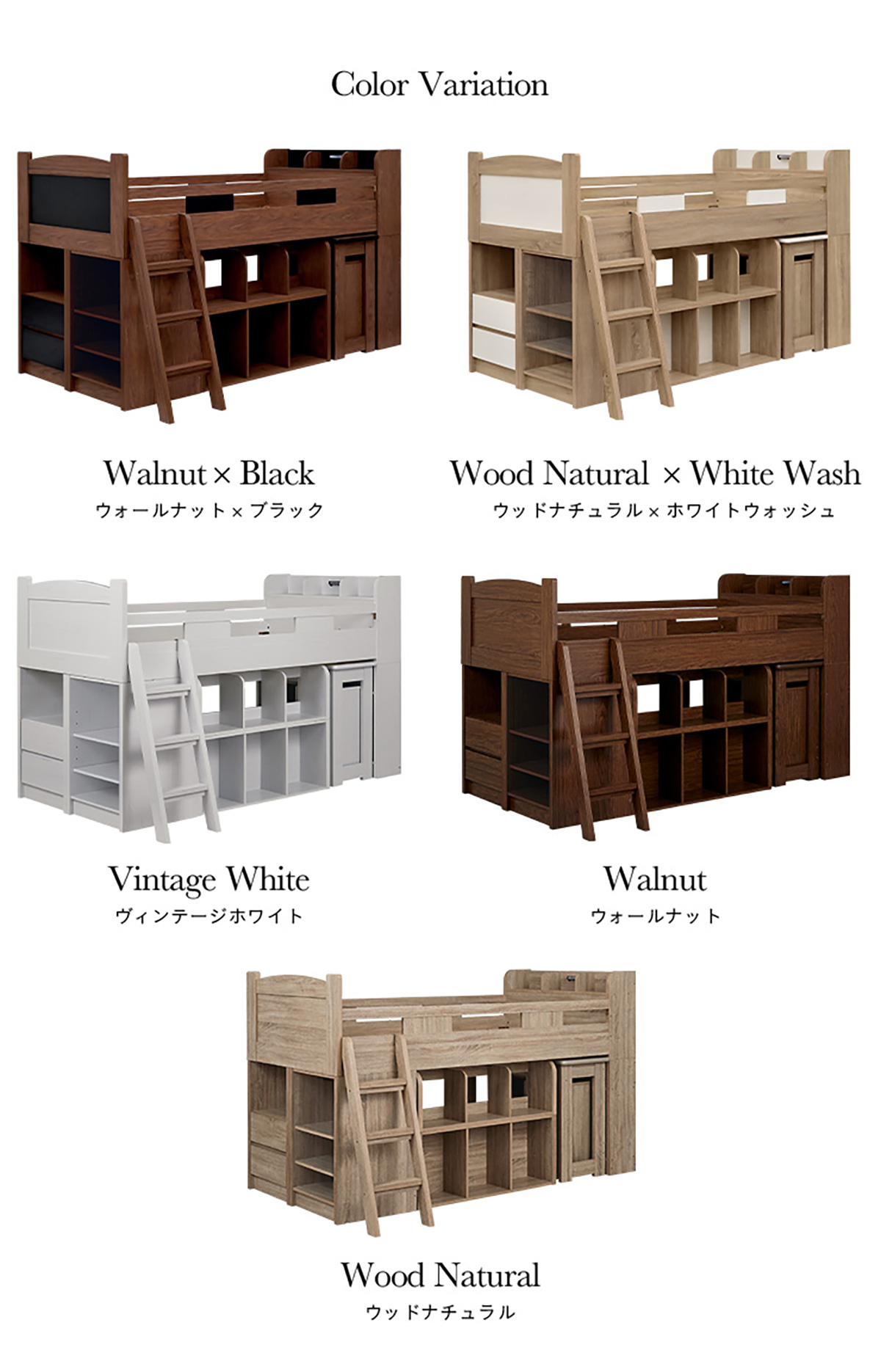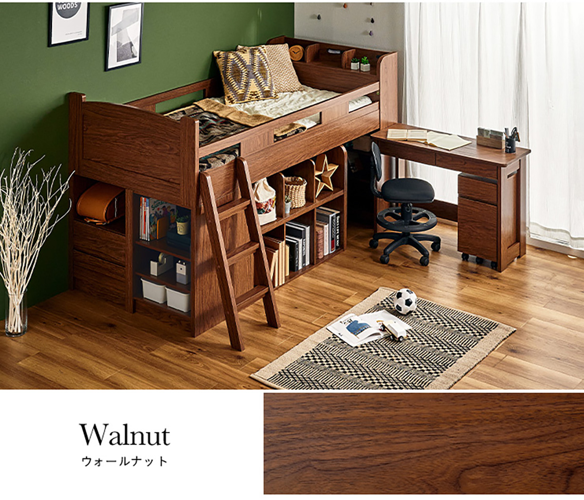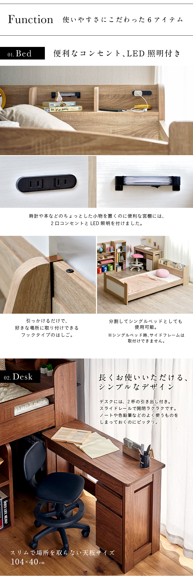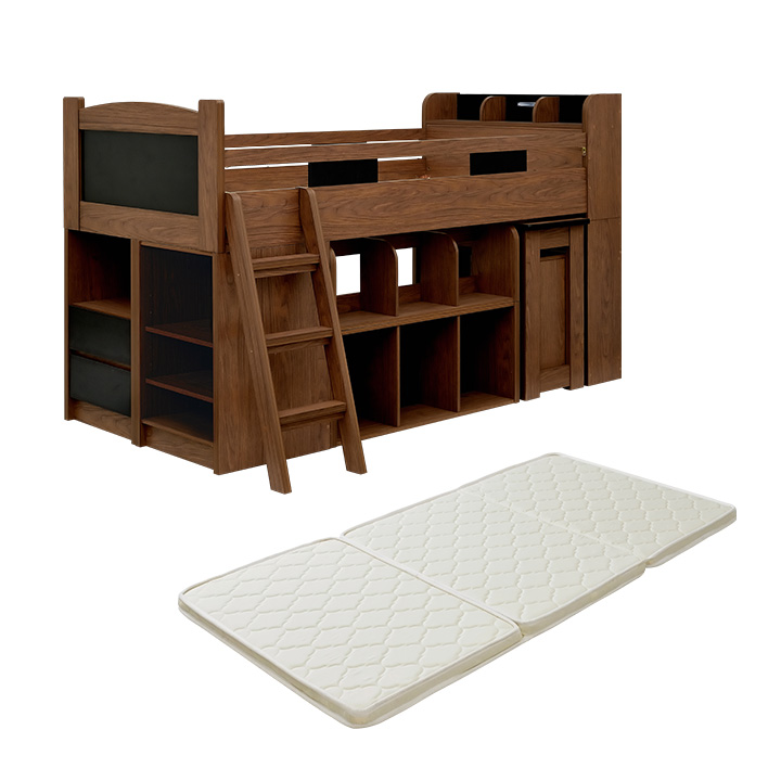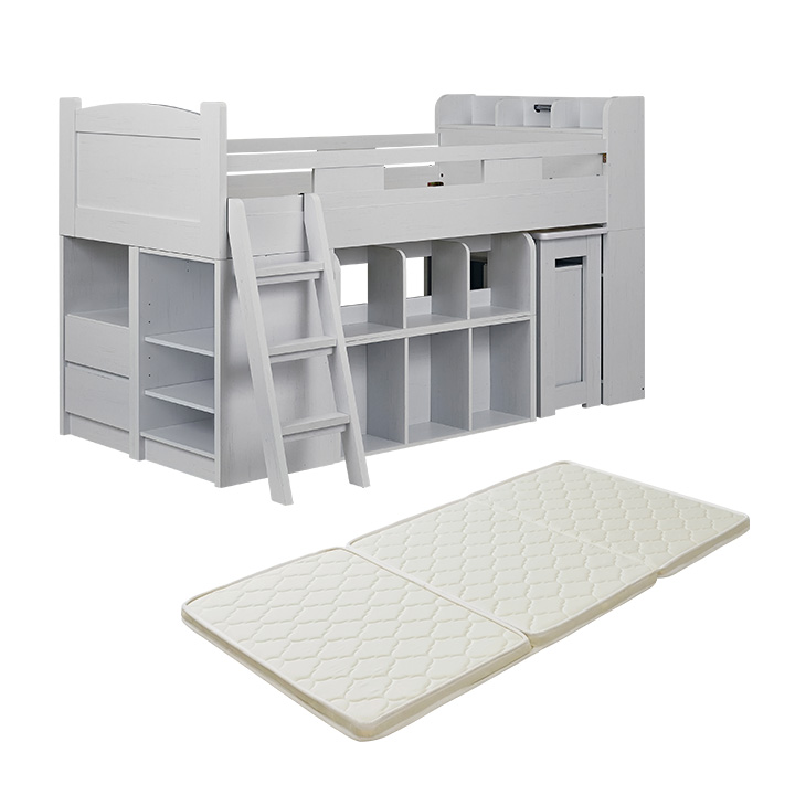 | トランスフォームでレイアウト自由自在 システムベッド VARIANT(バリアント) + ココナッツパームマットS am(アム) 当店で企画・設計をしたオリジナルシステムベッド、バリアント。 システムベッドの魅力は、限られた空間を有効活用できること。単品使いもできる、便利な6つのアイテムをセットにしました。自由なレイアウトで、自分好みのお部屋に。シンプルなカラーで仕上げており、お子様から大人の方まで、長くお使いいただけるシステムベッドです。 ■Layout お部屋の間取りに合わせて楽しめるレイアウト 変幻自在な6アイテムは、システムベッドとしてだけでなく単品でも使えてとっても便利。お部屋の間取りに合わせて、自分好みのお部屋を作ることが出来ます。 ■Function 使いやすさにこだわった6アイテム ○Bed 便利な宮棚、LED照明やコンセントが付いたベッド。ベッド下には、たっぷり入る収納スペースをつけました。組み換えれば、シングルベッドとしてもお使いいただけます。 ○Desk 長くお使いいただけるよう、シンプルなデザインのデスクに仕上げました。デスクには2杯の引き出し付き。スライドレールで開閉ラクラクです。ノートや色鉛筆などのよく使うものをしまっておくのにピッタリ。 ○Wagon キャスター付きのスリムなワゴン。ワゴンには、小物やファイルが入る2段の引き出しを付けました。引き出し全てにスライドレールが付いており、お子様でもラクに開閉が行えます。 ○Bookrack 縦でも、横でも、分割しても使えるブックラック。本や小物を収納したり、ディスプレイとしても使えるブックラック。上下を切り離せばそれぞれ独立してもお使いいただけます。 ○shelf 使い方いろいろ、大容量収納で整理整頓。本や雑貨など整理整頓に活躍するシェルフ。2枚の棚板は、収納するのに合わせて3段階で高さ調節が可能。また、ブックラック上段と連結してもご使用いただけます。 ○Hanger Rack ハンガーラックには2段の引き出し付き。衣類やおもちゃなどを収納することが出来ます。こちらもスライドレールが付いておりますので、開閉がスムーズです。 付属の棚板を取り付けることで可動棚としてもお使いいただけます。置くものに合わせて6.5cm間隔6段階で高さ調節もできるので、とても便利です。 ■Design ずっと使えるシンプルデザイン 飽きのこないシンプルなデザインに仕上げました。お子様から大人の方まで幅広くお使いいただけます。 ■Safety 快適に過ごせる安全設計 元気いっぱいなお子様も安心してお使いいただけるように、角には全て丸みをつけました。 ※当店オリジナルの企画・設計・製作です。類似品にご注意ください。 ※こちらの商品はお客様組み立てとなります。 ※システムベッド+マットレスのセット販売となります。 ※シングルベッド時、サイドフレームは取り付けできません。 ※ワゴンの引き出しにA4サイズは入りません。 ※ブックラックの棚板はすべて固定となります。 ※リアルな木目調シートを採用しております。木目や節・傷に見えるダメージ加工・ヴィンテージ加工などは全てシートデザインとなります。これらを理由とした返品・交換は行っておりませんので、予めご了承ください。 ※組み立て方や若干の個体差によって、表記サイズと完成形のサイズに多少の誤差が生じる場合がございます。予めご了承ください。 ※商品の仕様上、規定のサイズよりー2cm+3cmは適正サイズとなります。 ※ご使用されるベッドの内寸を必ずご確認ください。 | |