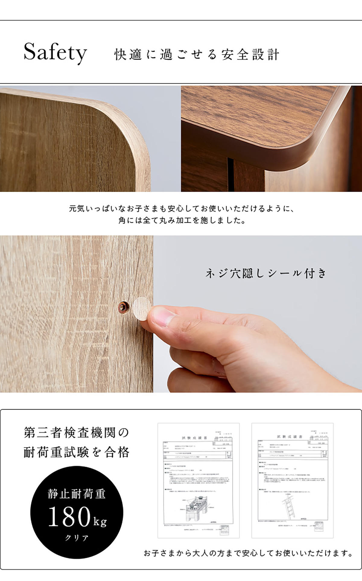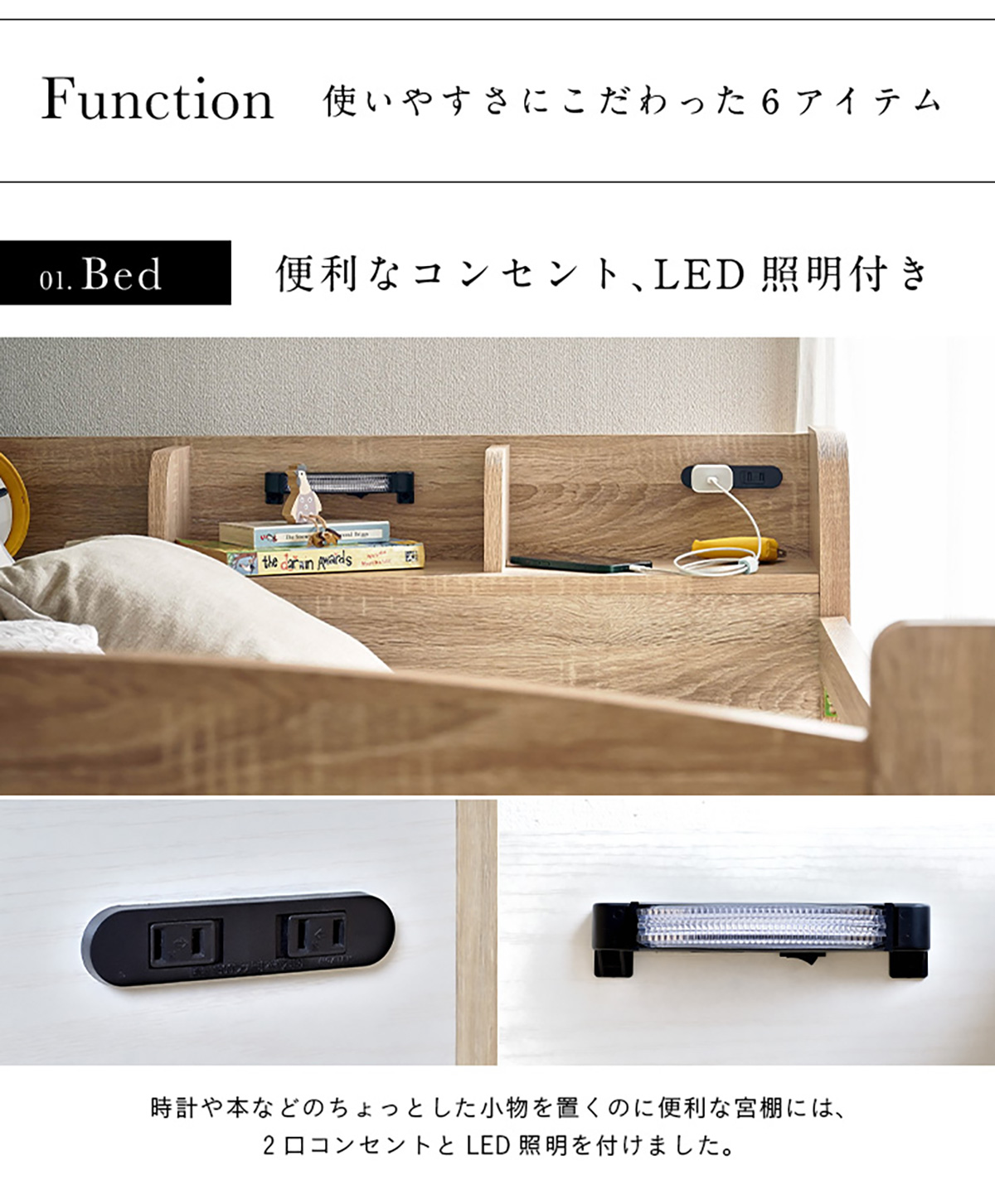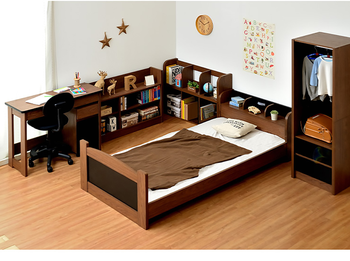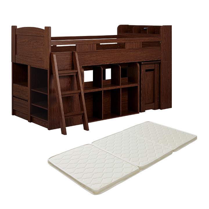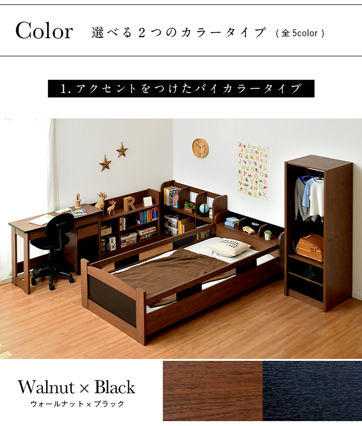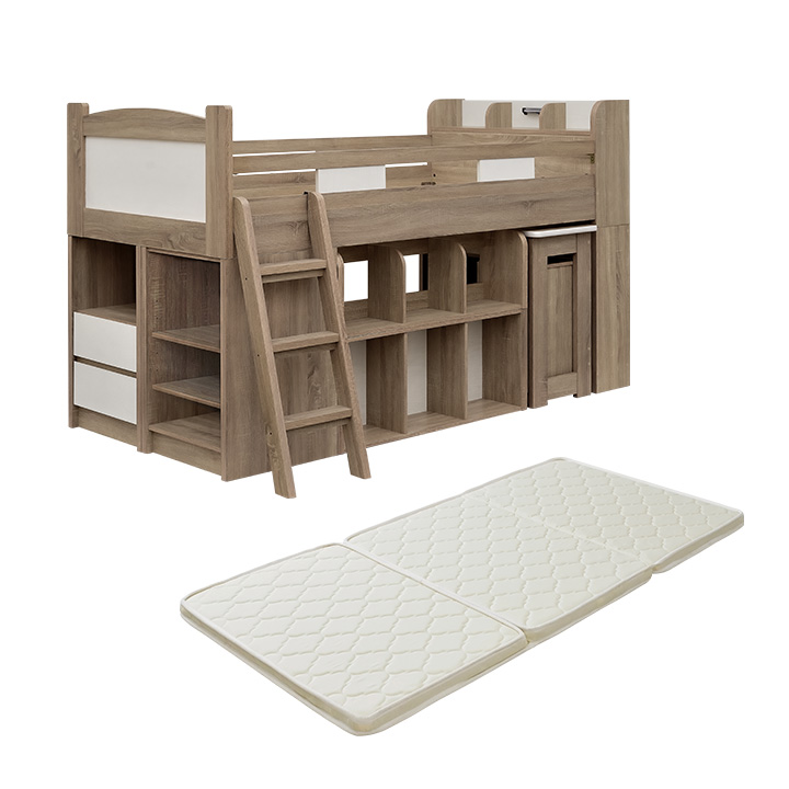 | トランスフォームでレイアウト自由自在 システムベッド VARIANT(バリアント) + ココナッツパームマットS am(アム) 当店で企画・設計をしたオリジナルシステムベッド、バリアント。 システムベッドの魅力は、限られた空間を有効活用できること。単品使いもできる、便利な6つのアイテムをセットにしました。自由なレイアウトで、自分好みのお部屋に。シンプルなカラーで仕上げており、お子様から大人の方まで、長くお使いいただけるシステムベッドです。 ■Layout お部屋の間取りに合わせて楽しめるレイアウト 変幻自在な6アイテムは、システムベッドとしてだけでなく単品でも使えてとっても便利。お部屋の間取りに合わせて、自分好みのお部屋を作ることが出来ます。 ■Function 使いやすさにこだわった6アイテム ○Bed 便利な宮棚、LED照明やコンセントが付いたベッド。ベッド下には、たっぷり入る収納スペースをつけました。組み換えれば、シングルベッドとしてもお使いいただけます。 ○Desk 長くお使いいただけるよう、シンプルなデザインのデスクに仕上げました。デスクには2杯の引き出し付き。スライドレールで開閉ラクラクです。ノートや色鉛筆などのよく使うものをしまっておくのにピッタリ。 ○Wagon キャスター付きのスリムなワゴン。ワゴンには、小物やファイルが入る2段の引き出しを付けました。引き出し全てにスライドレールが付いており、お子様でもラクに開閉が行えます。 ○Bookrack 縦でも、横でも、分割しても使えるブックラック。本や小物を収納したり、ディスプレイとしても使えるブックラック。上下を切り離せばそれぞれ独立してもお使いいただけます。 ○shelf 使い方いろいろ、大容量収納で整理整頓。本や雑貨など整理整頓に活躍するシェルフ。2枚の棚板は、収納するのに合わせて3段階で高さ調節が可能。また、ブックラック上段と連結してもご使用いただけます。 ○Hanger Rack ハンガーラックには2段の引き出し付き。衣類やおもちゃなどを収納することが出来ます。こちらもスライドレールが付いておりますので、開閉がスムーズです。 付属の棚板を取り付けることで可動棚としてもお使いいただけます。置くものに合わせて6.5cm間隔6段階で高さ調節もできるので、とても便利です。 ■Design ずっと使えるシンプルデザイン 飽きのこないシンプルなデザインに仕上げました。お子様から大人の方まで幅広くお使いいただけます。 ■Safety 快適に過ごせる安全設計 元気いっぱいなお子様も安心してお使いいただけるように、角には全て丸みをつけました。 ※当店オリジナルの企画・設計・製作です。類似品にご注意ください。 ※こちらの商品はお客様組み立てとなります。 ※システムベッド+マットレスのセット販売となります。 ※シングルベッド時、サイドフレームは取り付けできません。 ※ワゴンの引き出しにA4サイズは入りません。 ※ブックラックの棚板はすべて固定となります。 ※リアルな木目調シートを採用しております。木目や節・傷に見えるダメージ加工・ヴィンテージ加工などは全てシートデザインとなります。これらを理由とした返品・交換は行っておりませんので、予めご了承ください。 ※組み立て方や若干の個体差によって、表記サイズと完成形のサイズに多少の誤差が生じる場合がございます。予めご了承ください。 ※商品の仕様上、規定のサイズよりー2cm+3cmは適正サイズとなります。 ※ご使用されるベッドの内寸を必ずご確認ください。 | |