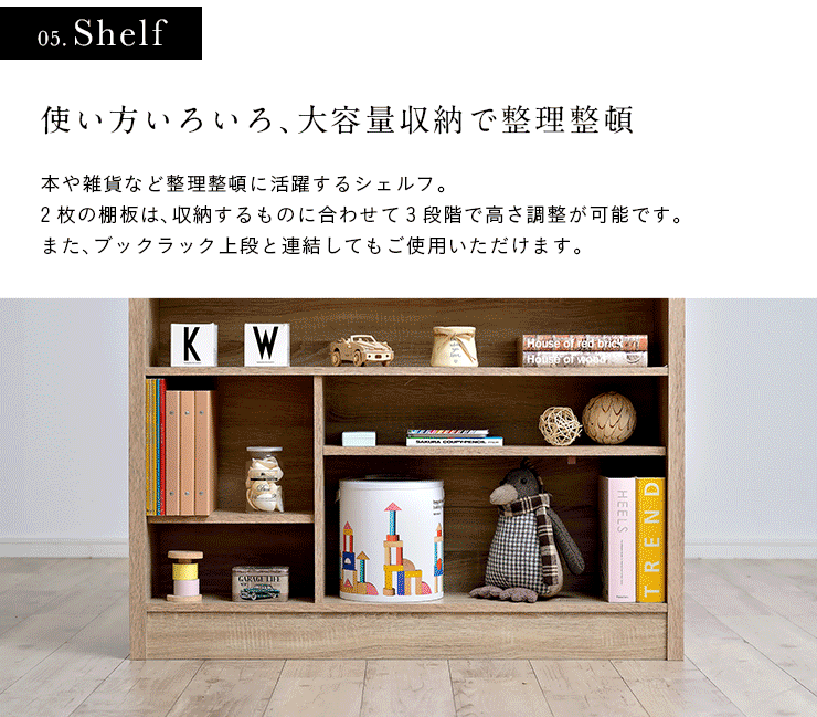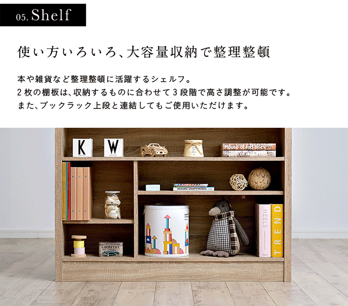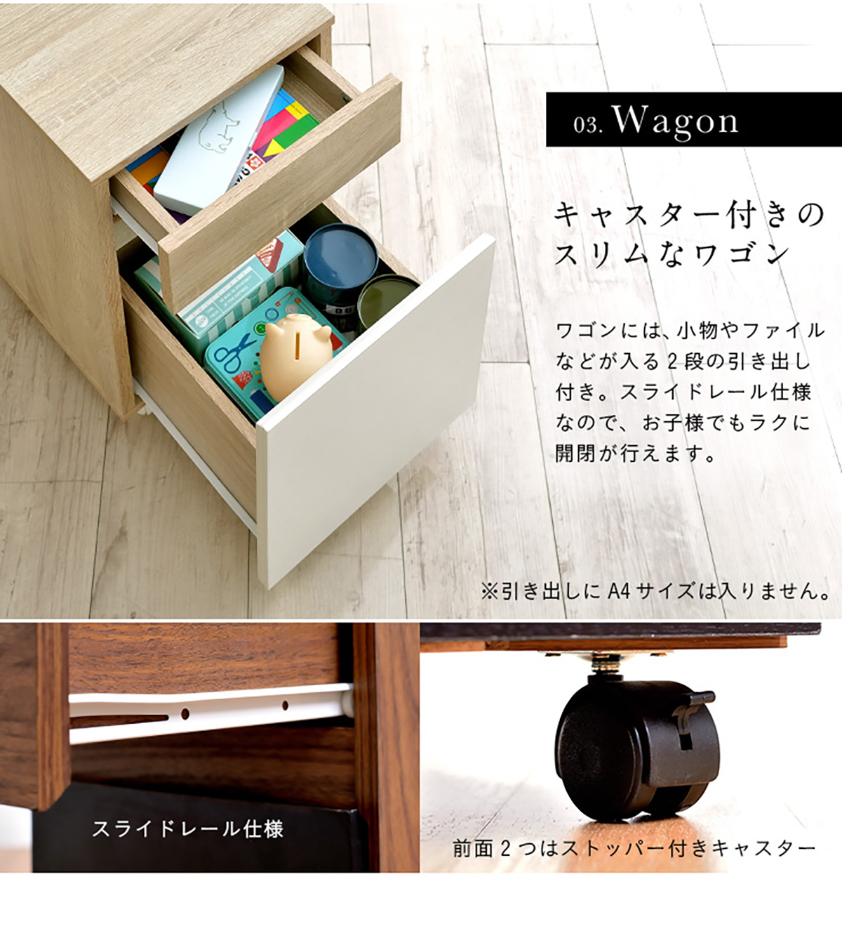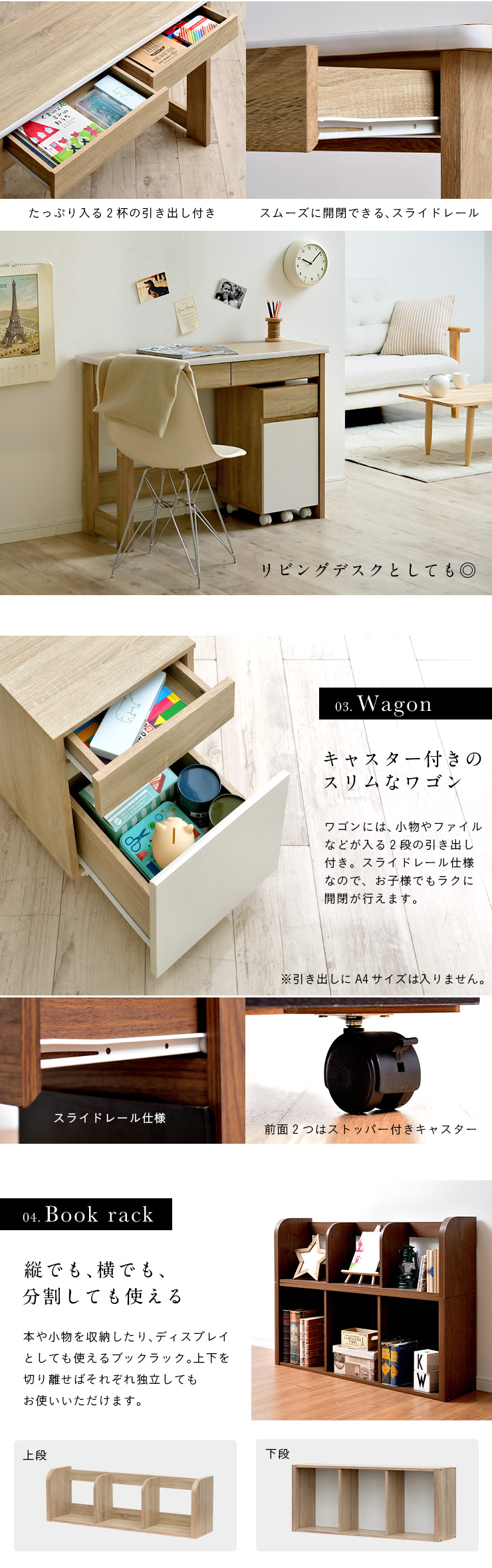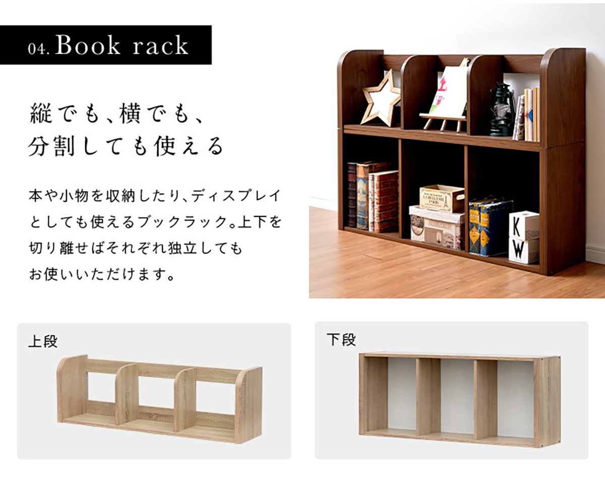 | トランスフォームでレイアウト自由自在 システムベッド VARIANT(バリアント) + ココナッツパームマットS am(アム) 当店で企画・設計をしたオリジナルシステムベッド、バリアント。 システムベッドの魅力は、限られた空間を有効活用できること。単品使いもできる、便利な6つのアイテムをセットにしました。自由なレイアウトで、自分好みのお部屋に。シンプルなカラーで仕上げており、お子様から大人の方まで、長くお使いいただけるシステムベッドです。 ■Layout お部屋の間取りに合わせて楽しめるレイアウト 変幻自在な6アイテムは、システムベッドとしてだけでなく単品でも使えてとっても便利。お部屋の間取りに合わせて、自分好みのお部屋を作ることが出来ます。 ■Function 使いやすさにこだわった6アイテム ○Bed 便利な宮棚、LED照明やコンセントが付いたベッド。ベッド下には、たっぷり入る収納スペースをつけました。組み換えれば、シングルベッドとしてもお使いいただけます。 ○Desk 長くお使いいただけるよう、シンプルなデザインのデスクに仕上げました。デスクには2杯の引き出し付き。スライドレールで開閉ラクラクです。ノートや色鉛筆などのよく使うものをしまっておくのにピッタリ。 ○Wagon キャスター付きのスリムなワゴン。ワゴンには、小物やファイルが入る2段の引き出しを付けました。引き出し全てにスライドレールが付いており、お子様でもラクに開閉が行えます。 ○Bookrack 縦でも、横でも、分割しても使えるブックラック。本や小物を収納したり、ディスプレイとしても使えるブックラック。上下を切り離せばそれぞれ独立してもお使いいただけます。 ○shelf 使い方いろいろ、大容量収納で整理整頓。本や雑貨など整理整頓に活躍するシェルフ。2枚の棚板は、収納するのに合わせて3段階で高さ調節が可能。また、ブックラック上段と連結してもご使用いただけます。 ○Hanger Rack ハンガーラックには2段の引き出し付き。衣類やおもちゃなどを収納することが出来ます。こちらもスライドレールが付いておりますので、開閉がスムーズです。 付属の棚板を取り付けることで可動棚としてもお使いいただけます。置くものに合わせて6.5cm間隔6段階で高さ調節もできるので、とても便利です。 ■Design ずっと使えるシンプルデザイン 飽きのこないシンプルなデザインに仕上げました。お子様から大人の方まで幅広くお使いいただけます。 ■Safety 快適に過ごせる安全設計 元気いっぱいなお子様も安心してお使いいただけるように、角には全て丸みをつけました。 ※当店オリジナルの企画・設計・製作です。類似品にご注意ください。 ※こちらの商品はお客様組み立てとなります。 ※システムベッド+マットレスのセット販売となります。 ※シングルベッド時、サイドフレームは取り付けできません。 ※ワゴンの引き出しにA4サイズは入りません。 ※ブックラックの棚板はすべて固定となります。 ※リアルな木目調シートを採用しております。木目や節・傷に見えるダメージ加工・ヴィンテージ加工などは全てシートデザインとなります。これらを理由とした返品・交換は行っておりませんので、予めご了承ください。 ※組み立て方や若干の個体差によって、表記サイズと完成形のサイズに多少の誤差が生じる場合がございます。予めご了承ください。 ※商品の仕様上、規定のサイズよりー2cm+3cmは適正サイズとなります。 ※ご使用されるベッドの内寸を必ずご確認ください。 | |