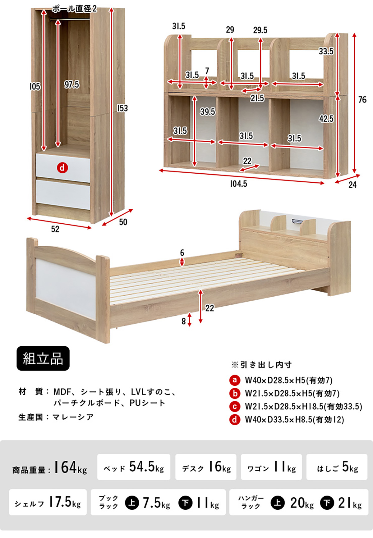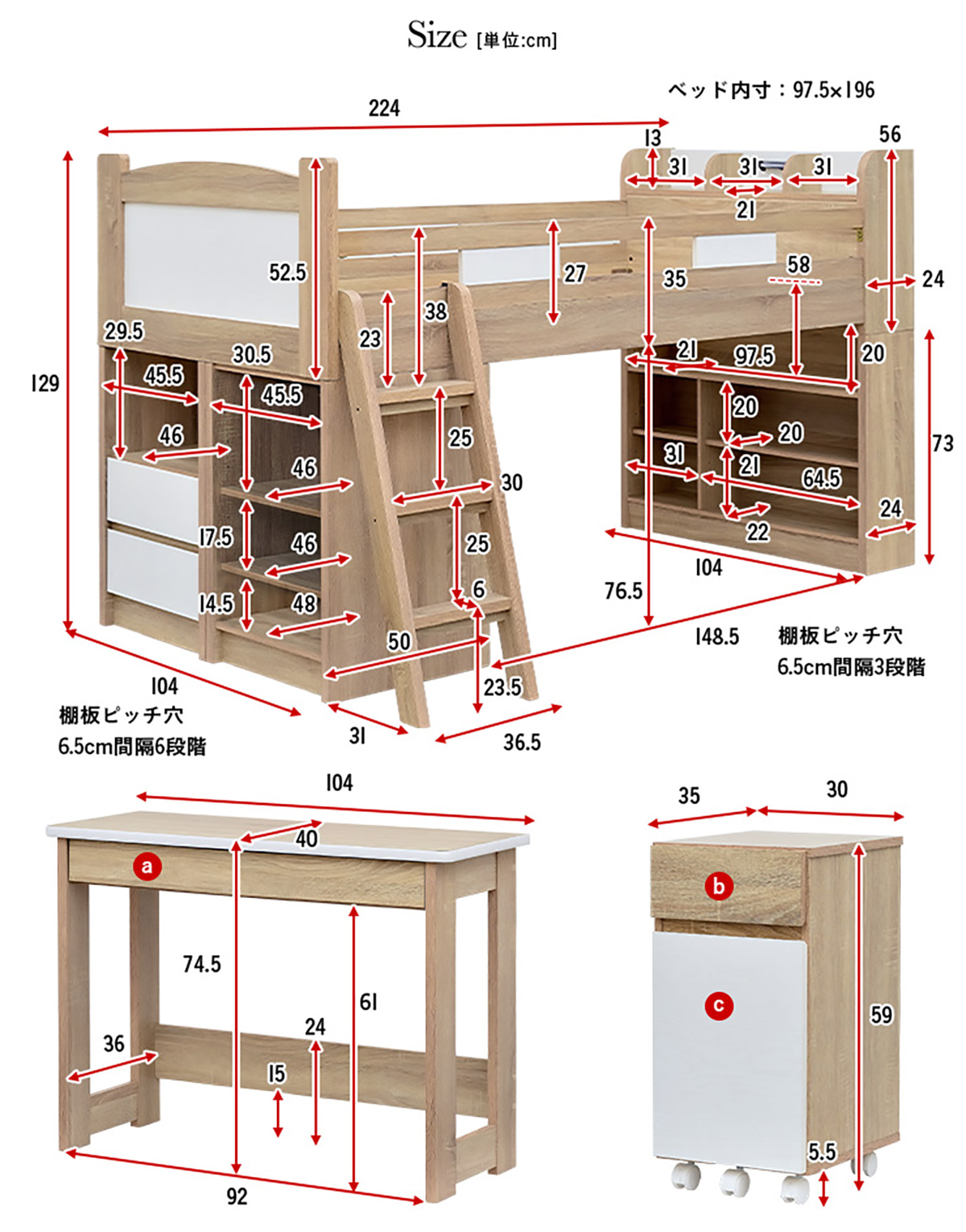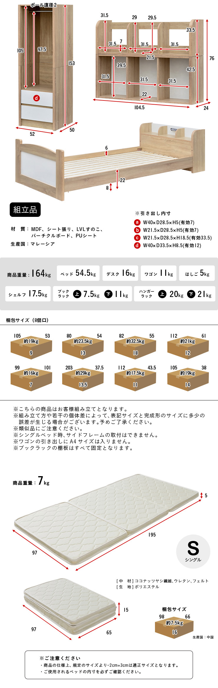 | サイズ | 全体:W224 x D104 x H129cm(重量:164kg) ベッド内寸:196 x 97.5cm デスク:W104 x D40 x H74.5cm デスク引き出し内寸:W40 x D28.5 x H5cm ワゴン:W30 x D35 x H59cm ワゴン引き出し内寸:W21.5 x D28.5 x H5cm(上段)・W21.5 x D28.5 x H18.5cm(下段) ハンガーラック:W52 x D50 x H153cm ハンガーラック引き出し内寸:W40 x D33.5 x H8.5cm シェルフ:W104.5 x D24 x H76cm マットレス:W195 x D97 x H5cm(重量:7.5kg) |