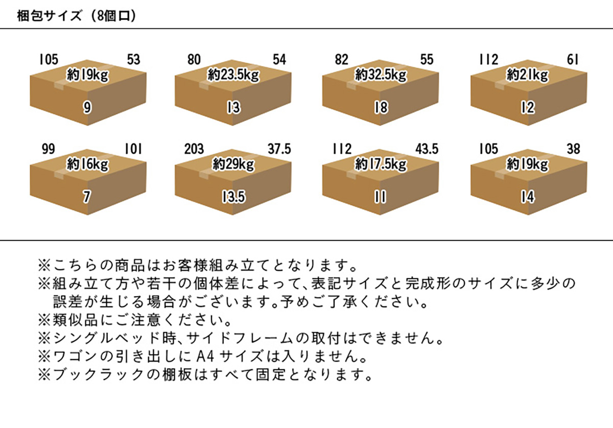 | 梱包(9個口) | 105 x 53 x 9cm(重量:19kg)・80 x 54 x 13cm(重量:23.5kg)・82 x 55 x 18cm(重量:32.5kg)・112 x 61 x 12(重量:21kg)・99 x 101 x 7cm(重量:16kg)・203 x 37.5 x 13.5cm(重量:29kg)・112 x 43.5 x 11cm(重量:17.5kg)・105 x 38 x 14cm(重量:19kg)・98 x 66 x 16cm(重量:7.5kg) |