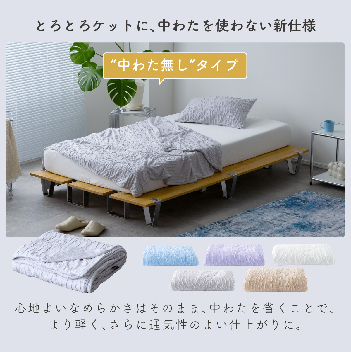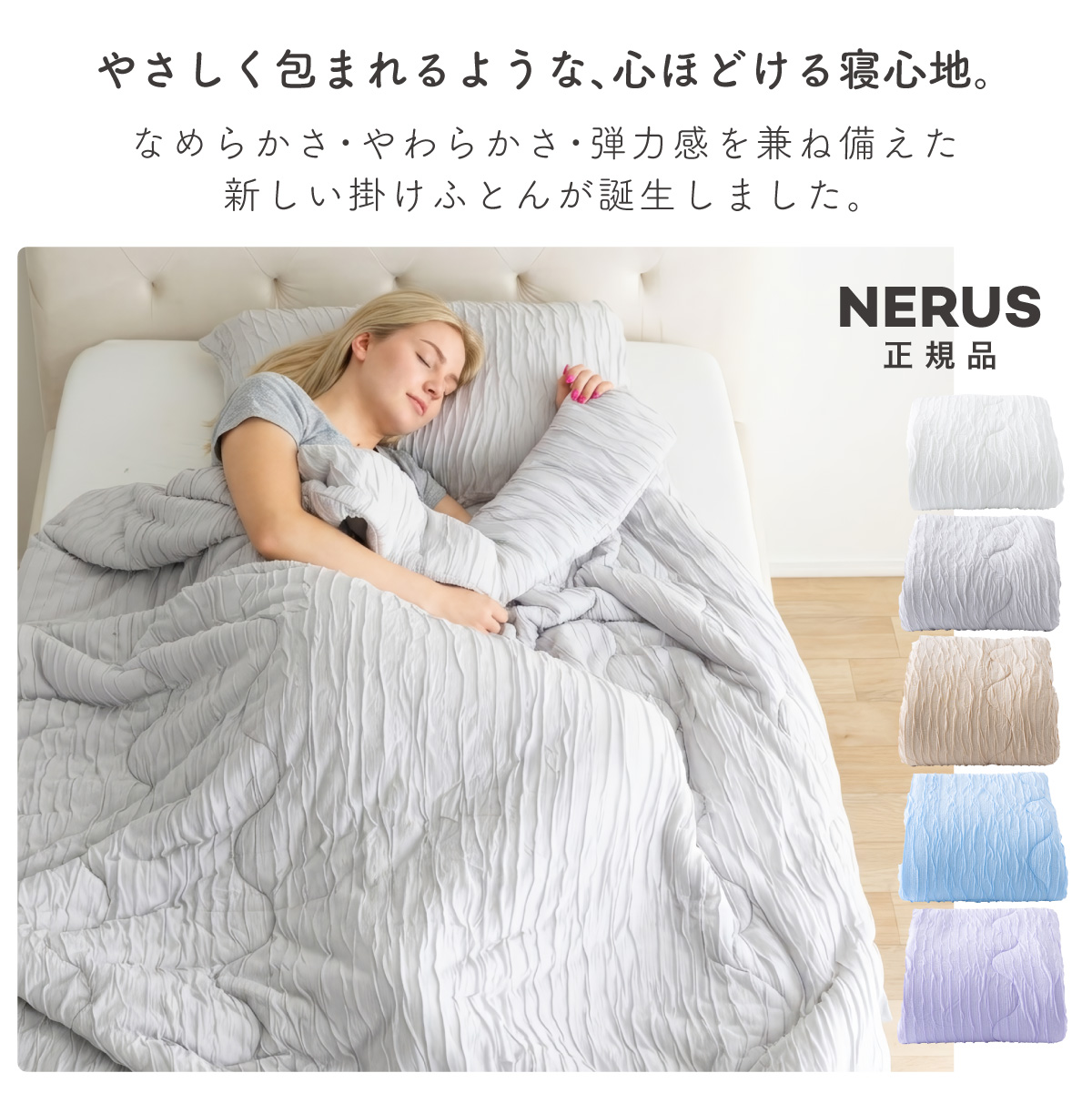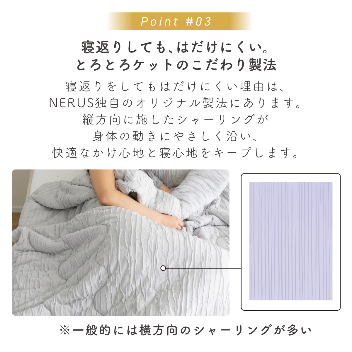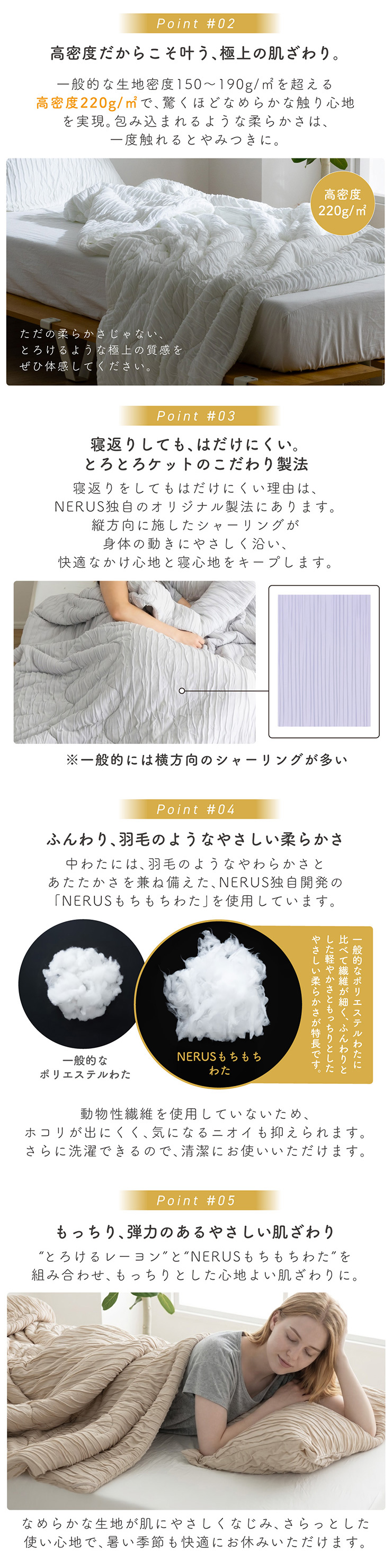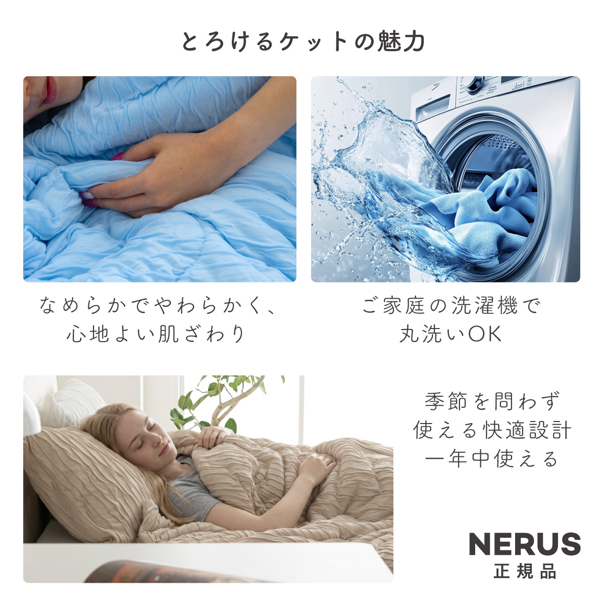 | 【NERUS正規品】一年中使える&自宅で洗える とろとろケット Asheri(アシェリ) シングルサイズ やさしく包まれるような、心ほどける寝心地。 なめらかさ・やわらかさ・弾力感を兼ね揃えた新しい掛けふとんが誕生しました。 とろけるような質感で、肌に触れるたびにリラックスできる心地よさ。 ■とろとろケットに、中わたを使わない新仕様 心地よいなめらかさはそのまま、中わたを省くことで、より軽く、さらに通気性のよい仕上がりに。 ■軽くて楽・ムレにくい・乾きやすい [通常との比較]中わた有りタイプと比べて、すっきりとした薄さで軽快に使えます。 ■とろけるケットの魅力 なめらかでやわらかく、心地よい肌ざわり ご家庭の洗濯機で丸洗いOK 季節を問わず使える快適設計で一年中使える ■とろけるような質感 肌にやさしくなじむ、極上のフィット感 しっとりとなめらかな生地が心地よく、さらりとした使い心地で蒸れにくく快適。 ■[Point1]このなめらかさの秘密はこだわりの"レーヨン素材" 独自に開発したレーヨン素材を使用。 天然由来の木材をベースにした繊維で、やさしい風合いと機能性を兼ね揃えています。 ■レーヨン素材の特長 ・シルクのような上品な光沢と軽やかさ ・優れた吸湿性と通気性で快適な使い心地 ・なめらかな肌あたりで季節を問わず活躍 ・静電気が起きにくく、ホコリがつきにくい しっとりとした質感と柔らかさで、肌に寄り添うようなやさしい寝心地を実現。 保湿性と通気性のバランスにも優れています。 ■NERUSオリジナル設計のレーヨン糸 一般的なレーヨンに比べて凹凸を抑えた設計により、なめらかでしっとりとしたやさしい肌ざわりを実現しました。 さらに耐久性にも配慮し、長く快適に使える仕上がりです。 ほどよい吸湿・放湿性があるため、湿気対策や乾燥対策にも。 ■[Point2]高密度だからこそ叶う、極上の肌ざわり。 一般的な生地密度150〜190g/㎡を超える高密度220g/㎡で、驚くほどなめらかな触り心地を実現。 包み込まれるような柔らかさは、一度触れるとやみつきに。 ■[Point3]寝返りしても、はだけにくい。とろとろケットのこだわり製法 寝返りをしてもはだけにくい理由は、NERUS独自のオリジナル製法にあります。 縦方向に施したシャーリングが身体の動きにやさしく沿い、快適なかけ心地と寝心地をキープします。 ■[Point4]ふんわり、羽毛のようなやさしい柔らかさ 中わたには、羽毛のようなやわらかさとあたたかさを兼ね備えた、NERUS独自開発の「NERUSもちもちわた」を使用しています。 動物性繊維を使用していないため、ホコリが出にくく、気になるニオイも抑えられます。 さらに洗濯できるので、清潔にお使いいただけます。 ■[Point5]もっちり、弾力のあるやさしい肌ざわり "とろけるレーヨン"と"NERUSもちもちわた"を組み合わせ、もっちりとした心地よい肌ざわりに。 なめらかな生地が肌にやさしくなじみ、さらっとした使い心地で、暑い季節も快適にお休みいただけます。 ■[Point6]オールシーズン、心地よく使える一枚 春夏秋はさらっと快適に、冬はほんのり暖かく。 季節を問わず、一年を通してお使いいただけます。 出し入れの手間が少ないので、収納の負担も軽減できます。 ※感じ方には個人差があり、室温や使用環境によって異なります。 ■[Point7]洗濯機で洗えるから、汗ばむ季節も気持ちよく使える ポリエステル綿を使用しているため、お手入れ簡単。 洗濯機で洗えるので、いつでも清潔。 お子さまのいるご家庭にも取り入れやすい一枚です。 ※お洗濯の際は洗濯ネットをご使用ください。 ■[Point8]布団カバーなしでも、心地よく使える ご家庭で丸洗いできるので、布団カバーなしでもそのままお使いいただけます。 もっちりとしあ肌ざわりを、ぜひ直接感じてください。 ■[Point9]収納袋付きで、持ち運びもスマート 専用の収納袋がセットになっているので、コンパクトにまとめてすっきり収納できます。 旅行や帰省、お泊まりの持ち運びにも便利です。 まるで雪に包まれるようなふんわりやさしい肌ざわり。 素肌がよろこぶ、ふわふわのぬくもりをぜひ実際に手に取ってご体感ください。 ※サイズ表記は生地寸であり、仕上がり寸ではございません。若干の誤差が生じる場合がございます。あらかじめご了承ください。 ※直射日光の当たる場所・高温多湿な場所・火気の近くでのご使用・保管は避け、風通しの良い場所でご使用ください。 ※商品の開封直後に、においが気になる場合は風通しの良い日陰でしばらく陰干ししてください。 ※湿ったまま放置するとカビの原因となりますのでご注意ください。 ※商品写真はできる限り実物の色に近づけておりますが、お使いのモニター環境、照明、製造ロット等により実際の商品と若干色味が異なる場合がございます。予めご了承ください。 ※計測方法や製造ロットによりサイズに誤差が生じる場合があります。 ※商品到着後すぐに開封し、商品に不具合等ないかご確認ください。 