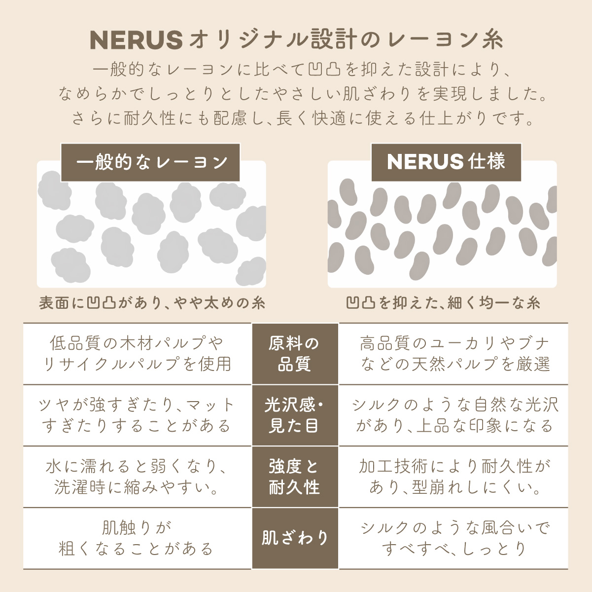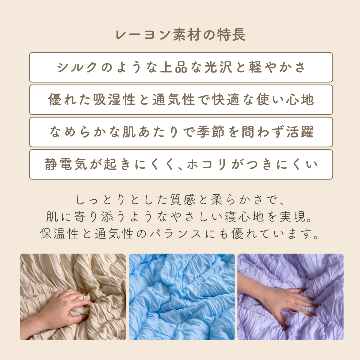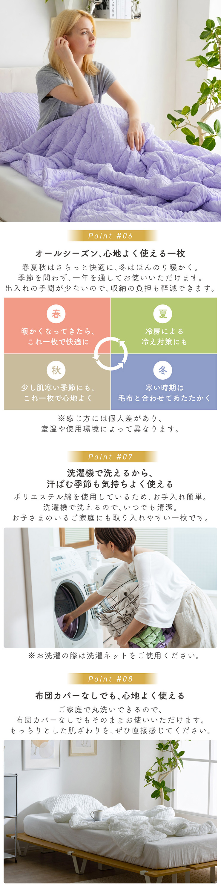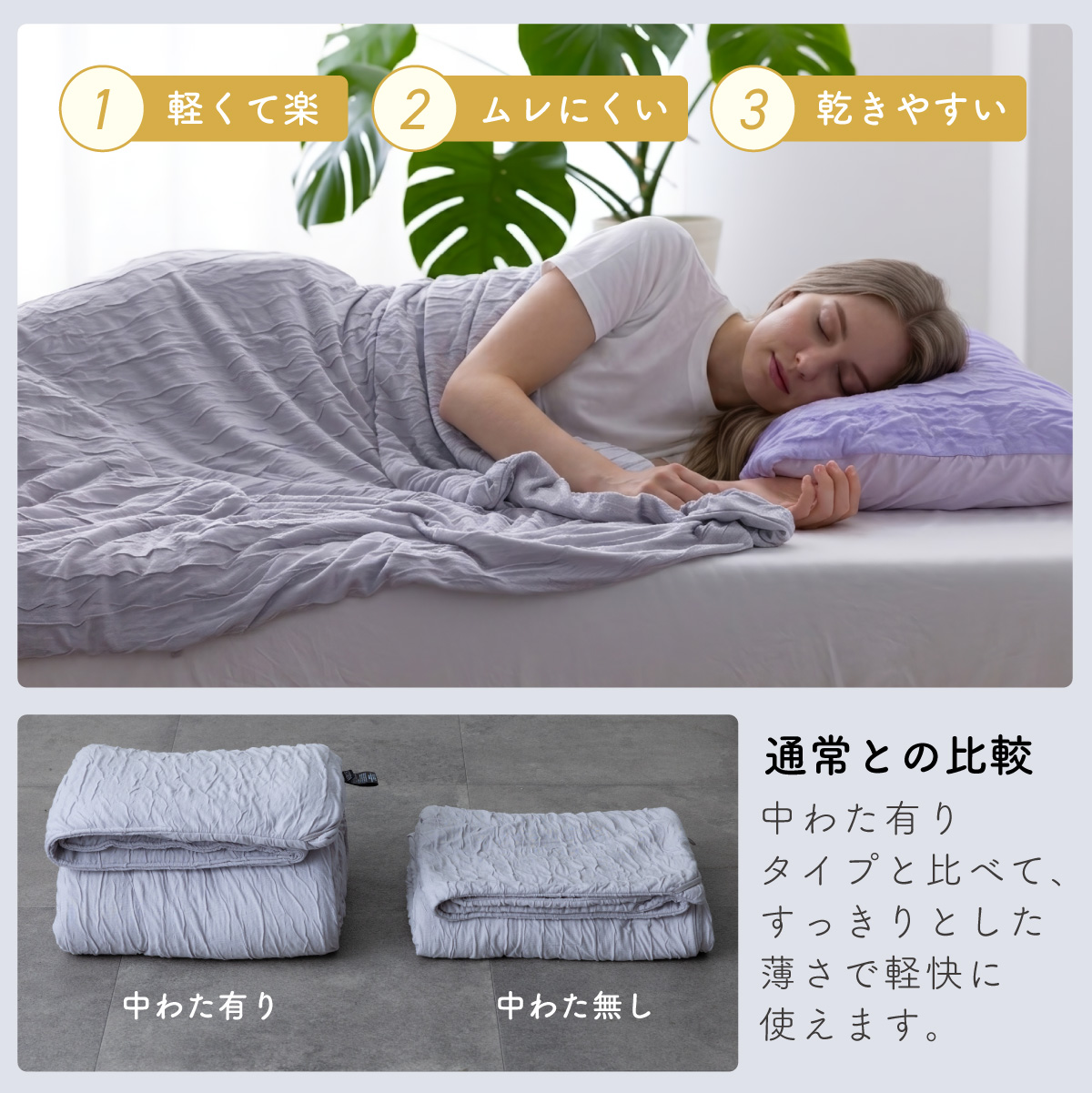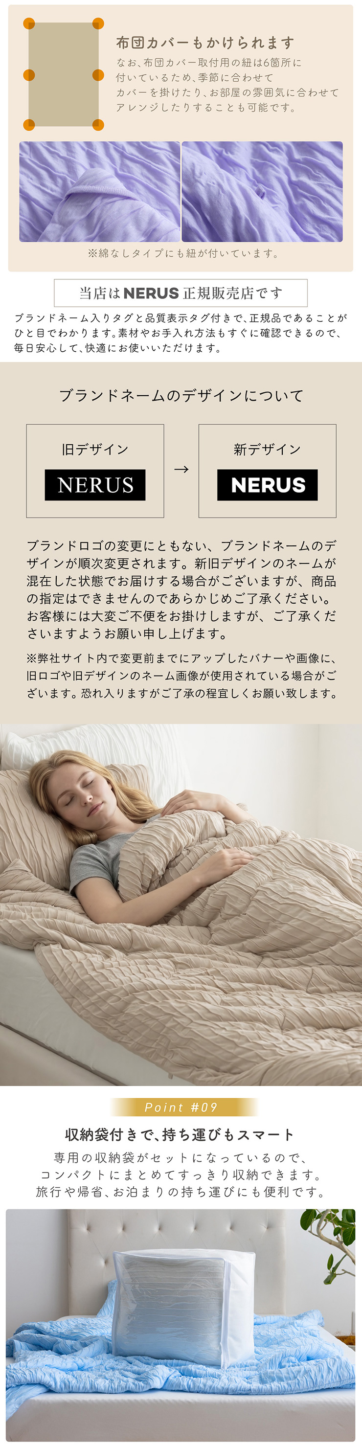 | 【NERUS正規品】一年中使える&自宅で洗える とろとろケット Asheri(アシェリ) シングルサイズ やさしく包まれるような、心ほどける寝心地。 なめらかさ・やわらかさ・弾力感を兼ね揃えた新しい掛けふとんが誕生しました。 とろけるような質感で、肌に触れるたびにリラックスできる心地よさ。 ■とろとろケットに、中わたを使わない新仕様 心地よいなめらかさはそのまま、中わたを省くことで、より軽く、さらに通気性のよい仕上がりに。 ■軽くて楽・ムレにくい・乾きやすい [通常との比較]中わた有りタイプと比べて、すっきりとした薄さで軽快に使えます。 ■とろけるケットの魅力 なめらかでやわらかく、心地よい肌ざわり ご家庭の洗濯機で丸洗いOK 季節を問わず使える快適設計で一年中使える ■とろけるような質感 肌にやさしくなじむ、極上のフィット感 しっとりとなめらかな生地が心地よく、さらりとした使い心地で蒸れにくく快適。 ■[Point1]このなめらかさの秘密はこだわりの"レーヨン素材" 独自に開発したレーヨン素材を使用。 天然由来の木材をベースにした繊維で、やさしい風合いと機能性を兼ね揃えています。 ■レーヨン素材の特長 ・シルクのような上品な光沢と軽やかさ ・優れた吸湿性と通気性で快適な使い心地 ・なめらかな肌あたりで季節を問わず活躍 ・静電気が起きにくく、ホコリがつきにくい しっとりとした質感と柔らかさで、肌に寄り添うようなやさしい寝心地を実現。 保湿性と通気性のバランスにも優れています。 ■NERUSオリジナル設計のレーヨン糸 一般的なレーヨンに比べて凹凸を抑えた設計により、なめらかでしっとりとしたやさしい肌ざわりを実現しました。 さらに耐久性にも配慮し、長く快適に使える仕上がりです。 ほどよい吸湿・放湿性があるため、湿気対策や乾燥対策にも。 ■[Point2]高密度だからこそ叶う、極上の肌ざわり。 一般的な生地密度150〜190g/㎡を超える高密度220g/㎡で、驚くほどなめらかな触り心地を実現。 包み込まれるような柔らかさは、一度触れるとやみつきに。 ■[Point3]寝返りしても、はだけにくい。とろとろケットのこだわり製法 寝返りをしてもはだけにくい理由は、NERUS独自のオリジナル製法にあります。 縦方向に施したシャーリングが身体の動きにやさしく沿い、快適なかけ心地と寝心地をキープします。 ■[Point4]ふんわり、羽毛のようなやさしい柔らかさ 中わたには、羽毛のようなやわらかさとあたたかさを兼ね備えた、NERUS独自開発の「NERUSもちもちわた」を使用しています。 動物性繊維を使用していないため、ホコリが出にくく、気になるニオイも抑えられます。 さらに洗濯できるので、清潔にお使いいただけます。 ■[Point5]もっちり、弾力のあるやさしい肌ざわり "とろけるレーヨン"と"NERUSもちもちわた"を組み合わせ、もっちりとした心地よい肌ざわりに。 なめらかな生地が肌にやさしくなじみ、さらっとした使い心地で、暑い季節も快適にお休みいただけます。 ■[Point6]オールシーズン、心地よく使える一枚 春夏秋はさらっと快適に、冬はほんのり暖かく。 季節を問わず、一年を通してお使いいただけます。 出し入れの手間が少ないので、収納の負担も軽減できます。 ※感じ方には個人差があり、室温や使用環境によって異なります。 ■[Point7]洗濯機で洗えるから、汗ばむ季節も気持ちよく使える ポリエステル綿を使用しているため、お手入れ簡単。 洗濯機で洗えるので、いつでも清潔。 お子さまのいるご家庭にも取り入れやすい一枚です。 ※お洗濯の際は洗濯ネットをご使用ください。 ■[Point8]布団カバーなしでも、心地よく使える ご家庭で丸洗いできるので、布団カバーなしでもそのままお使いいただけます。 もっちりとしあ肌ざわりを、ぜひ直接感じてください。 ■[Point9]収納袋付きで、持ち運びもスマート 専用の収納袋がセットになっているので、コンパクトにまとめてすっきり収納できます。 旅行や帰省、お泊まりの持ち運びにも便利です。 まるで雪に包まれるようなふんわりやさしい肌ざわり。 素肌がよろこぶ、ふわふわのぬくもりをぜひ実際に手に取ってご体感ください。 ※サイズ表記は生地寸であり、仕上がり寸ではございません。若干の誤差が生じる場合がございます。あらかじめご了承ください。 ※直射日光の当たる場所・高温多湿な場所・火気の近くでのご使用・保管は避け、風通しの良い場所でご使用ください。 ※商品の開封直後に、においが気になる場合は風通しの良い日陰でしばらく陰干ししてください。 ※湿ったまま放置するとカビの原因となりますのでご注意ください。 ※商品写真はできる限り実物の色に近づけておりますが、お使いのモニター環境、照明、製造ロット等により実際の商品と若干色味が異なる場合がございます。予めご了承ください。 ※計測方法や製造ロットによりサイズに誤差が生じる場合があります。 ※商品到着後すぐに開封し、商品に不具合等ないかご確認ください。 