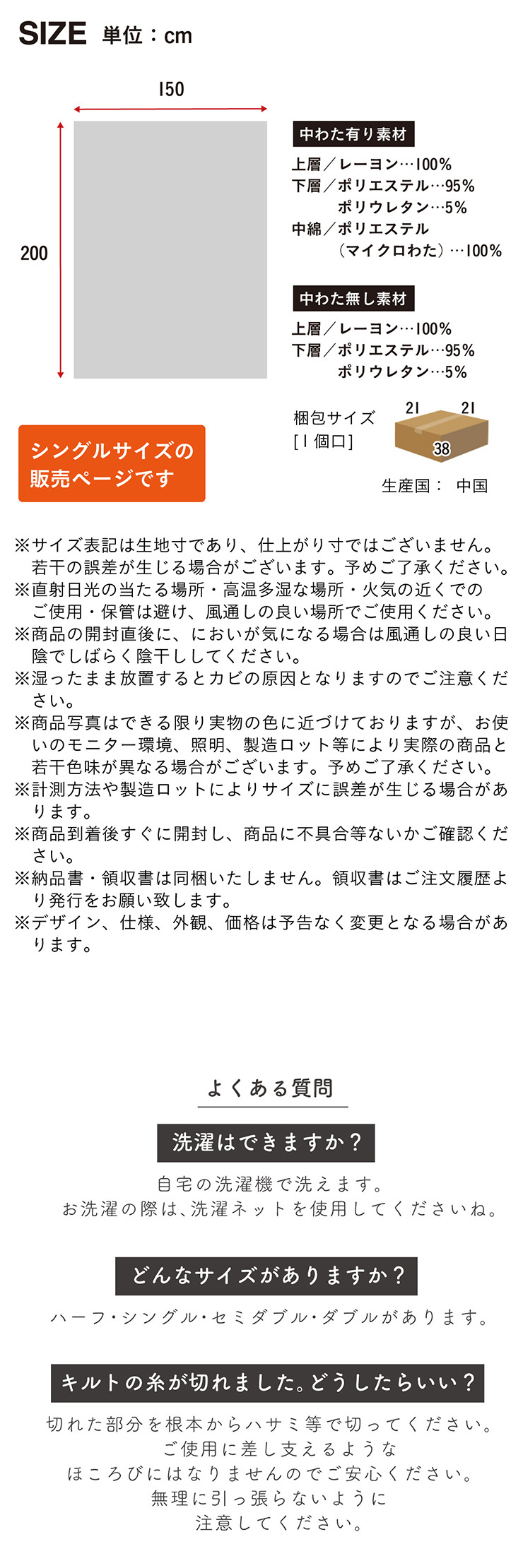 | 材質・素材 | 【中わた有り】上層:レーヨン100% 下層:ポリエステル95%・ポリウレタン5% 中層:ポリエステル(マイクロわた)100% 【中わた無し】上層:レーヨン100% 下層:ポリエステル95%・ポリウレタン5% |