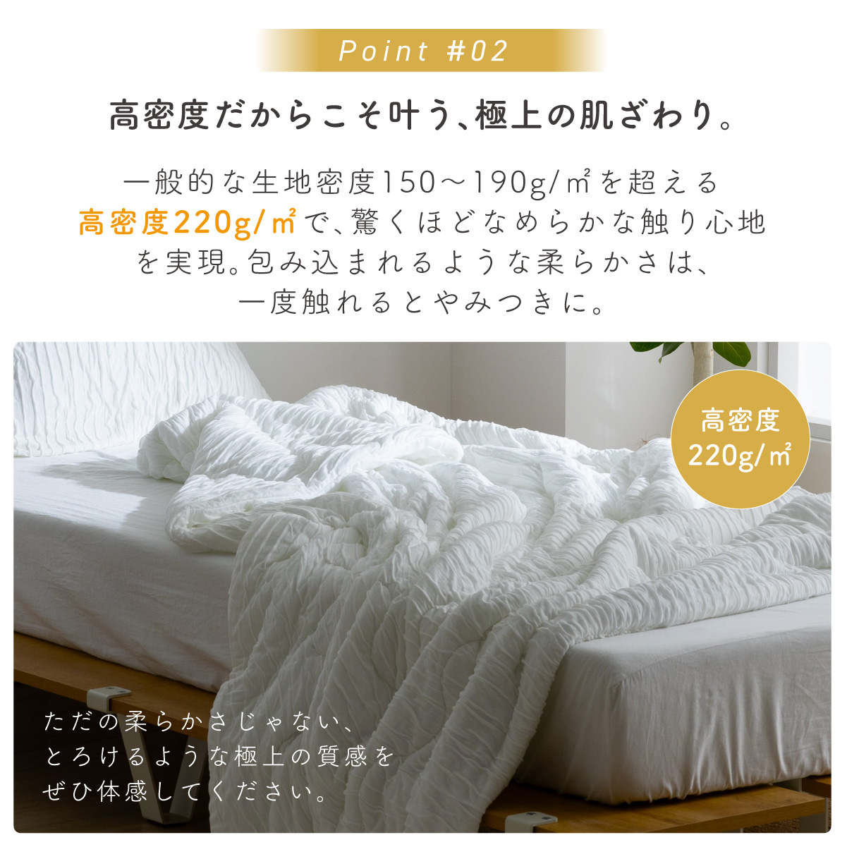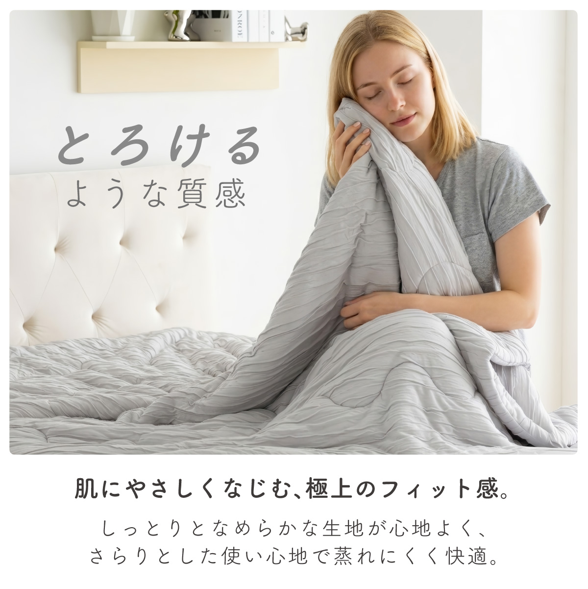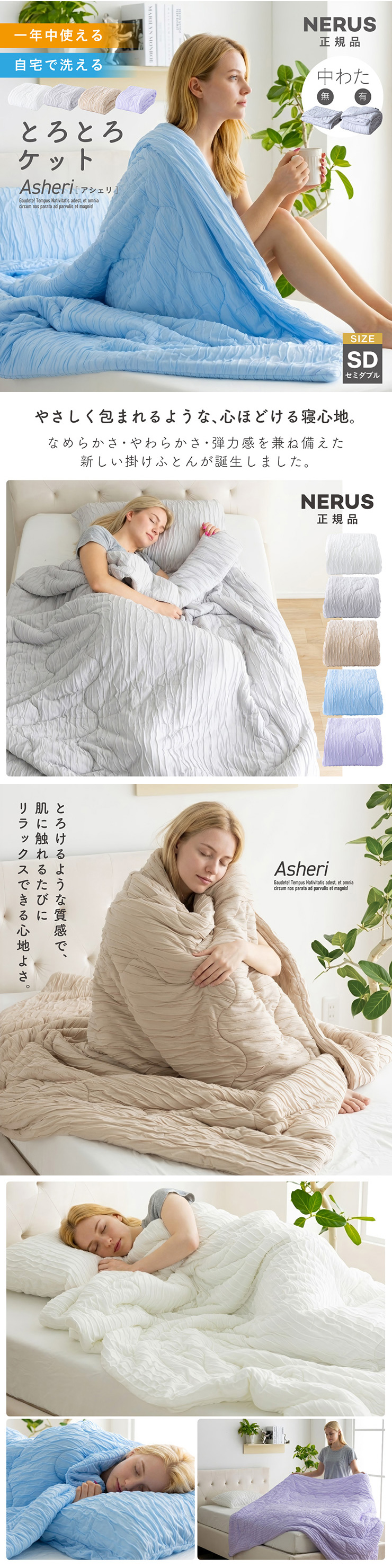 | 【NERUS正規品】一年中使える&自宅で洗える とろとろケット Asheri(アシェリ) セミダブルサイズ やさしく包まれるような、心ほどける寝心地。 なめらかさ・やわらかさ・弾力感を兼ね揃えた新しい掛けふとんが誕生しました。 とろけるような質感で、肌に触れるたびにリラックスできる心地よさ。 ■とろとろケットに、中わたを使わない新仕様 心地よいなめらかさはそのまま、中わたを省くことで、より軽く、さらに通気性のよい仕上がりに。 ■軽くて楽・ムレにくい・乾きやすい [通常との比較]中わた有りタイプと比べて、すっきりとした薄さで軽快に使えます。 ■とろけるケットの魅力 なめらかでやわらかく、心地よい肌ざわり ご家庭の洗濯機で丸洗いOK 季節を問わず使える快適設計で一年中使える ■とろけるような質感 肌にやさしくなじむ、極上のフィット感 しっとりとなめらかな生地が心地よく、さらりとした使い心地で蒸れにくく快適。 ■[Point1]このなめらかさの秘密はこだわりの"レーヨン素材" 独自に開発したレーヨン素材を使用。 天然由来の木材をベースにした繊維で、やさしい風合いと機能性を兼ね揃えています。 ■レーヨン素材の特長 ・シルクのような上品な光沢と軽やかさ ・優れた吸湿性と通気性で快適な使い心地 ・なめらかな肌あたりで季節を問わず活躍 ・静電気が起きにくく、ホコリがつきにくい しっとりとした質感と柔らかさで、肌に寄り添うようなやさしい寝心地を実現。 保湿性と通気性のバランスにも優れています。 ■NERUSオリジナル設計のレーヨン糸 一般的なレーヨンに比べて凹凸を抑えた設計により、なめらかでしっとりとしたやさしい肌ざわりを実現しました。 さらに耐久性にも配慮し、長く快適に使える仕上がりです。 ほどよい吸湿・放湿性があるため、湿気対策や乾燥対策にも。 ■[Point2]高密度だからこそ叶う、極上の肌ざわり。 一般的な生地密度150〜190g/㎡を超える高密度220g/㎡で、驚くほどなめらかな触り心地を実現。 包み込まれるような柔らかさは、一度触れるとやみつきに。 ■[Point3]寝返りしても、はだけにくい。とろとろケットのこだわり製法 寝返りをしてもはだけにくい理由は、NERUS独自のオリジナル製法にあります。 縦方向に施したシャーリングが身体の動きにやさしく沿い、快適なかけ心地と寝心地をキープします。 ■[Point4]ふんわり、羽毛のようなやさしい柔らかさ 中わたには、羽毛のようなやわらかさとあたたかさを兼ね備えた、NERUS独自開発の「NERUSもちもちわた」を使用しています。 動物性繊維を使用していないため、ホコリが出にくく、気になるニオイも抑えられます。 さらに洗濯できるので、清潔にお使いいただけます。 ■[Point5]もっちり、弾力のあるやさしい肌ざわり "とろけるレーヨン"と"NERUSもちもちわた"を組み合わせ、もっちりとした心地よい肌ざわりに。 なめらかな生地が肌にやさしくなじみ、さらっとした使い心地で、暑い季節も快適にお休みいただけます。 ■[Point6]オールシーズン、心地よく使える一枚 春夏秋はさらっと快適に、冬はほんのり暖かく。 季節を問わず、一年を通してお使いいただけます。 出し入れの手間が少ないので、収納の負担も軽減できます。 ※感じ方には個人差があり、室温や使用環境によって異なります。 ■[Point7]洗濯機で洗えるから、汗ばむ季節も気持ちよく使える ポリエステル綿を使用しているため、お手入れ簡単。 洗濯機で洗えるので、いつでも清潔。 お子さまのいるご家庭にも取り入れやすい一枚です。 ※お洗濯の際は洗濯ネットをご使用ください。 ■[Point8]布団カバーなしでも、心地よく使える ご家庭で丸洗いできるので、布団カバーなしでもそのままお使いいただけます。 もっちりとしあ肌ざわりを、ぜひ直接感じてください。 ■[Point9]収納袋付きで、持ち運びもスマート 専用の収納袋がセットになっているので、コンパクトにまとめてすっきり収納できます。 旅行や帰省、お泊まりの持ち運びにも便利です。 まるで雪に包まれるようなふんわりやさしい肌ざわり。 素肌がよろこぶ、ふわふわのぬくもりをぜひ実際に手に取ってご体感ください。 ※サイズ表記は生地寸であり、仕上がり寸ではございません。若干の誤差が生じる場合がございます。あらかじめご了承ください。 ※直射日光の当たる場所・高温多湿な場所・火気の近くでのご使用・保管は避け、風通しの良い場所でご使用ください。 ※商品の開封直後に、においが気になる場合は風通しの良い日陰でしばらく陰干ししてください。 ※湿ったまま放置するとカビの原因となりますのでご注意ください。 ※商品写真はできる限り実物の色に近づけておりますが、お使いのモニター環境、照明、製造ロット等により実際の商品と若干色味が異なる場合がございます。予めご了承ください。 ※計測方法や製造ロットによりサイズに誤差が生じる場合があります。 ※商品到着後すぐに開封し、商品に不具合等ないかご確認ください