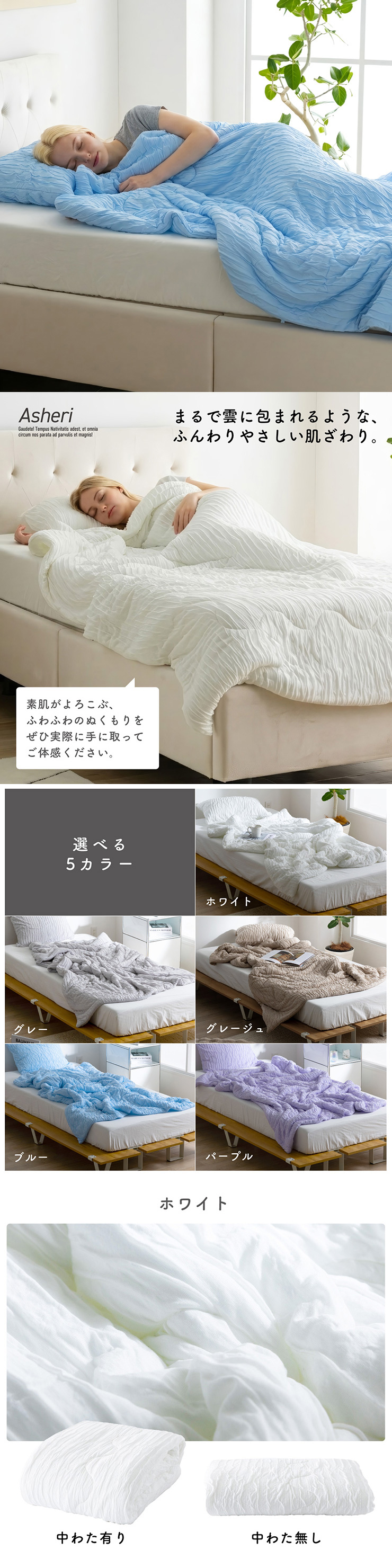 | バリエーション | タイプ:中わた有り・中わた無し カラー:ホワイト・グレー・グレージュ・ブルー・パープル |