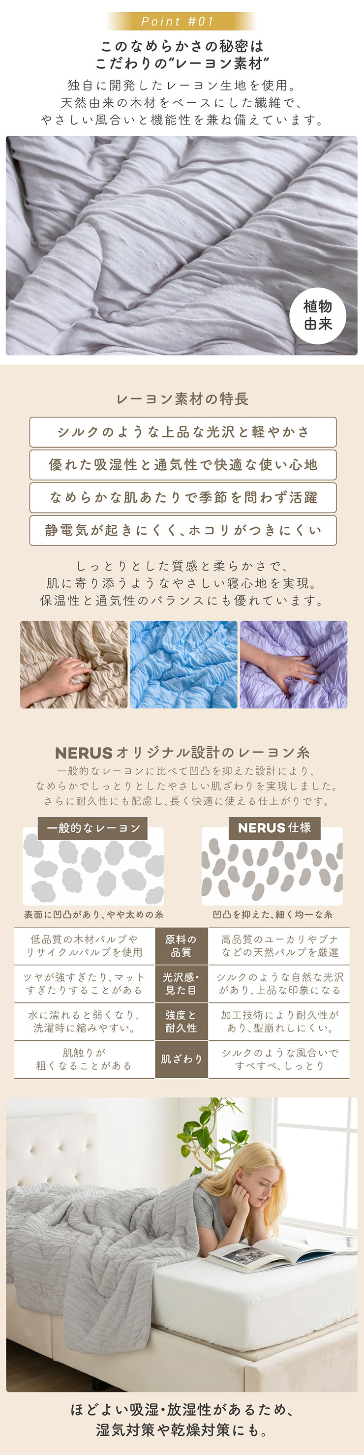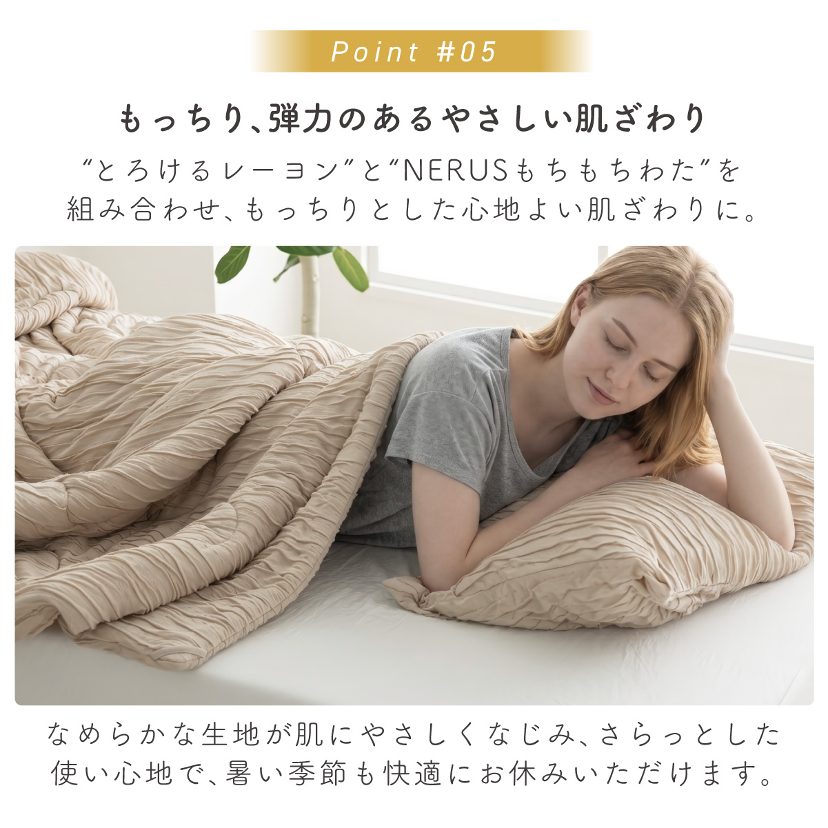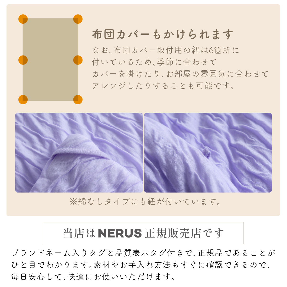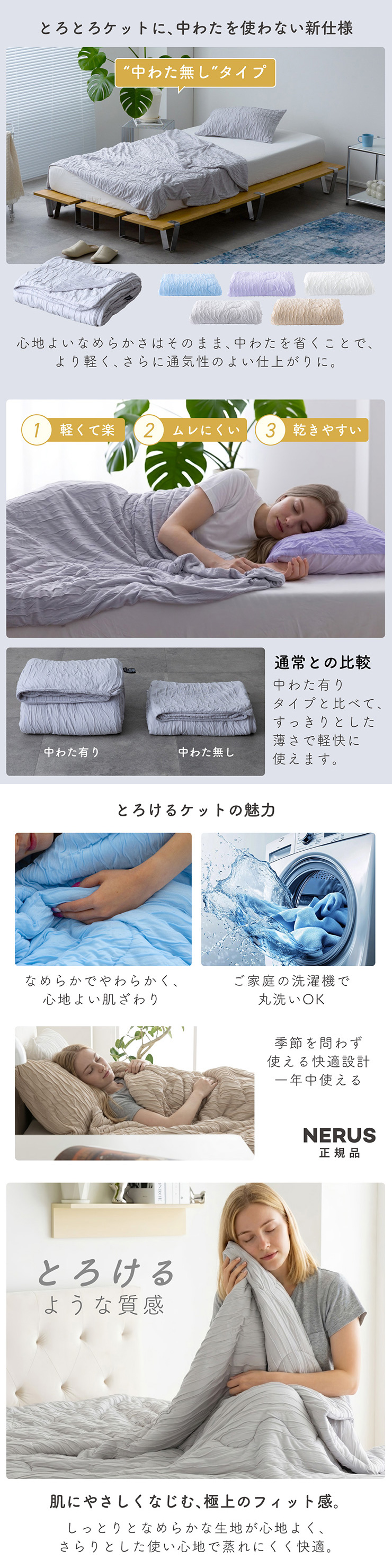 | 【NERUS正規品】一年中使える&自宅で洗える とろとろケット Asheri(アシェリ) ダブルサイズ やさしく包まれるような、心ほどける寝心地。 なめらかさ・やわらかさ・弾力感を兼ね揃えた新しい掛けふとんが誕生しました。 とろけるような質感で、肌に触れるたびにリラックスできる心地よさ。 ■とろとろケットに、中わたを使わない新仕様 心地よいなめらかさはそのまま、中わたを省くことで、より軽く、さらに通気性のよい仕上がりに。 ■軽くて楽・ムレにくい・乾きやすい [通常との比較]中わた有りタイプと比べて、すっきりとした薄さで軽快に使えます。 ■とろけるケットの魅力 なめらかでやわらかく、心地よい肌ざわり ご家庭の洗濯機で丸洗いOK 季節を問わず使える快適設計で一年中使える ■とろけるような質感 肌にやさしくなじむ、極上のフィット感 しっとりとなめらかな生地が心地よく、さらりとした使い心地で蒸れにくく快適。 ■[Point1]このなめらかさの秘密はこだわりの"レーヨン素材" 独自に開発したレーヨン素材を使用。 天然由来の木材をベースにした繊維で、やさしい風合いと機能性を兼ね揃えています。 ■レーヨン素材の特長 ・シルクのような上品な光沢と軽やかさ ・優れた吸湿性と通気性で快適な使い心地 ・なめらかな肌あたりで季節を問わず活躍 ・静電気が起きにくく、ホコリがつきにくい しっとりとした質感と柔らかさで、肌に寄り添うようなやさしい寝心地を実現。 保湿性と通気性のバランスにも優れています。 ■NERUSオリジナル設計のレーヨン糸 一般的なレーヨンに比べて凹凸を抑えた設計により、なめらかでしっとりとしたやさしい肌ざわりを実現しました。 さらに耐久性にも配慮し、長く快適に使える仕上がりです。 ほどよい吸湿・放湿性があるため、湿気対策や乾燥対策にも。 ■[Point2]高密度だからこそ叶う、極上の肌ざわり。 一般的な生地密度150〜190g/㎡を超える高密度220g/㎡で、驚くほどなめらかな触り心地を実現。 包み込まれるような柔らかさは、一度触れるとやみつきに。 ■[Point3]寝返りしても、はだけにくい。とろとろケットのこだわり製法 寝返りをしてもはだけにくい理由は、NERUS独自のオリジナル製法にあります。 縦方向に施したシャーリングが身体の動きにやさしく沿い、快適なかけ心地と寝心地をキープします。 ■[Point4]ふんわり、羽毛のようなやさしい柔らかさ 中わたには、羽毛のようなやわらかさとあたたかさを兼ね備えた、NERUS独自開発の「NERUSもちもちわた」を使用しています。 動物性繊維を使用していないため、ホコリが出にくく、気になるニオイも抑えられます。 さらに洗濯できるので、清潔にお使いいただけます。 ■[Point5]もっちり、弾力のあるやさしい肌ざわり "とろけるレーヨン"と"NERUSもちもちわた"を組み合わせ、もっちりとした心地よい肌ざわりに。 なめらかな生地が肌にやさしくなじみ、さらっとした使い心地で、暑い季節も快適にお休みいただけます。 ■[Point6]オールシーズン、心地よく使える一枚 春夏秋はさらっと快適に、冬はほんのり暖かく。 季節を問わず、一年を通してお使いいただけます。 出し入れの手間が少ないので、収納の負担も軽減できます。 ※感じ方には個人差があり、室温や使用環境によって異なります。 ■[Point7]洗濯機で洗えるから、汗ばむ季節も気持ちよく使える ポリエステル綿を使用しているため、お手入れ簡単。 洗濯機で洗えるので、いつでも清潔。 お子さまのいるご家庭にも取り入れやすい一枚です。 ※お洗濯の際は洗濯ネットをご使用ください。 ■[Point8]布団カバーなしでも、心地よく使える ご家庭で丸洗いできるので、布団カバーなしでもそのままお使いいただけます。 もっちりとしあ肌ざわりを、ぜひ直接感じてください。 ■[Point9]収納袋付きで、持ち運びもスマート 専用の収納袋がセットになっているので、コンパクトにまとめてすっきり収納できます。 旅行や帰省、お泊まりの持ち運びにも便利です。 まるで雪に包まれるようなふんわりやさしい肌ざわり。 素肌がよろこぶ、ふわふわのぬくもりをぜひ実際に手に取ってご体感ください。 ※サイズ表記は生地寸であり、仕上がり寸ではございません。若干の誤差が生じる場合がございます。あらかじめご了承ください。 ※直射日光の当たる場所・高温多湿な場所・火気の近くでのご使用・保管は避け、風通しの良い場所でご使用ください。 ※商品の開封直後に、においが気になる場合は風通しの良い日陰でしばらく陰干ししてください。 ※湿ったまま放置するとカビの原因となりますのでご注意ください。 ※商品写真はできる限り実物の色に近づけておりますが、お使いのモニター環境、照明、製造ロット等により実際の商品と若干色味が異なる場合がございます。予めご了承ください。 ※計測方法や製造ロットによりサイズに誤差が生じる場合があります。 ※商品到着後すぐに開封し、商品に不具合等ないかご確認ください。 ※