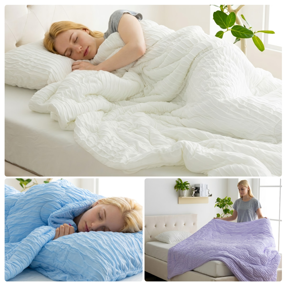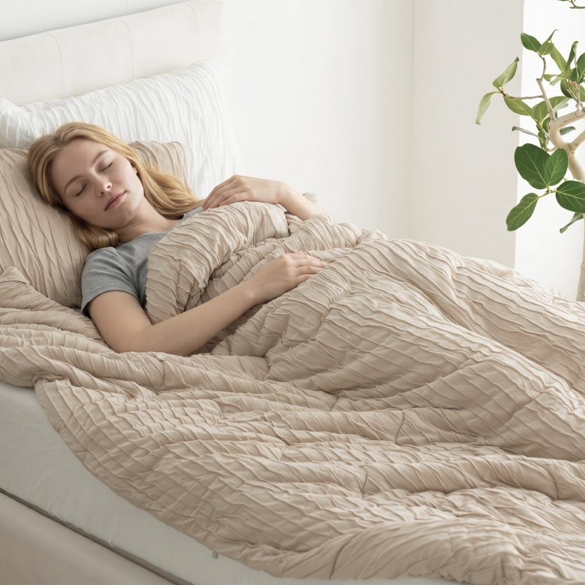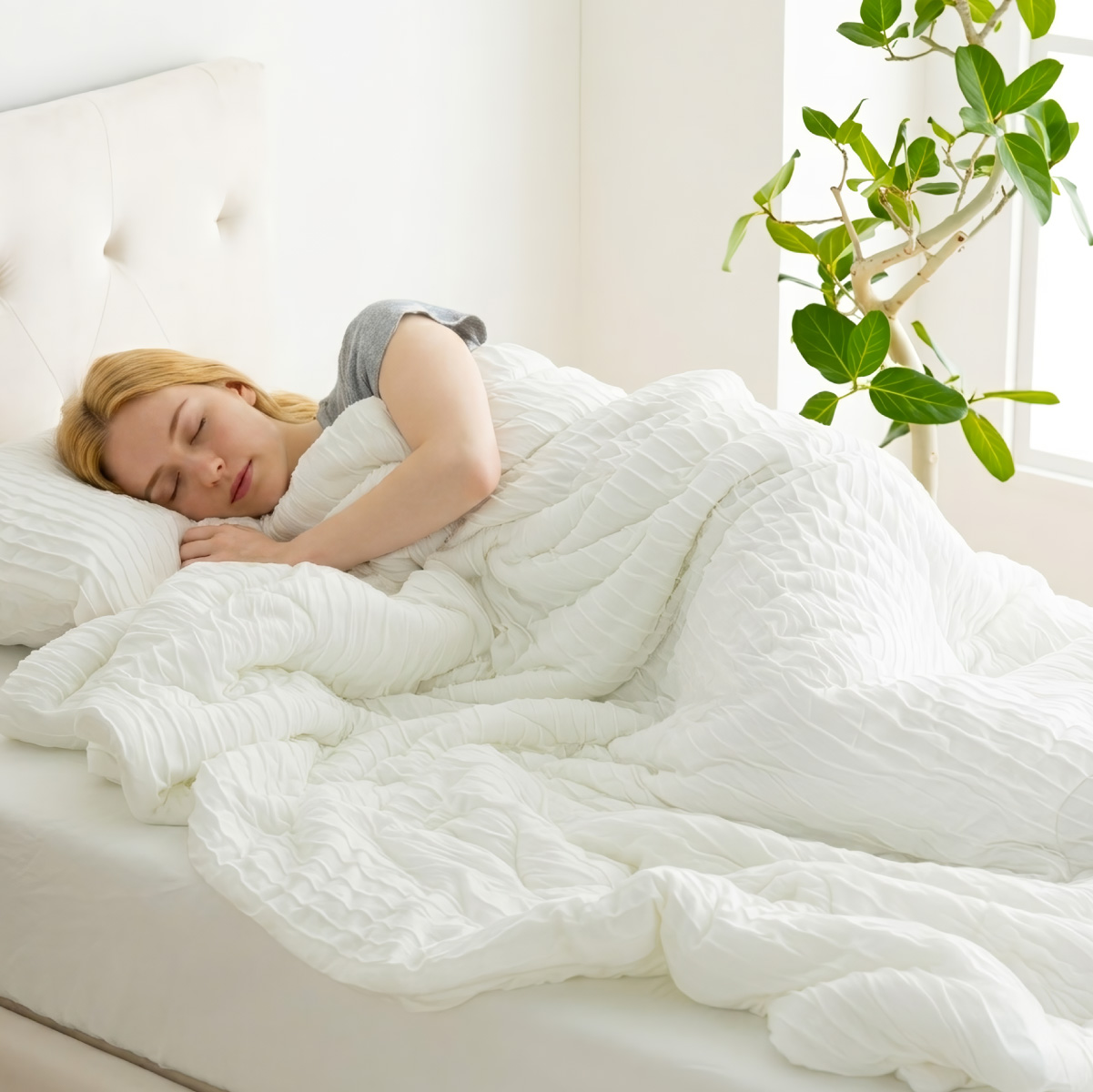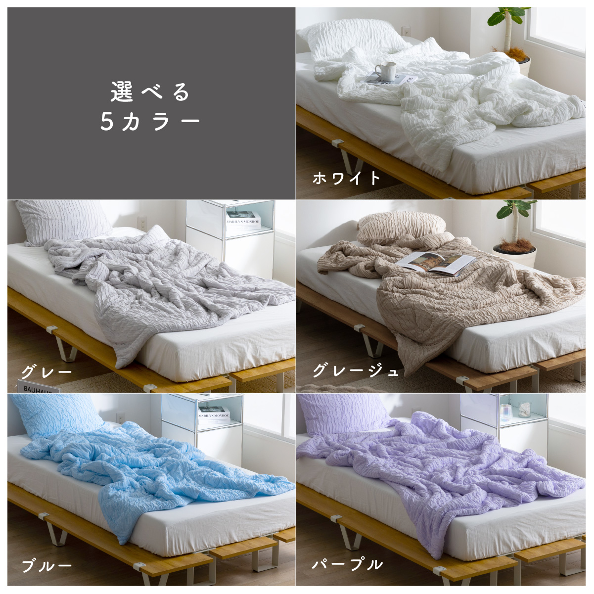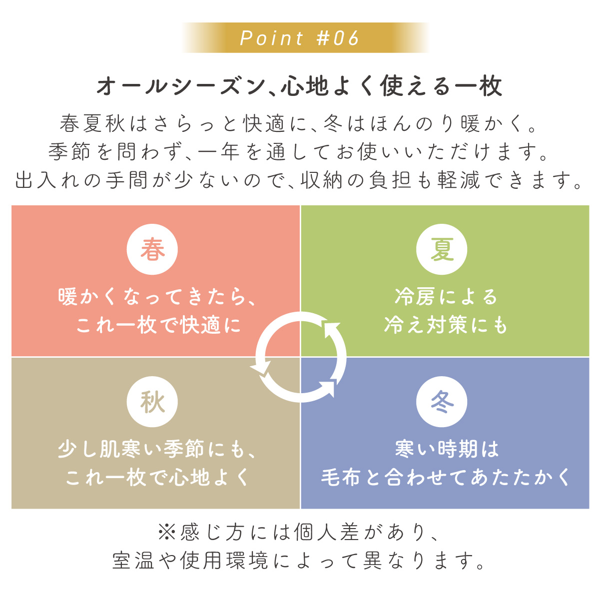 | 【NERUS正規品】一年中使える&自宅で洗える とろとろケット Asheri(アシェリ) ダブルサイズ やさしく包まれるような、心ほどける寝心地。 なめらかさ・やわらかさ・弾力感を兼ね揃えた新しい掛けふとんが誕生しました。 とろけるような質感で、肌に触れるたびにリラックスできる心地よさ。 ■とろとろケットに、中わたを使わない新仕様 心地よいなめらかさはそのまま、中わたを省くことで、より軽く、さらに通気性のよい仕上がりに。 ■軽くて楽・ムレにくい・乾きやすい [通常との比較]中わた有りタイプと比べて、すっきりとした薄さで軽快に使えます。 ■とろけるケットの魅力 なめらかでやわらかく、心地よい肌ざわり ご家庭の洗濯機で丸洗いOK 季節を問わず使える快適設計で一年中使える ■とろけるような質感 肌にやさしくなじむ、極上のフィット感 しっとりとなめらかな生地が心地よく、さらりとした使い心地で蒸れにくく快適。 ■[Point1]このなめらかさの秘密はこだわりの"レーヨン素材" 独自に開発したレーヨン素材を使用。 天然由来の木材をベースにした繊維で、やさしい風合いと機能性を兼ね揃えています。 ■レーヨン素材の特長 ・シルクのような上品な光沢と軽やかさ ・優れた吸湿性と通気性で快適な使い心地 ・なめらかな肌あたりで季節を問わず活躍 ・静電気が起きにくく、ホコリがつきにくい しっとりとした質感と柔らかさで、肌に寄り添うようなやさしい寝心地を実現。 保湿性と通気性のバランスにも優れています。 ■NERUSオリジナル設計のレーヨン糸 一般的なレーヨンに比べて凹凸を抑えた設計により、なめらかでしっとりとしたやさしい肌ざわりを実現しました。 さらに耐久性にも配慮し、長く快適に使える仕上がりです。 ほどよい吸湿・放湿性があるため、湿気対策や乾燥対策にも。 ■[Point2]高密度だからこそ叶う、極上の肌ざわり。 一般的な生地密度150〜190g/㎡を超える高密度220g/㎡で、驚くほどなめらかな触り心地を実現。 包み込まれるような柔らかさは、一度触れるとやみつきに。 ■[Point3]寝返りしても、はだけにくい。とろとろケットのこだわり製法 寝返りをしてもはだけにくい理由は、NERUS独自のオリジナル製法にあります。 縦方向に施したシャーリングが身体の動きにやさしく沿い、快適なかけ心地と寝心地をキープします。 ■[Point4]ふんわり、羽毛のようなやさしい柔らかさ 中わたには、羽毛のようなやわらかさとあたたかさを兼ね備えた、NERUS独自開発の「NERUSもちもちわた」を使用しています。 動物性繊維を使用していないため、ホコリが出にくく、気になるニオイも抑えられます。 さらに洗濯できるので、清潔にお使いいただけます。 ■[Point5]もっちり、弾力のあるやさしい肌ざわり "とろけるレーヨン"と"NERUSもちもちわた"を組み合わせ、もっちりとした心地よい肌ざわりに。 なめらかな生地が肌にやさしくなじみ、さらっとした使い心地で、暑い季節も快適にお休みいただけます。 ■[Point6]オールシーズン、心地よく使える一枚 春夏秋はさらっと快適に、冬はほんのり暖かく。 季節を問わず、一年を通してお使いいただけます。 出し入れの手間が少ないので、収納の負担も軽減できます。 ※感じ方には個人差があり、室温や使用環境によって異なります。 ■[Point7]洗濯機で洗えるから、汗ばむ季節も気持ちよく使える ポリエステル綿を使用しているため、お手入れ簡単。 洗濯機で洗えるので、いつでも清潔。 お子さまのいるご家庭にも取り入れやすい一枚です。 ※お洗濯の際は洗濯ネットをご使用ください。 ■[Point8]布団カバーなしでも、心地よく使える ご家庭で丸洗いできるので、布団カバーなしでもそのままお使いいただけます。 もっちりとしあ肌ざわりを、ぜひ直接感じてください。 ■[Point9]収納袋付きで、持ち運びもスマート 専用の収納袋がセットになっているので、コンパクトにまとめてすっきり収納できます。 旅行や帰省、お泊まりの持ち運びにも便利です。 まるで雪に包まれるようなふんわりやさしい肌ざわり。 素肌がよろこぶ、ふわふわのぬくもりをぜひ実際に手に取ってご体感ください。 ※サイズ表記は生地寸であり、仕上がり寸ではございません。若干の誤差が生じる場合がございます。あらかじめご了承ください。 ※直射日光の当たる場所・高温多湿な場所・火気の近くでのご使用・保管は避け、風通しの良い場所でご使用ください。 ※商品の開封直後に、においが気になる場合は風通しの良い日陰でしばらく陰干ししてください。 ※湿ったまま放置するとカビの原因となりますのでご注意ください。 ※商品写真はできる限り実物の色に近づけておりますが、お使いのモニター環境、照明、製造ロット等により実際の商品と若干色味が異なる場合がございます。予めご了承ください。 ※計測方法や製造ロットによりサイズに誤差が生じる場合があります。 ※商品到着後すぐに開封し、商品に不具合等ないかご確認ください。 ※